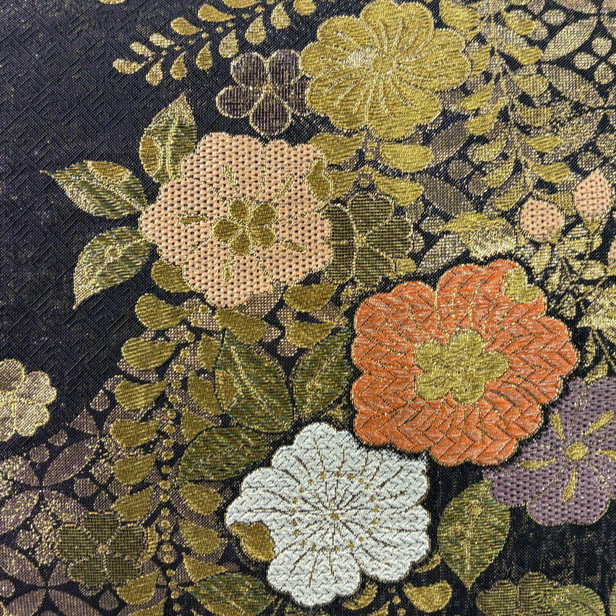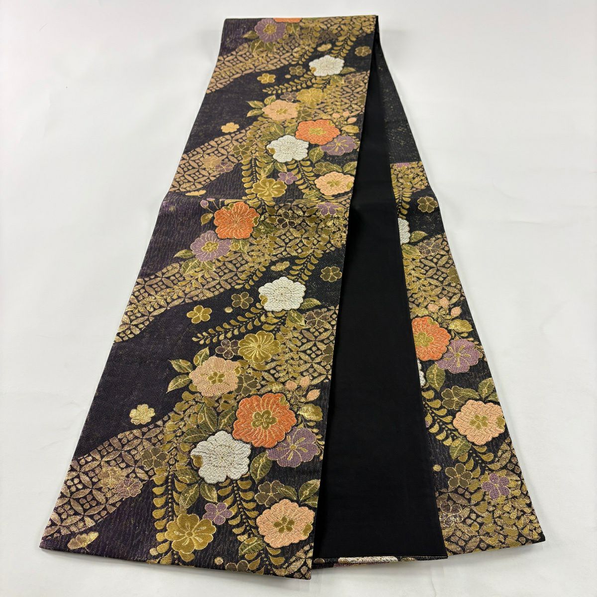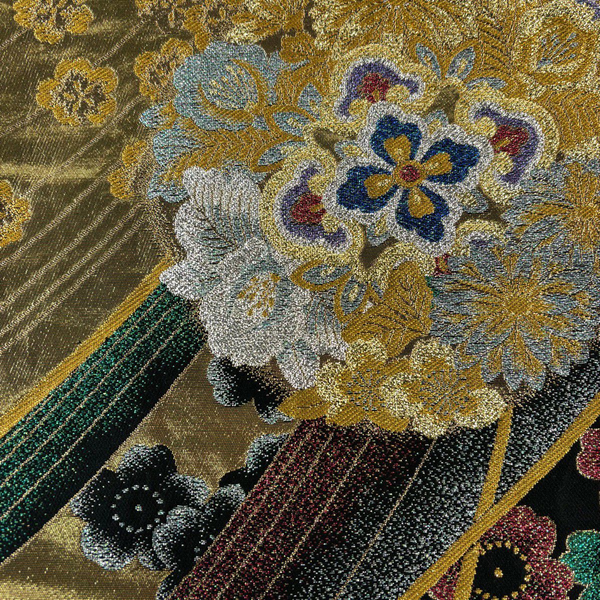 【美品】 袋帯 秀品 振袖向き 華文 草花 金糸 箔 黒 六通 正絹