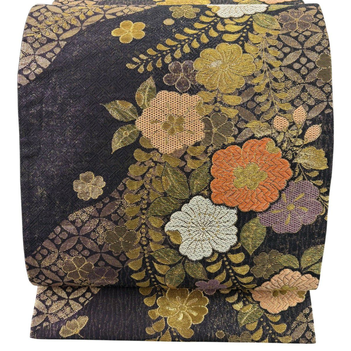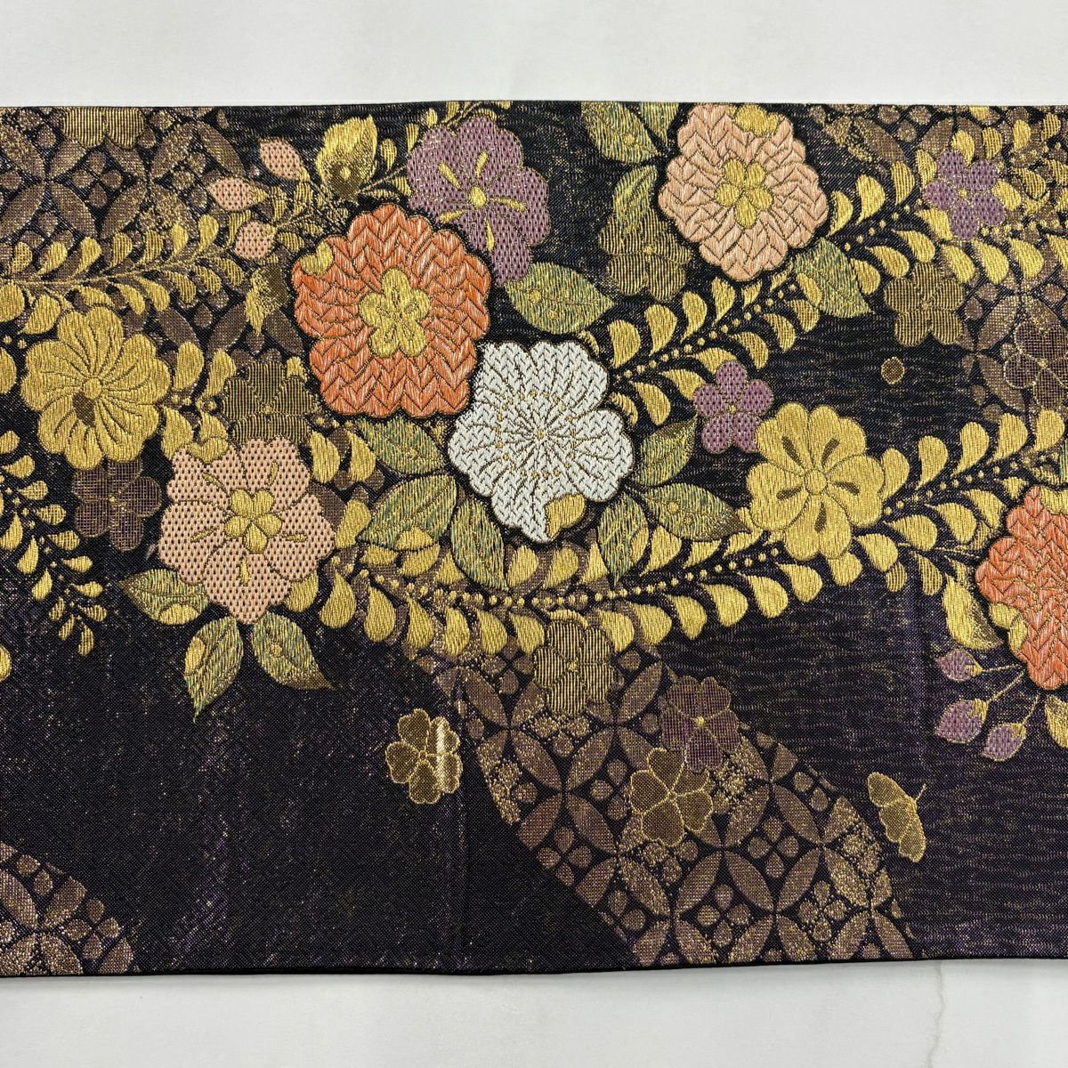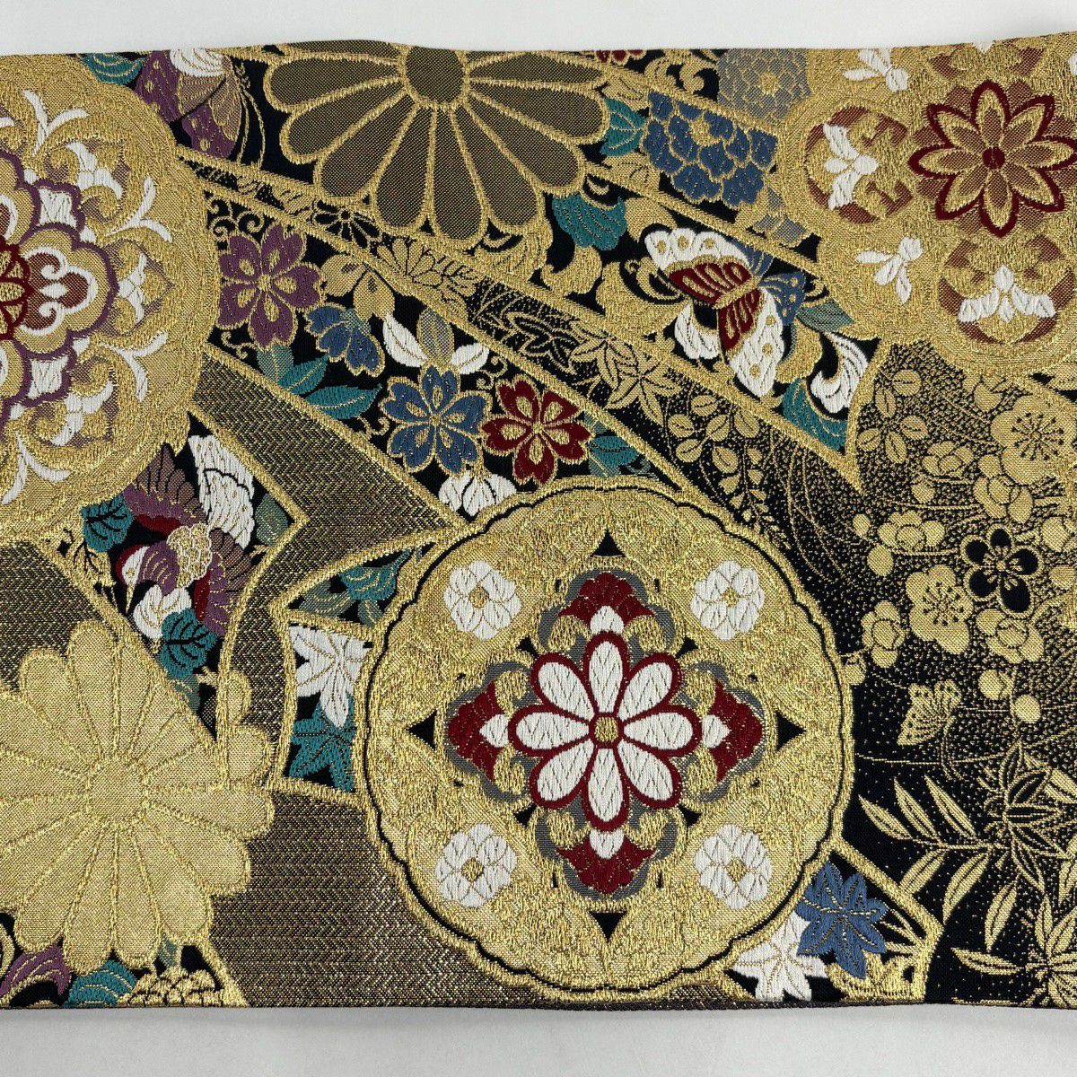 【美品】 袋帯 秀品 振袖向き 華文 草花 金糸 箔 黒 六通 正絹