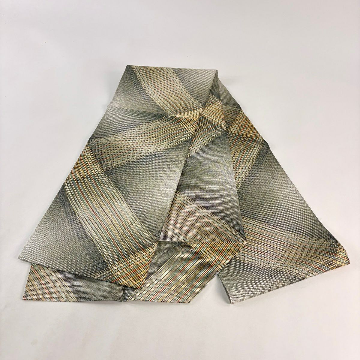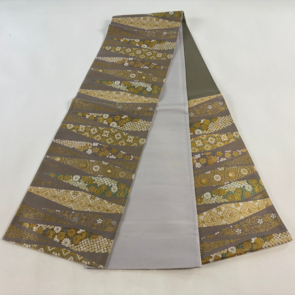 【美品】 名古屋帯 秀品 八寸名古屋帯 松葉仕立て 斜縞 金糸 灰緑 正絹