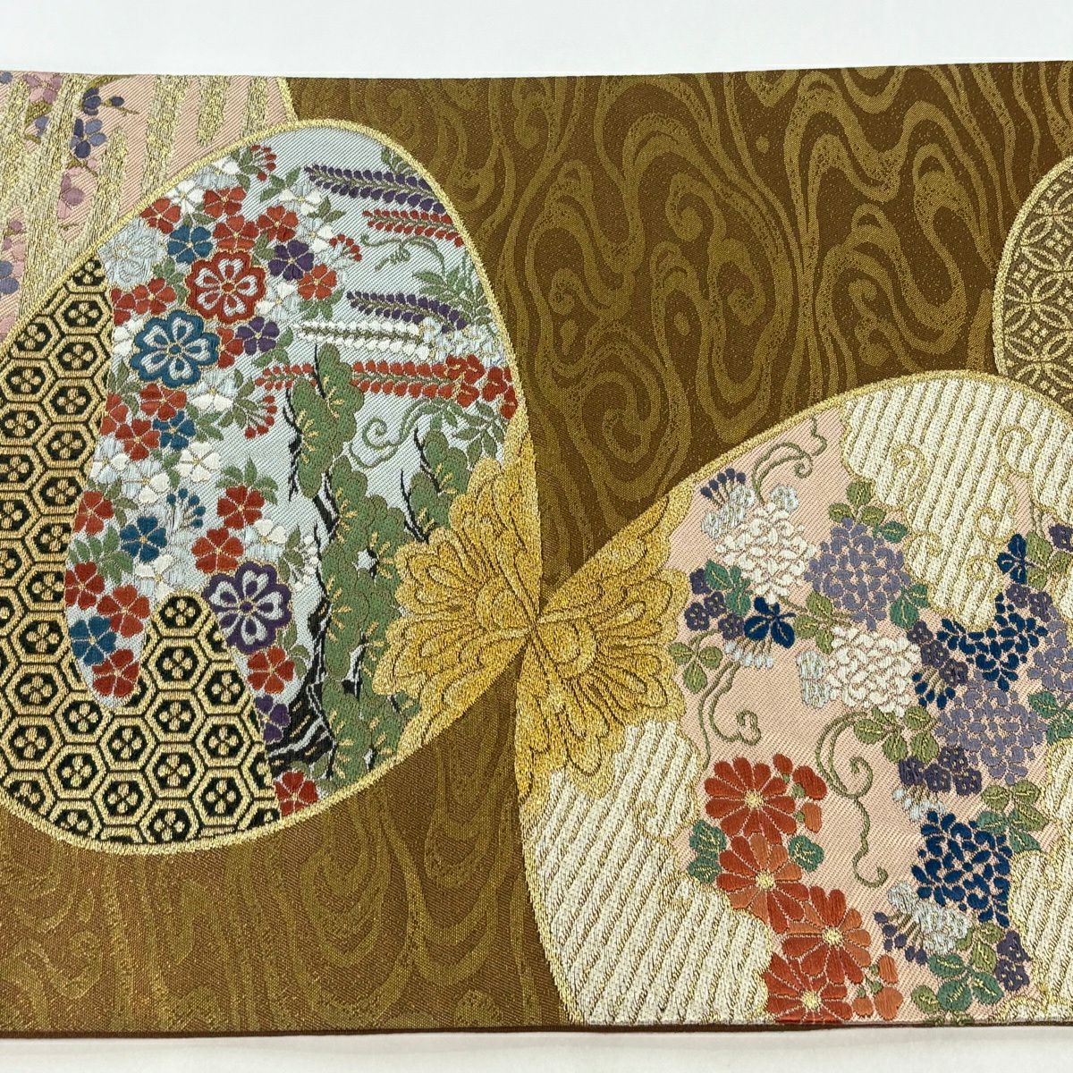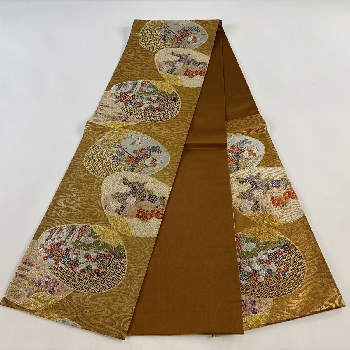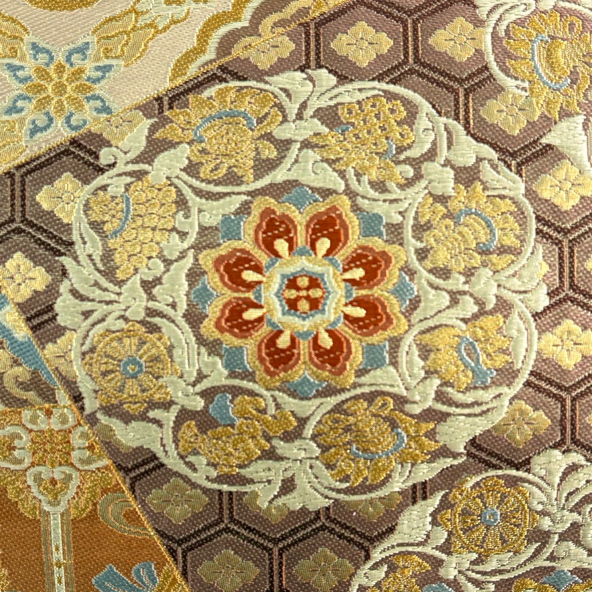 【美品】 袋帯 秀品 春秋貝合せ 亀甲 金糸 箔 黄土色 六通 正絹