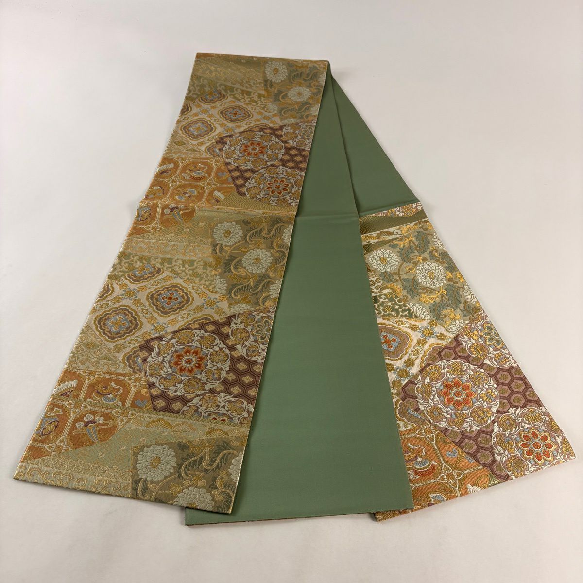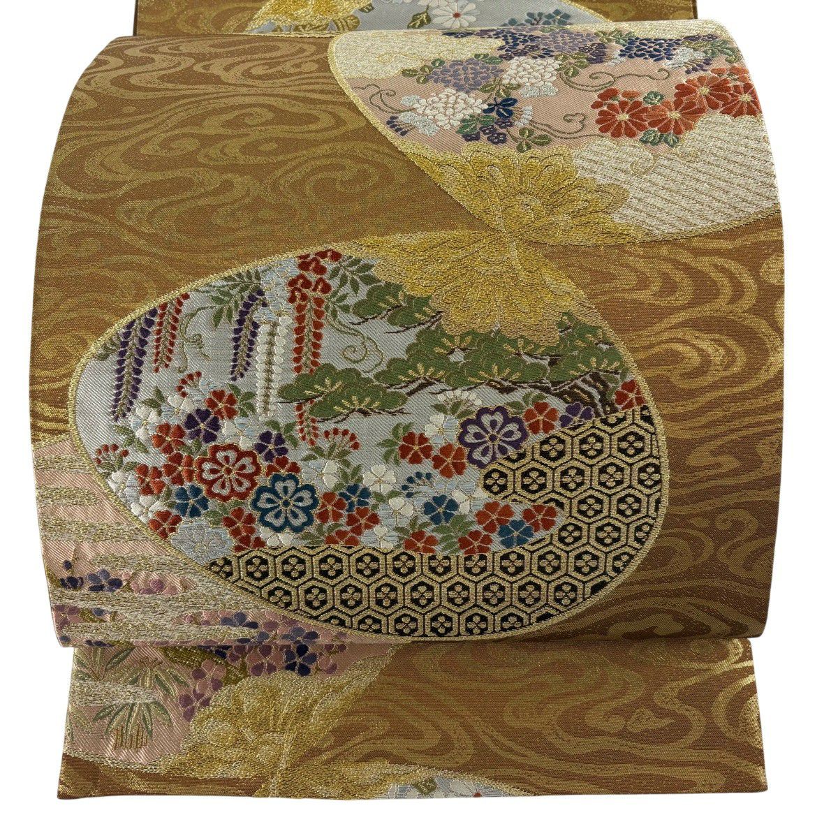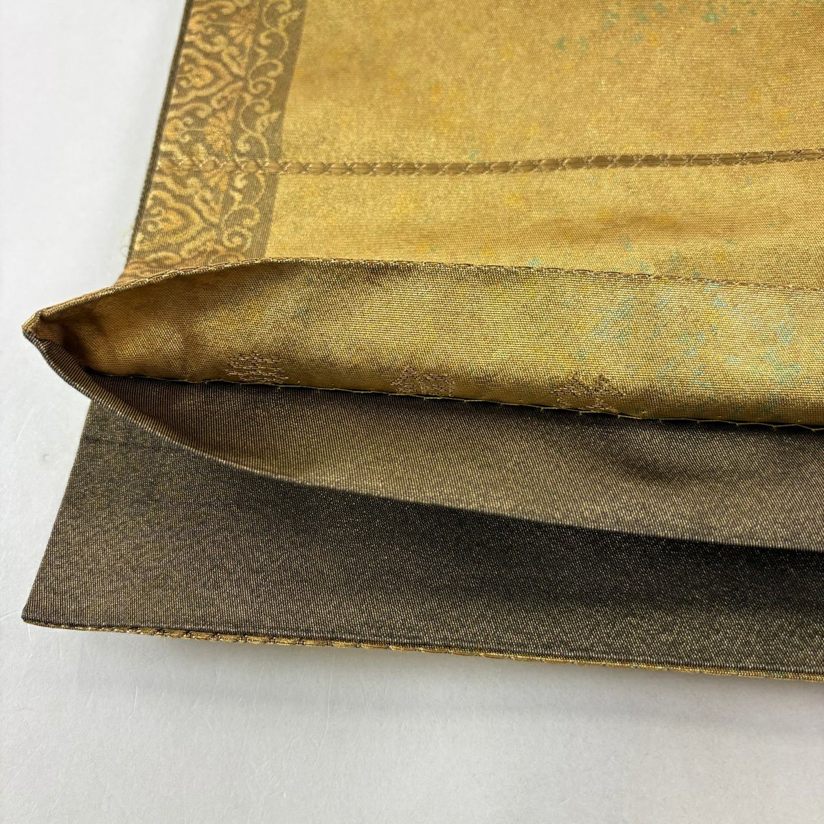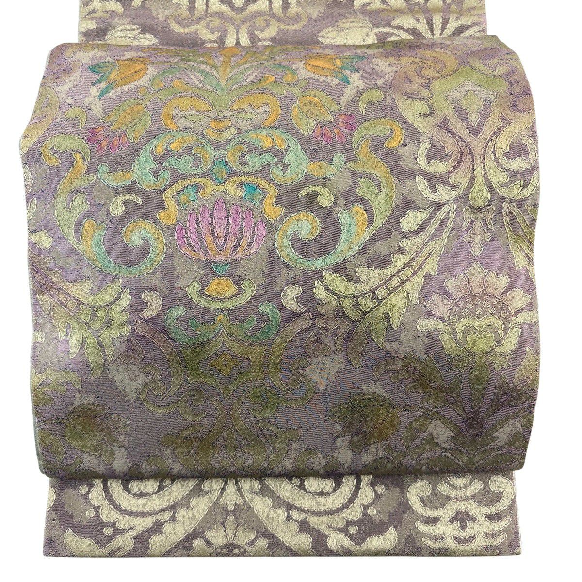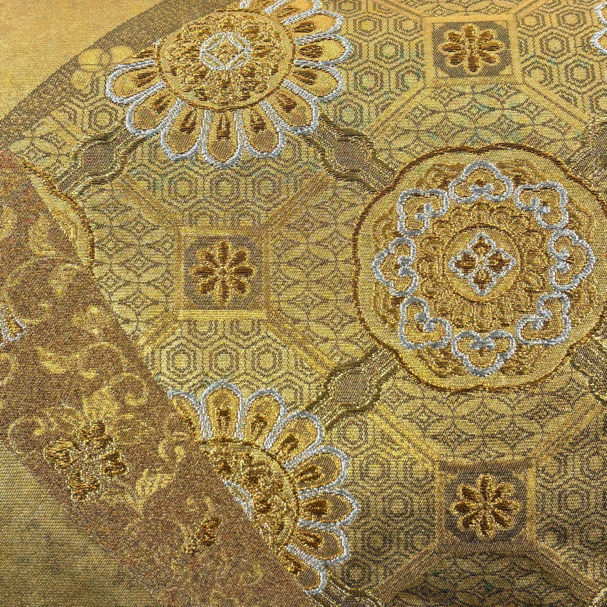 【美品】 袋帯 秀品 蜀江華文 草花 青銅箔 金銀糸 金色 六通 正絹