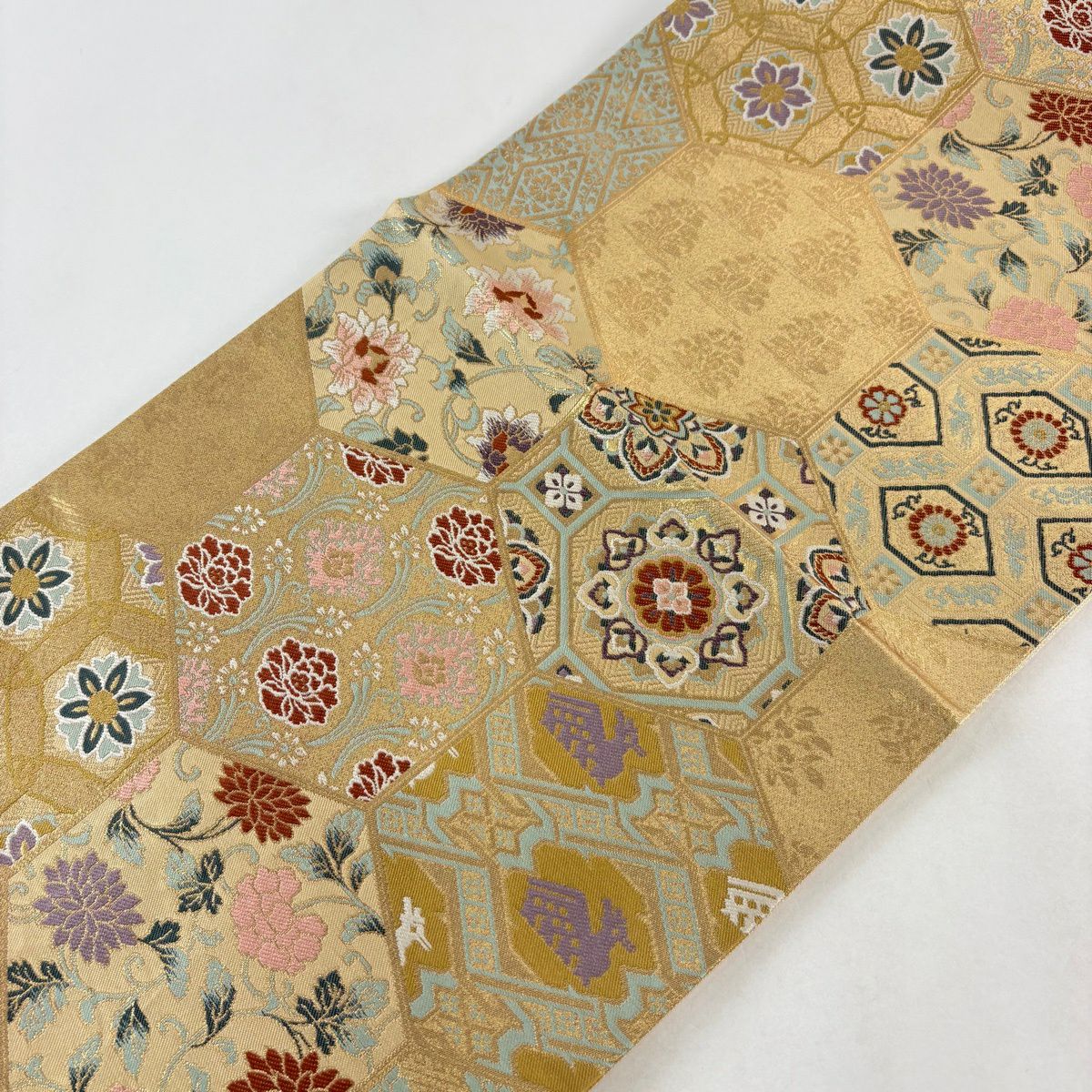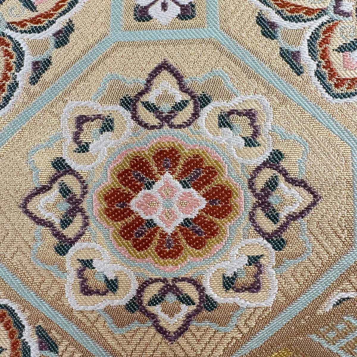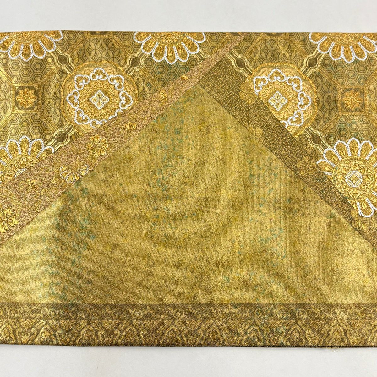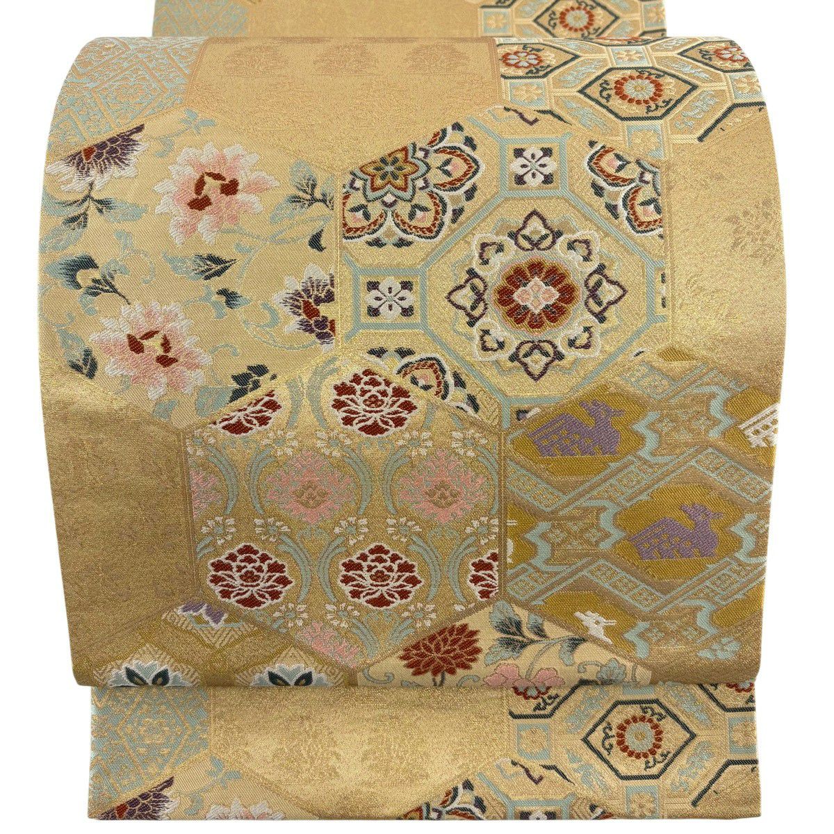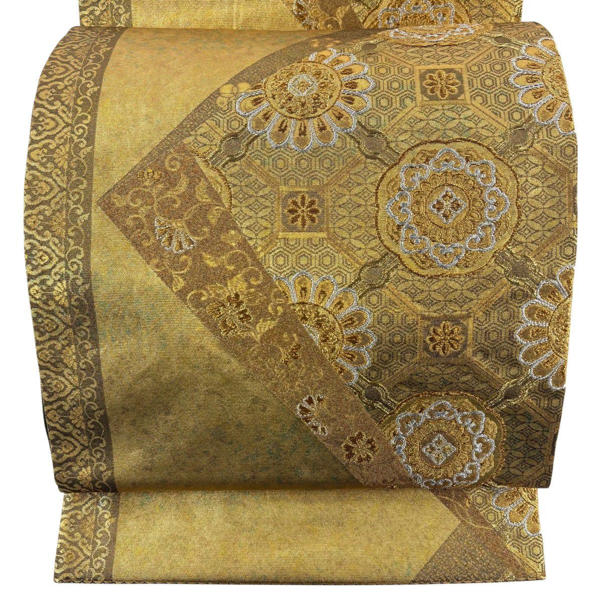 【美品】 袋帯 秀品 蜀江華文 草花 青銅箔 金銀糸 金色 六通 正絹