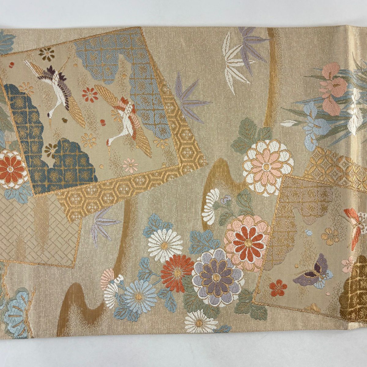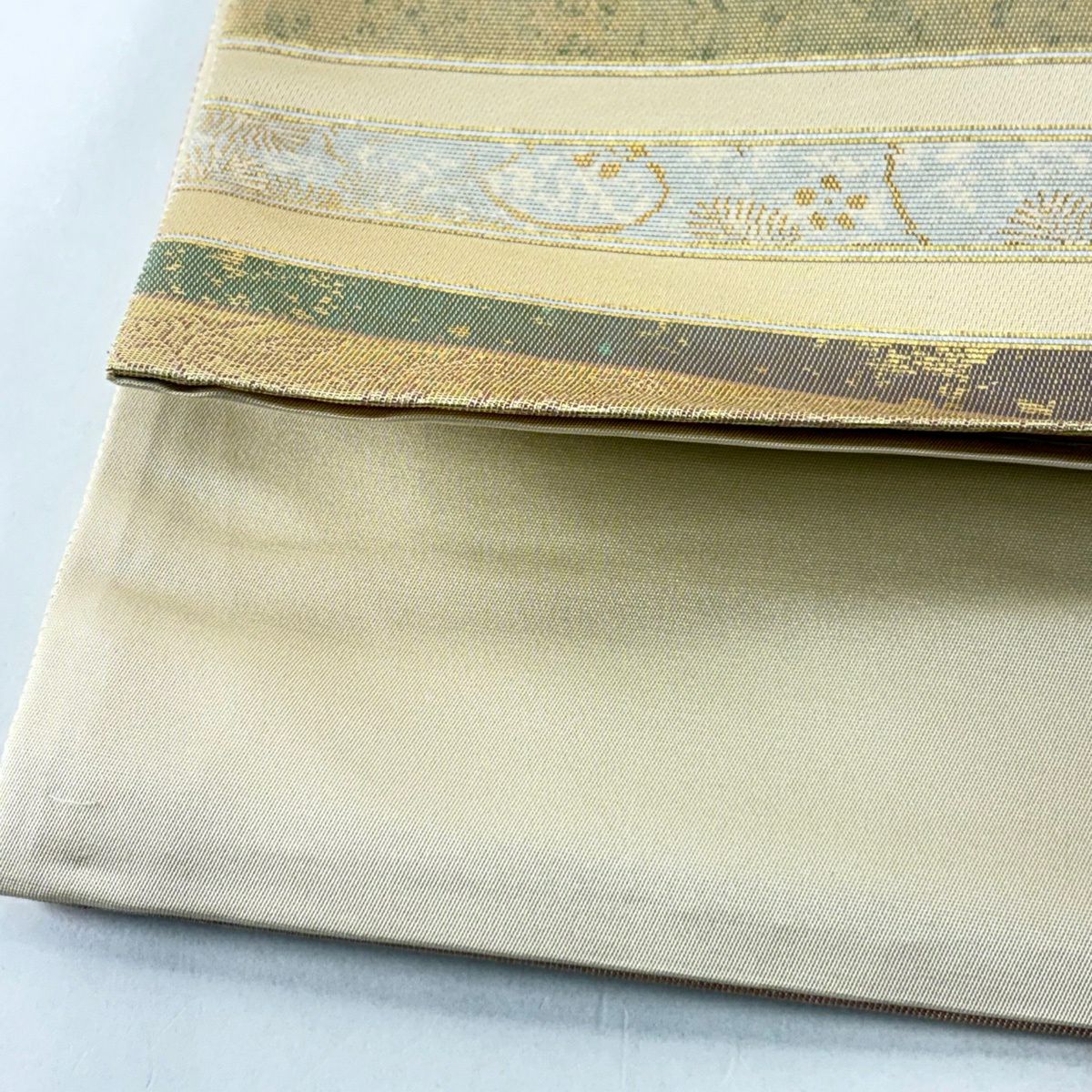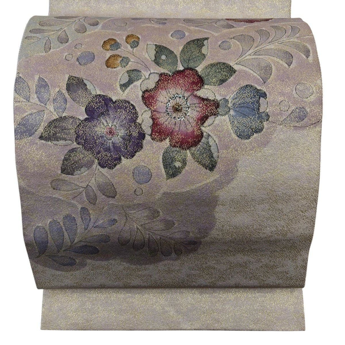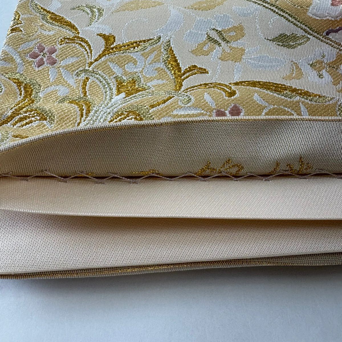 【美品】 袋帯 秀品 色紙 草花 金糸 箔 ベージュ 六通 正絹