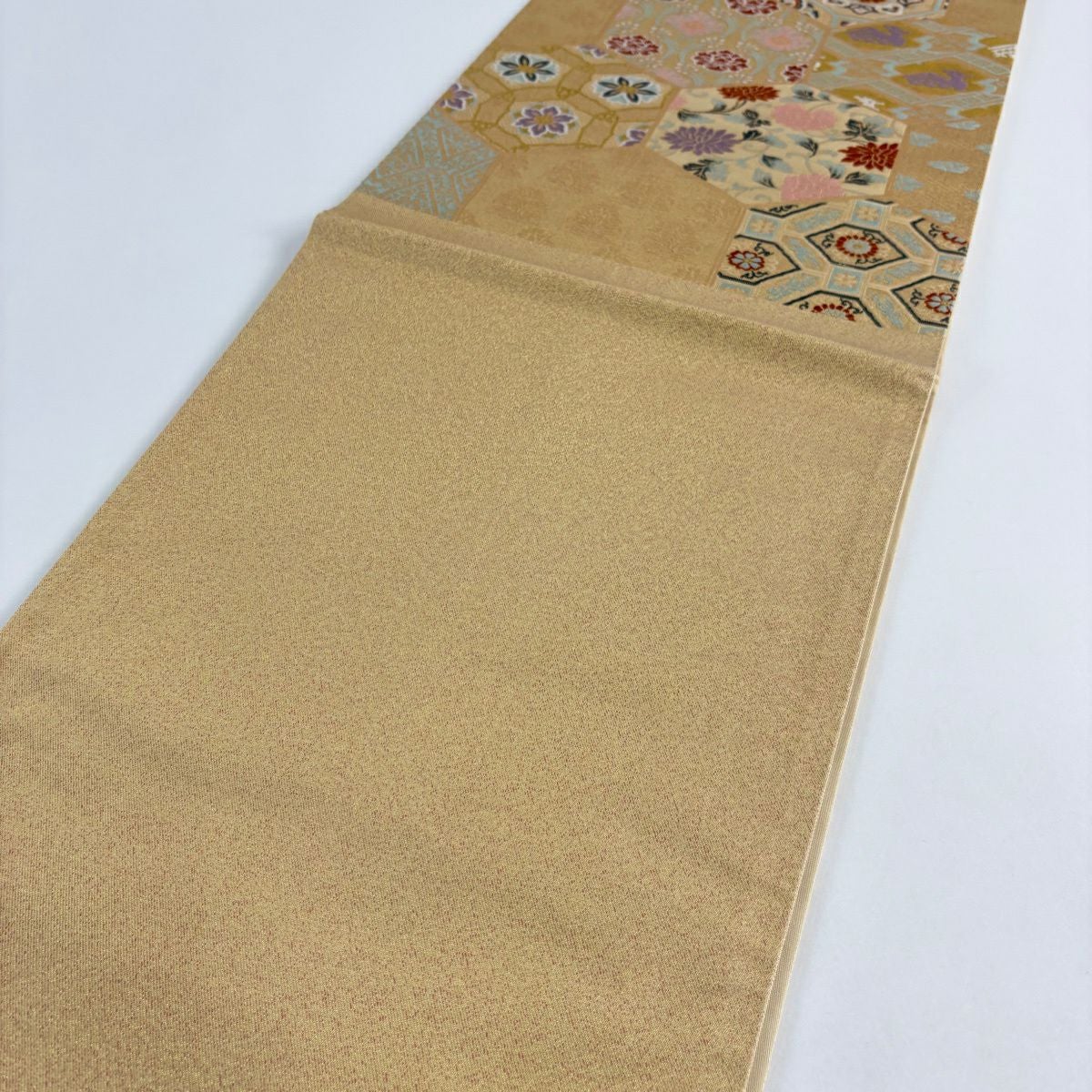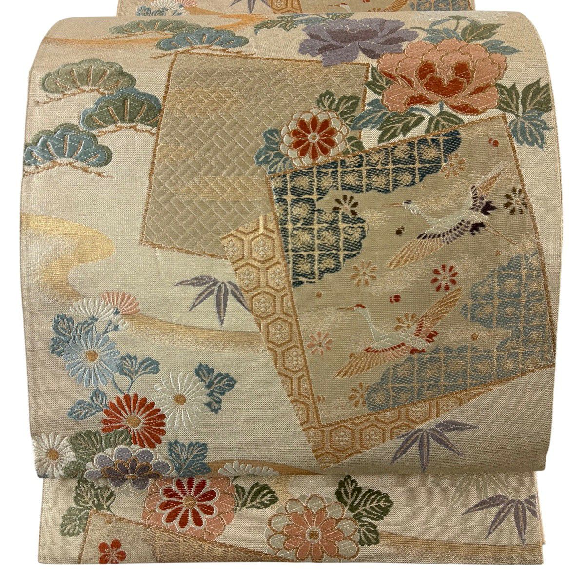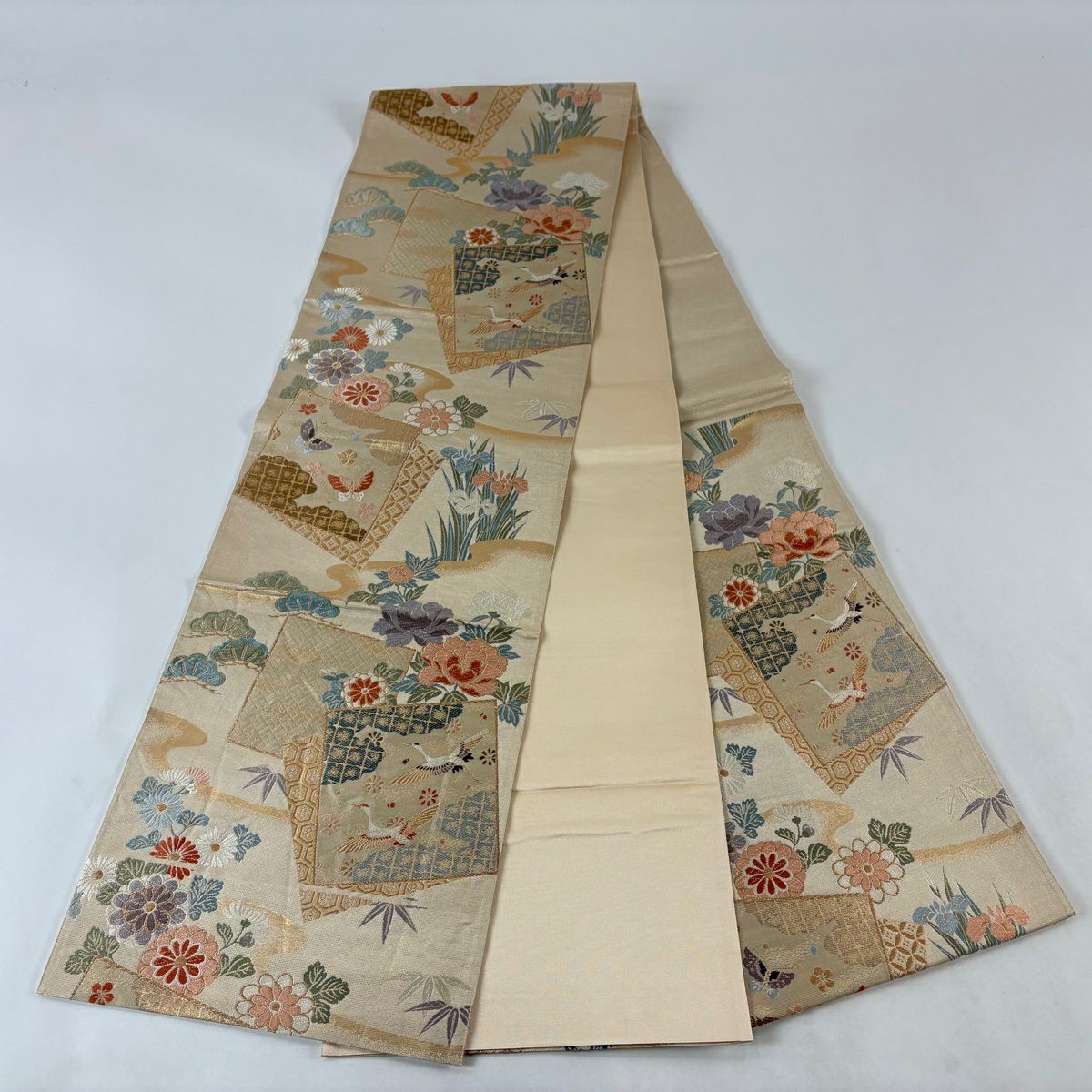 【美品】 袋帯 秀品 色紙 草花 金糸 箔 ベージュ 六通 正絹