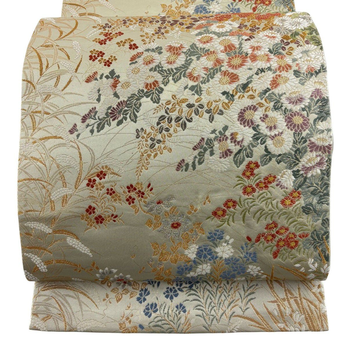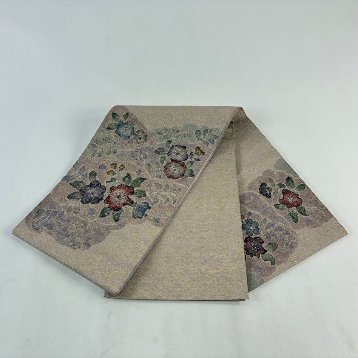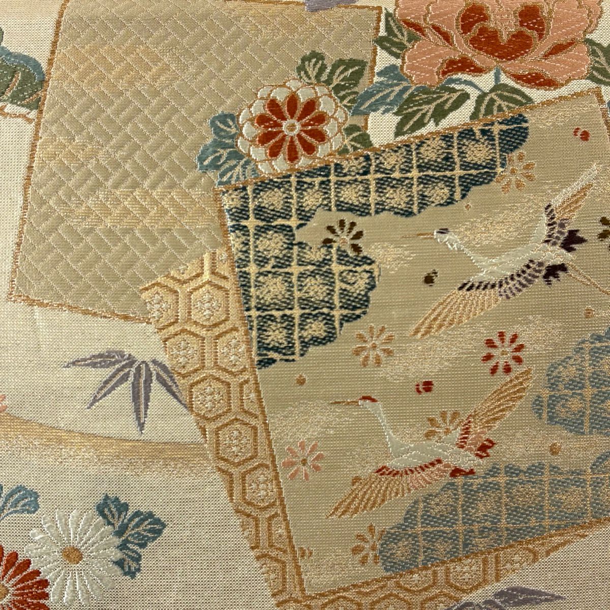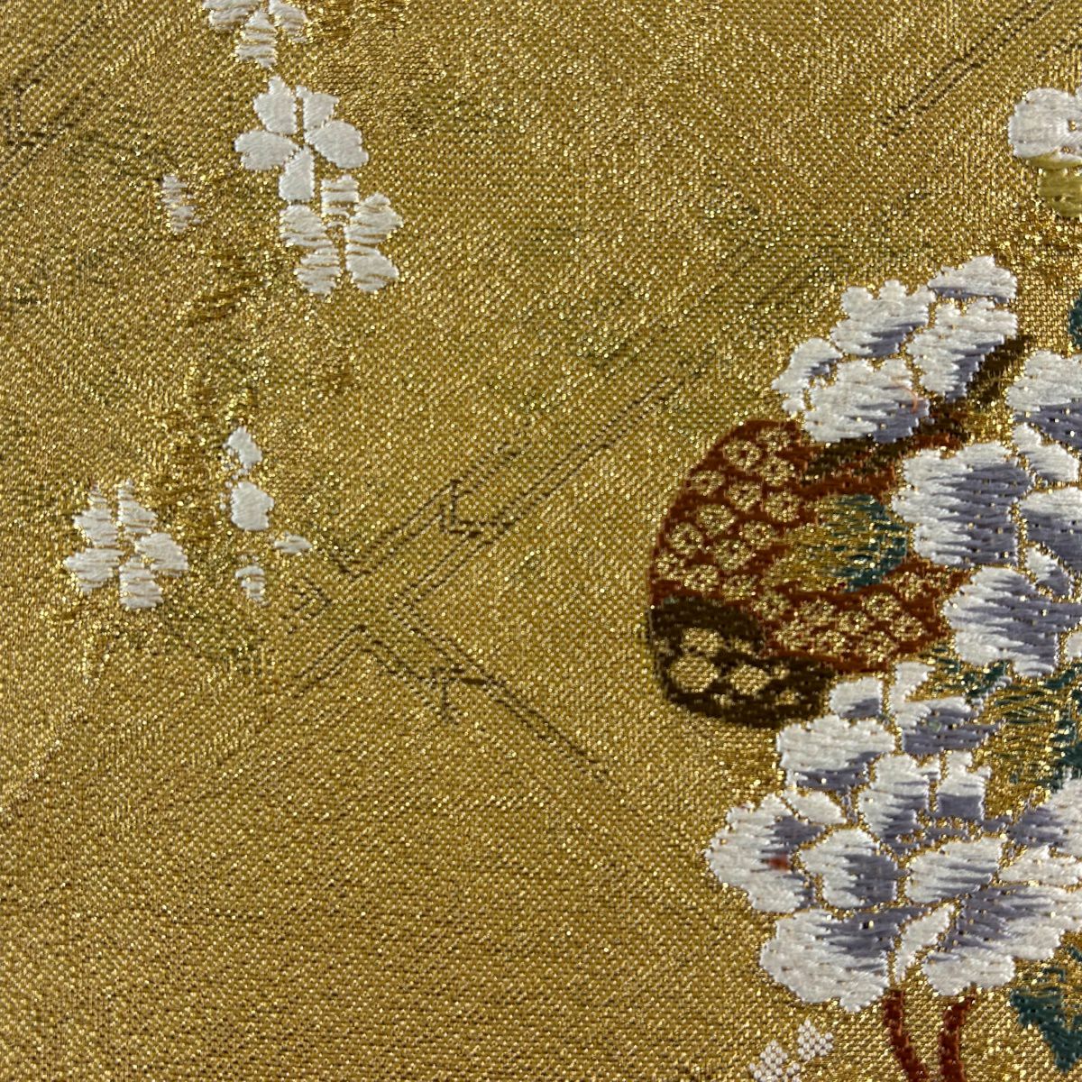【美品】 袋帯 秀品 色紙 草花 金糸 箔 ベージュ 六通 正絹