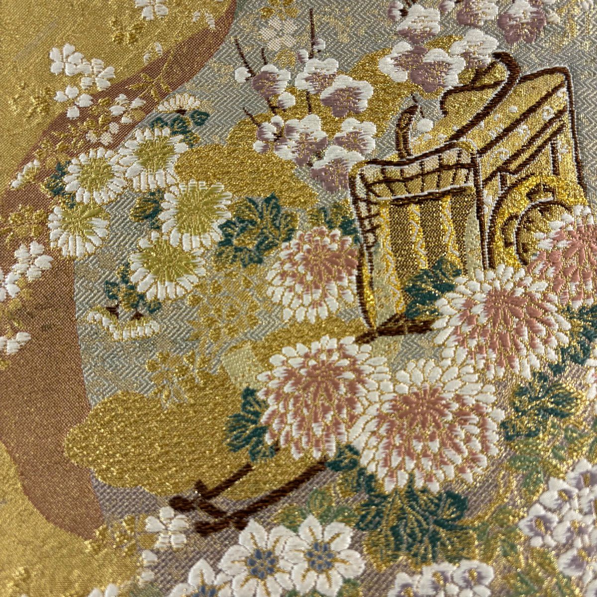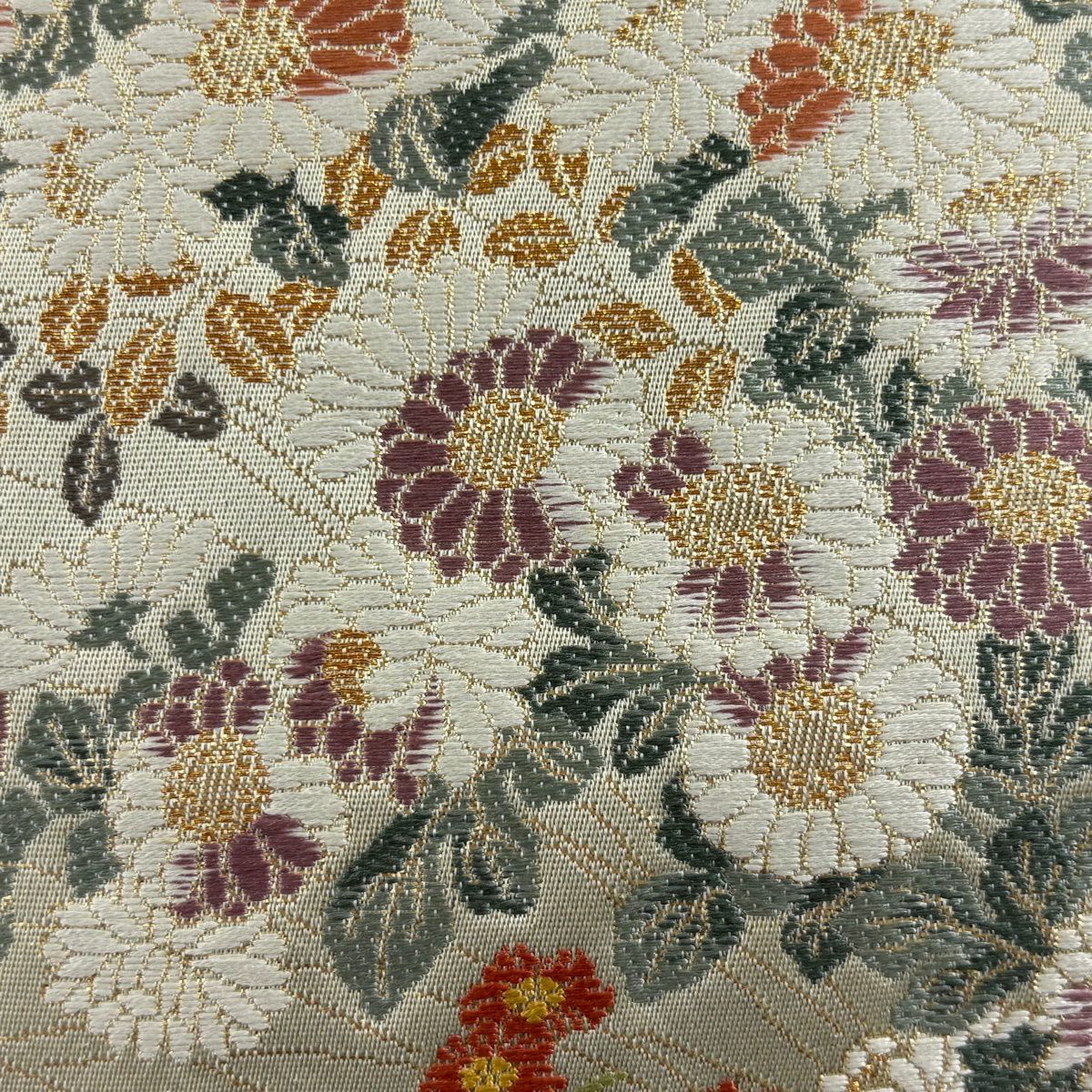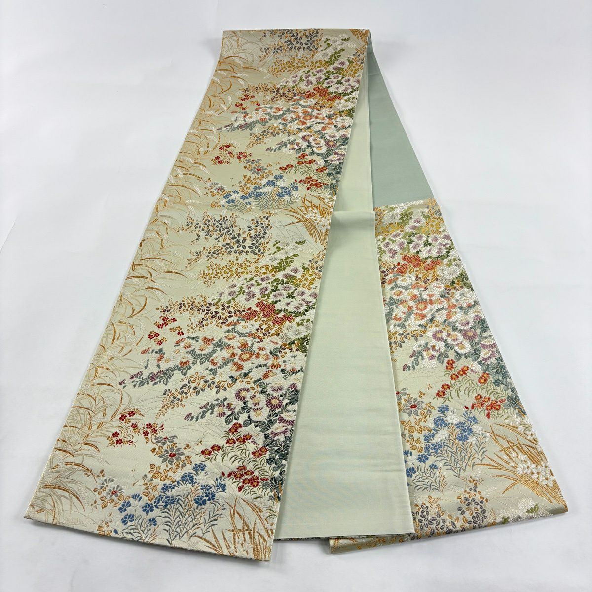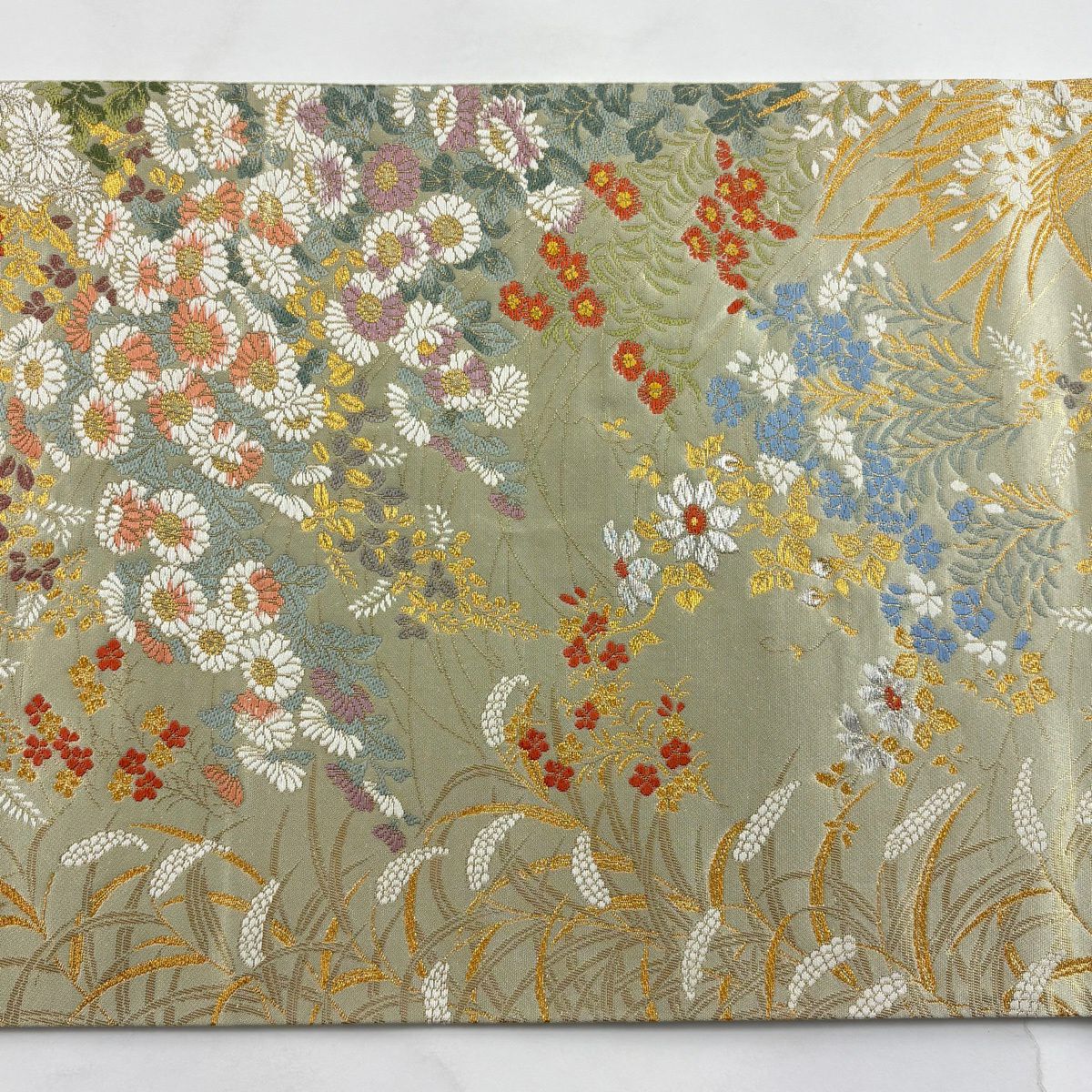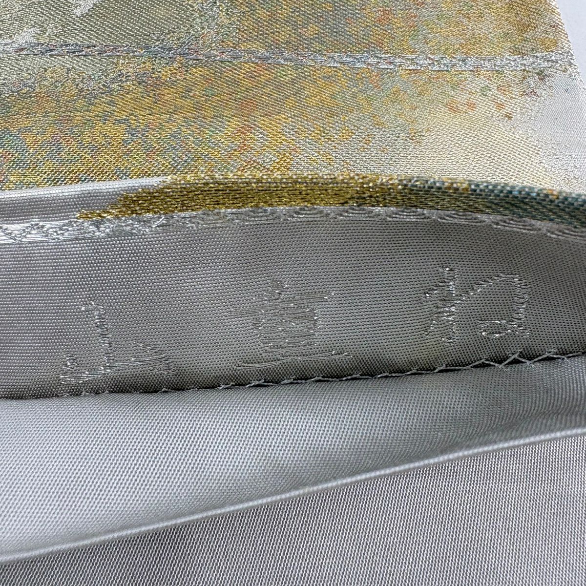 【美品】 袋帯 秀品 証紙あり 菊 萩 金銀糸 箔 灰緑 六通 正絹