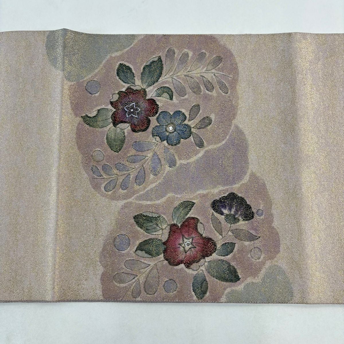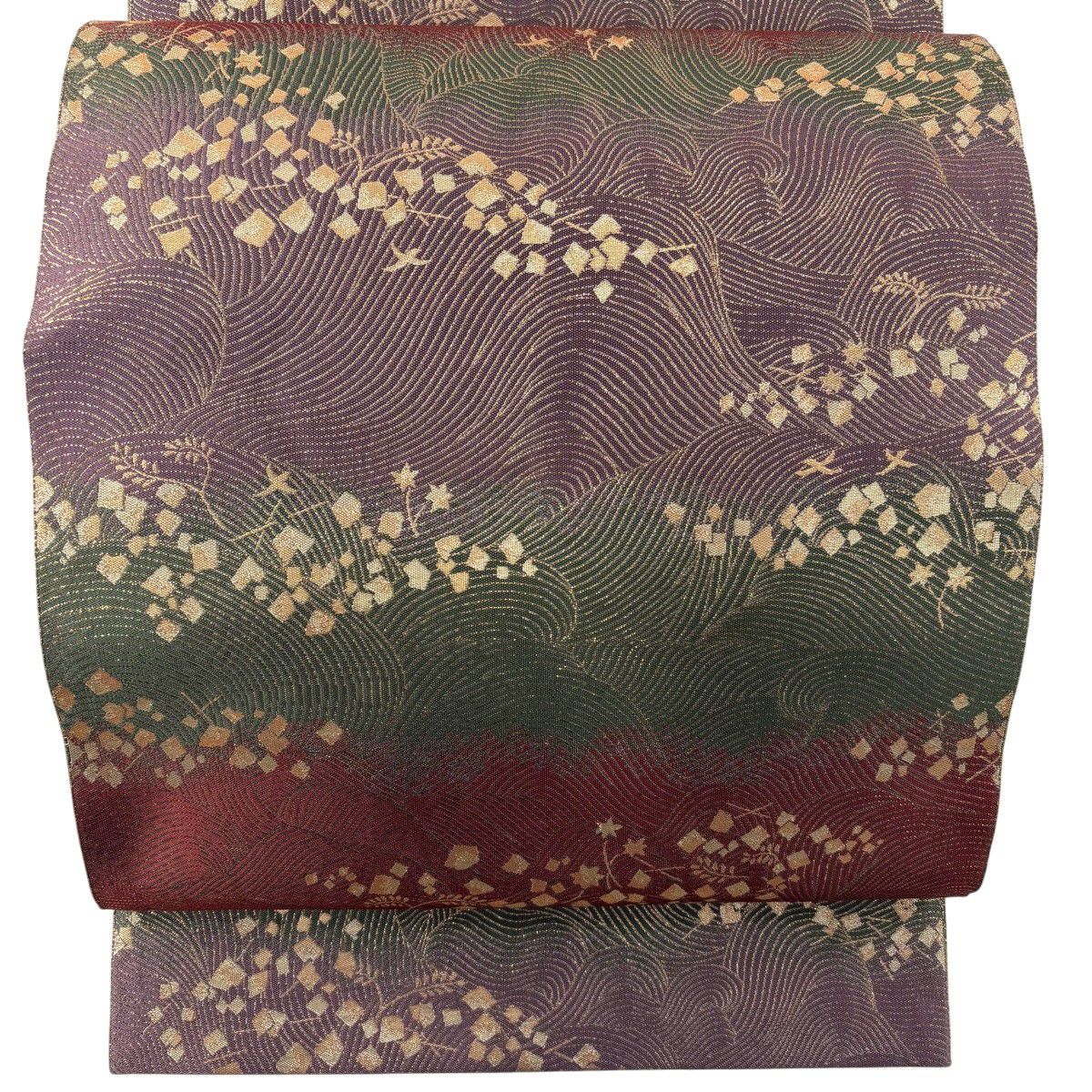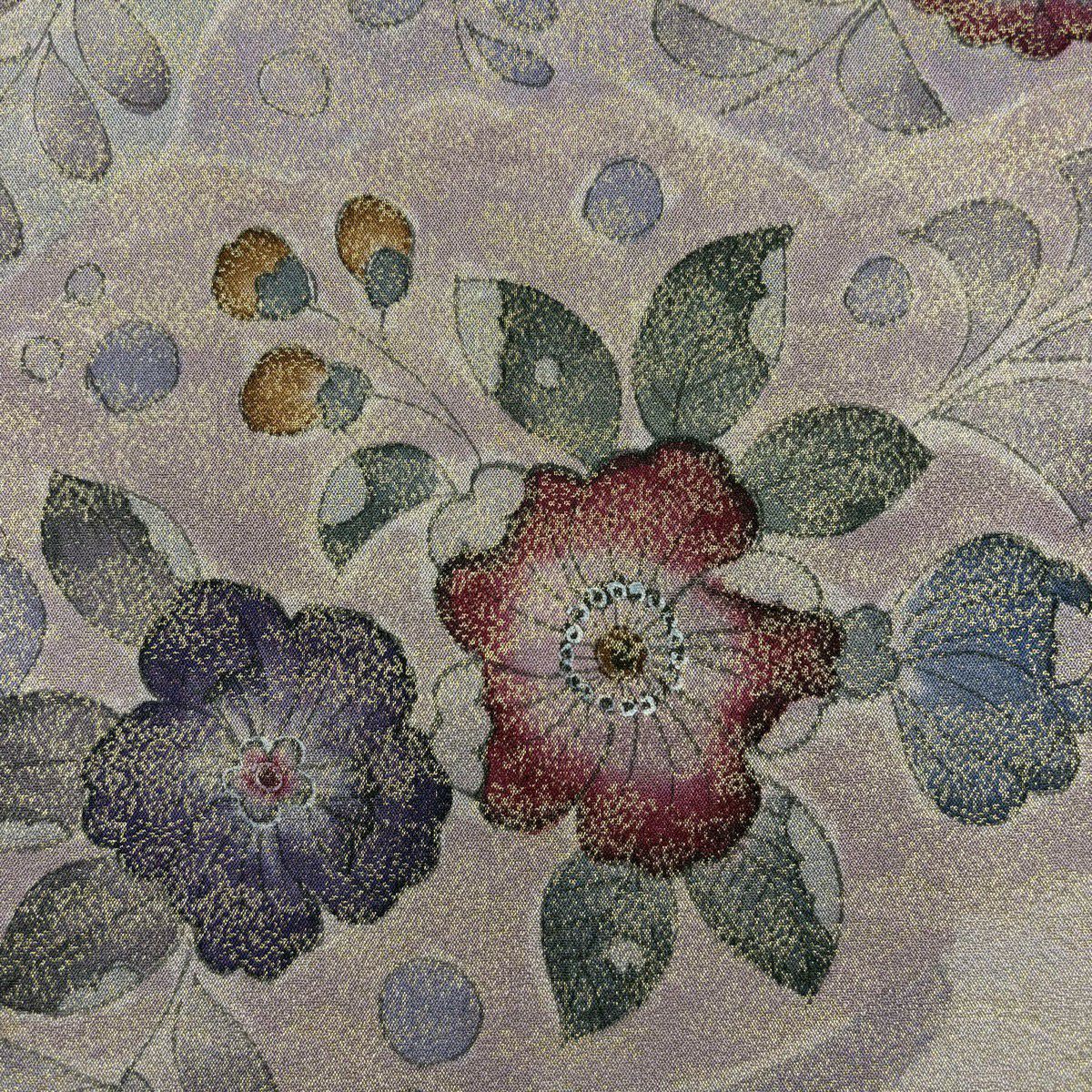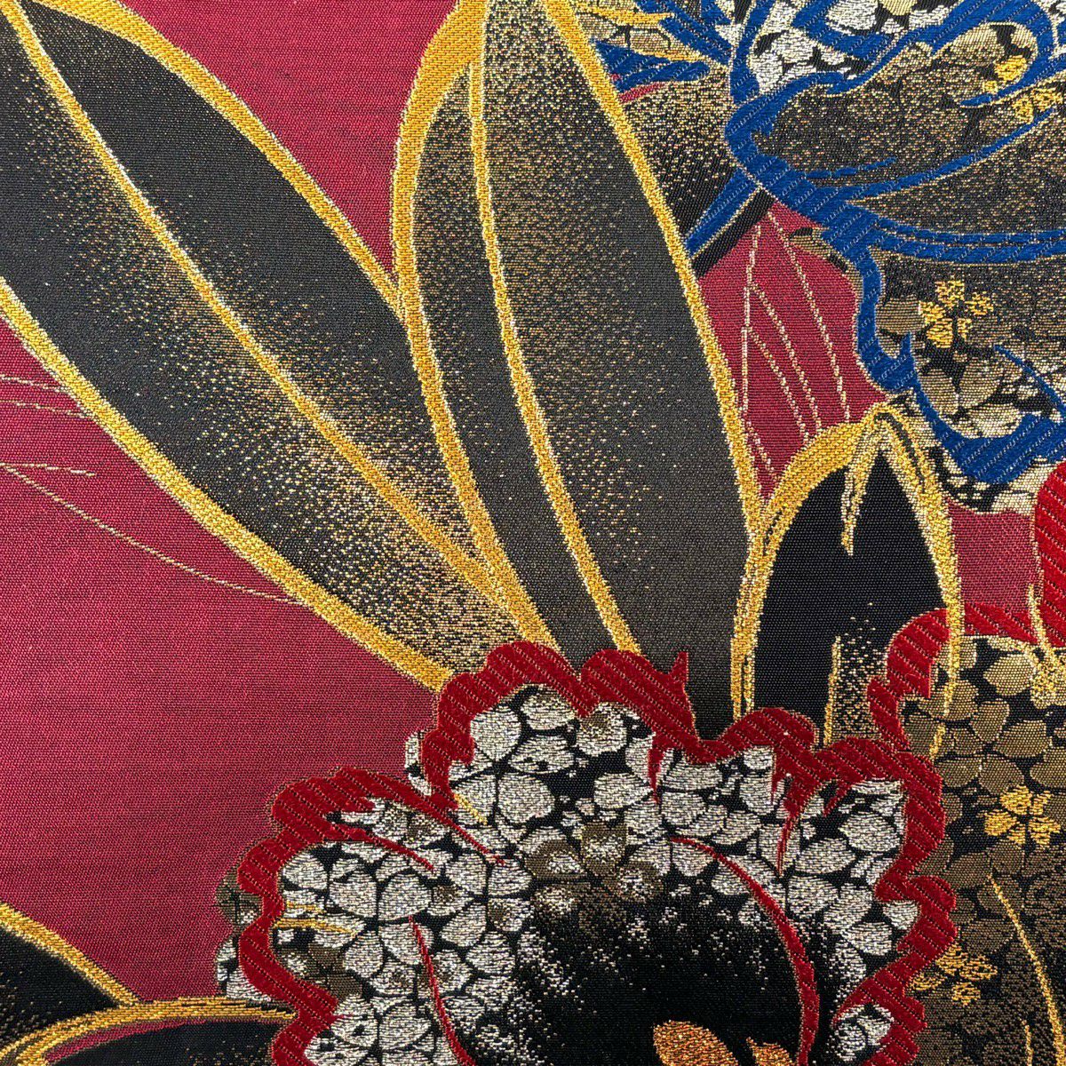 【美品】 袋帯 秀品 振袖向き 草花 金糸 箔 えんじ色 六通 正絹