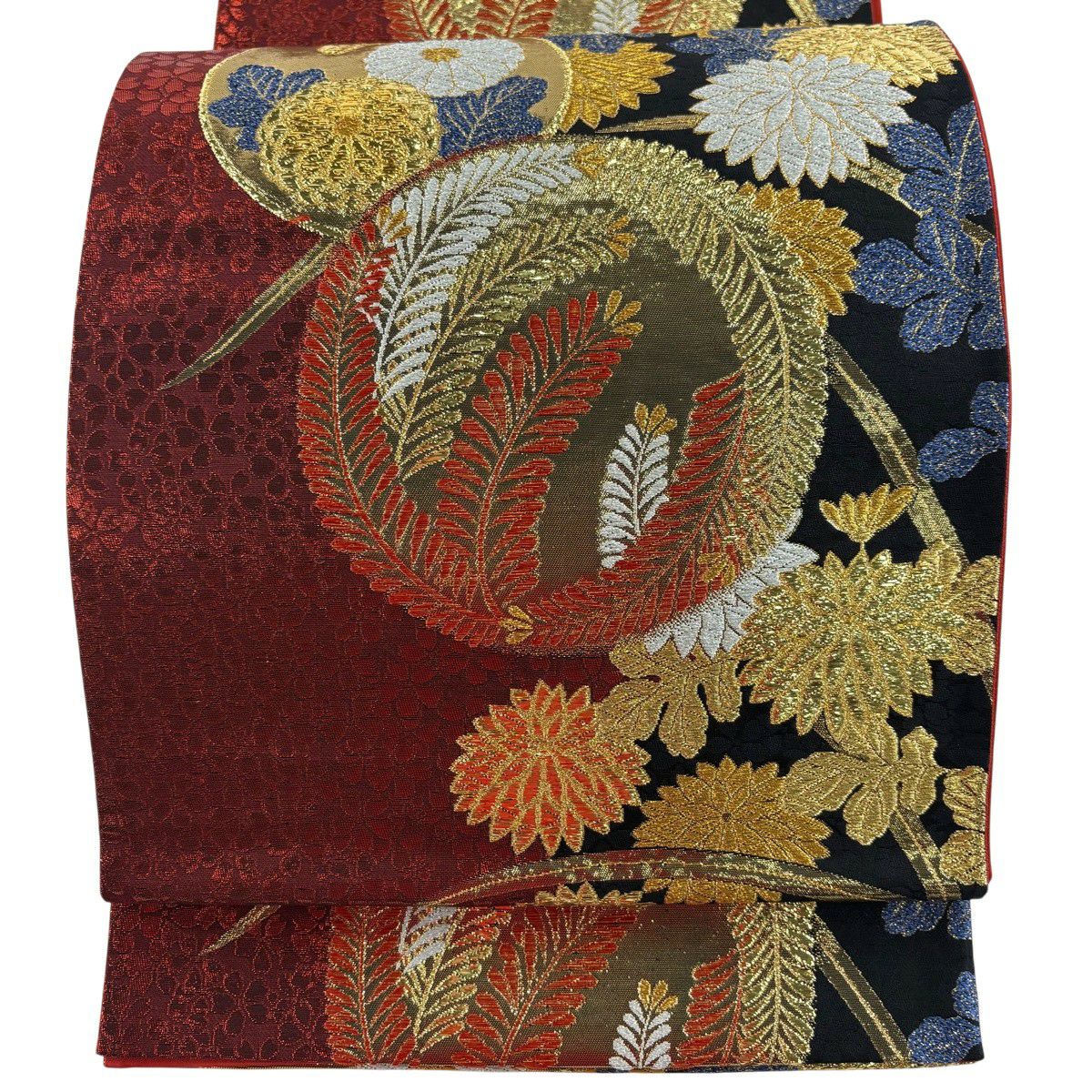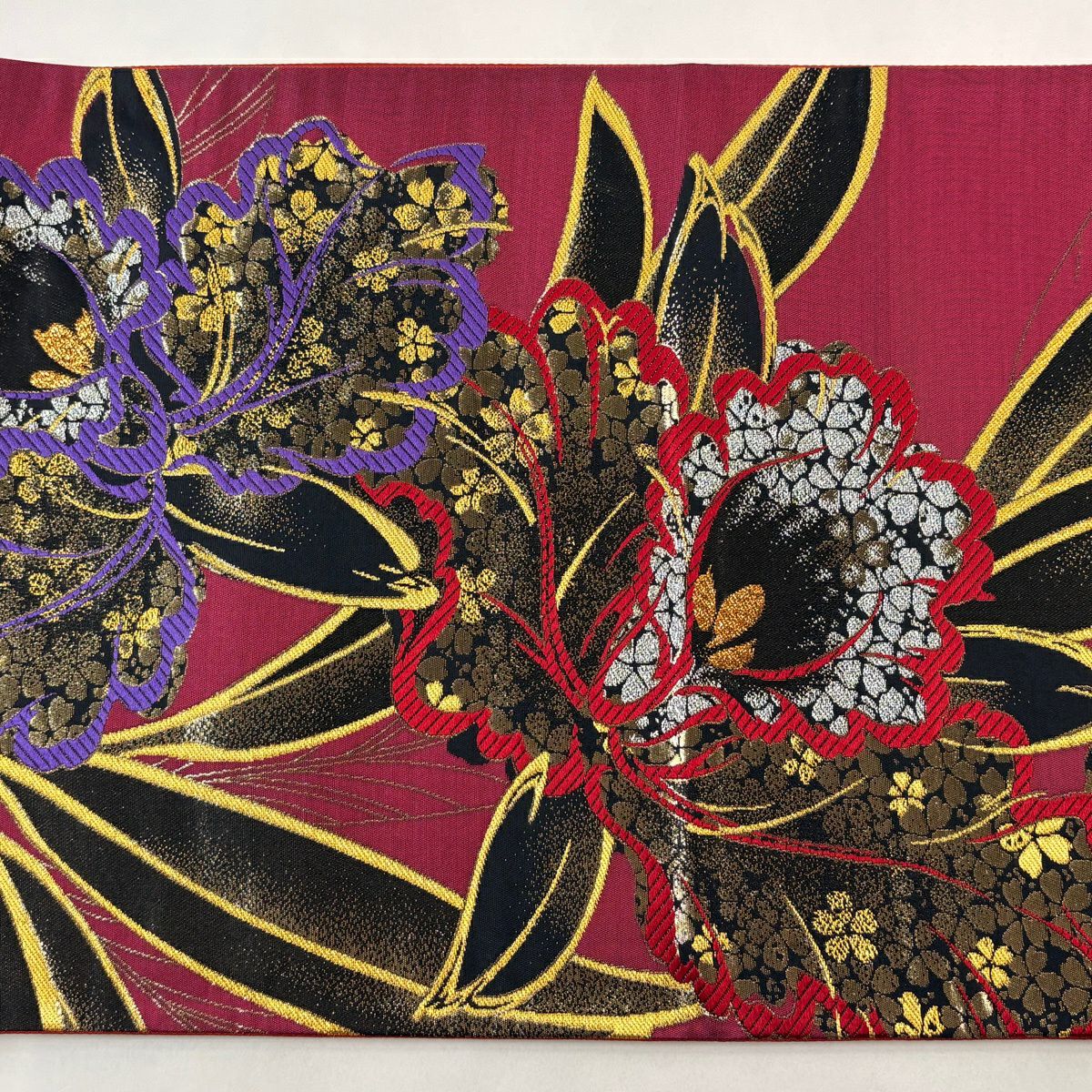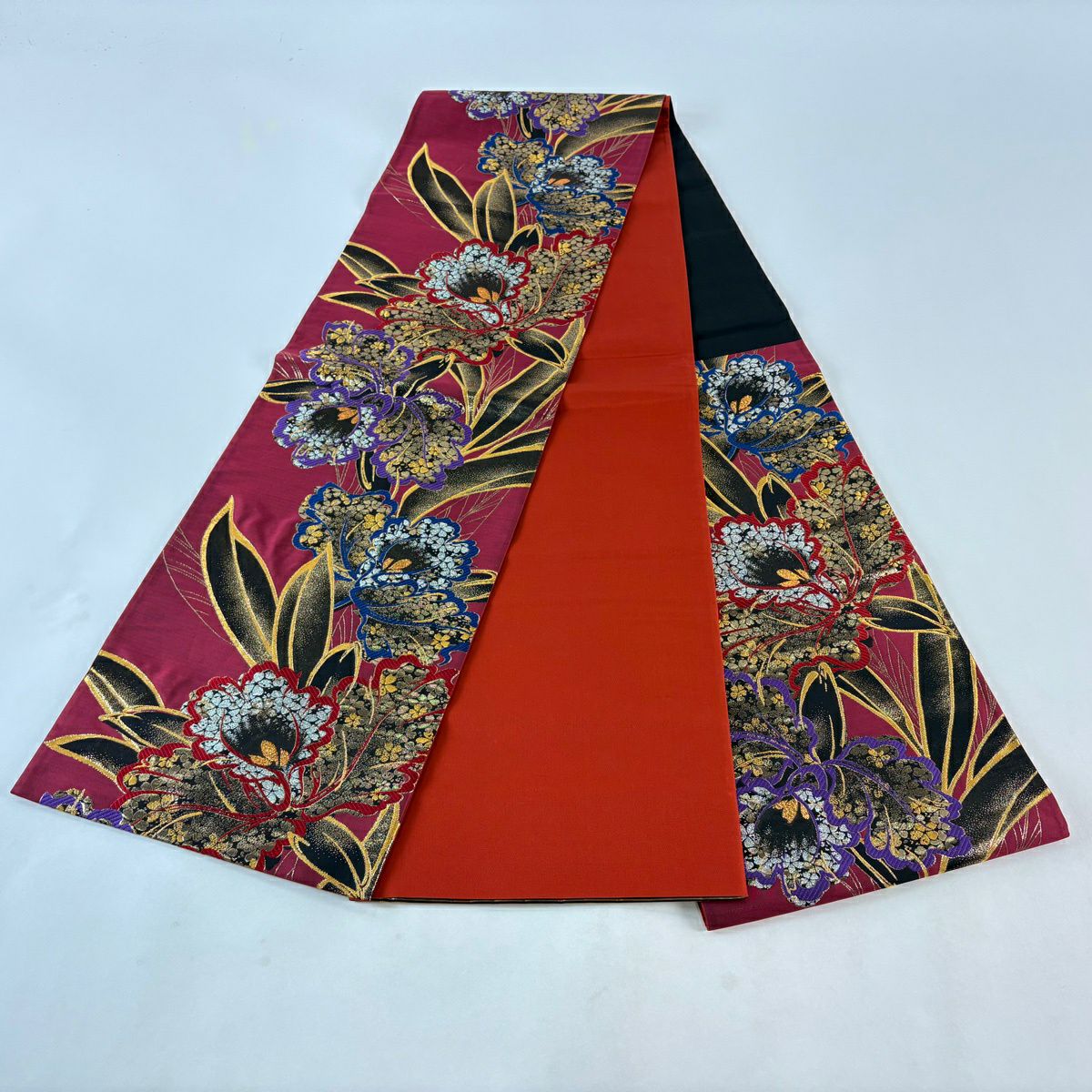 【美品】 袋帯 秀品 振袖向き 草花 金糸 箔 えんじ色 六通 正絹