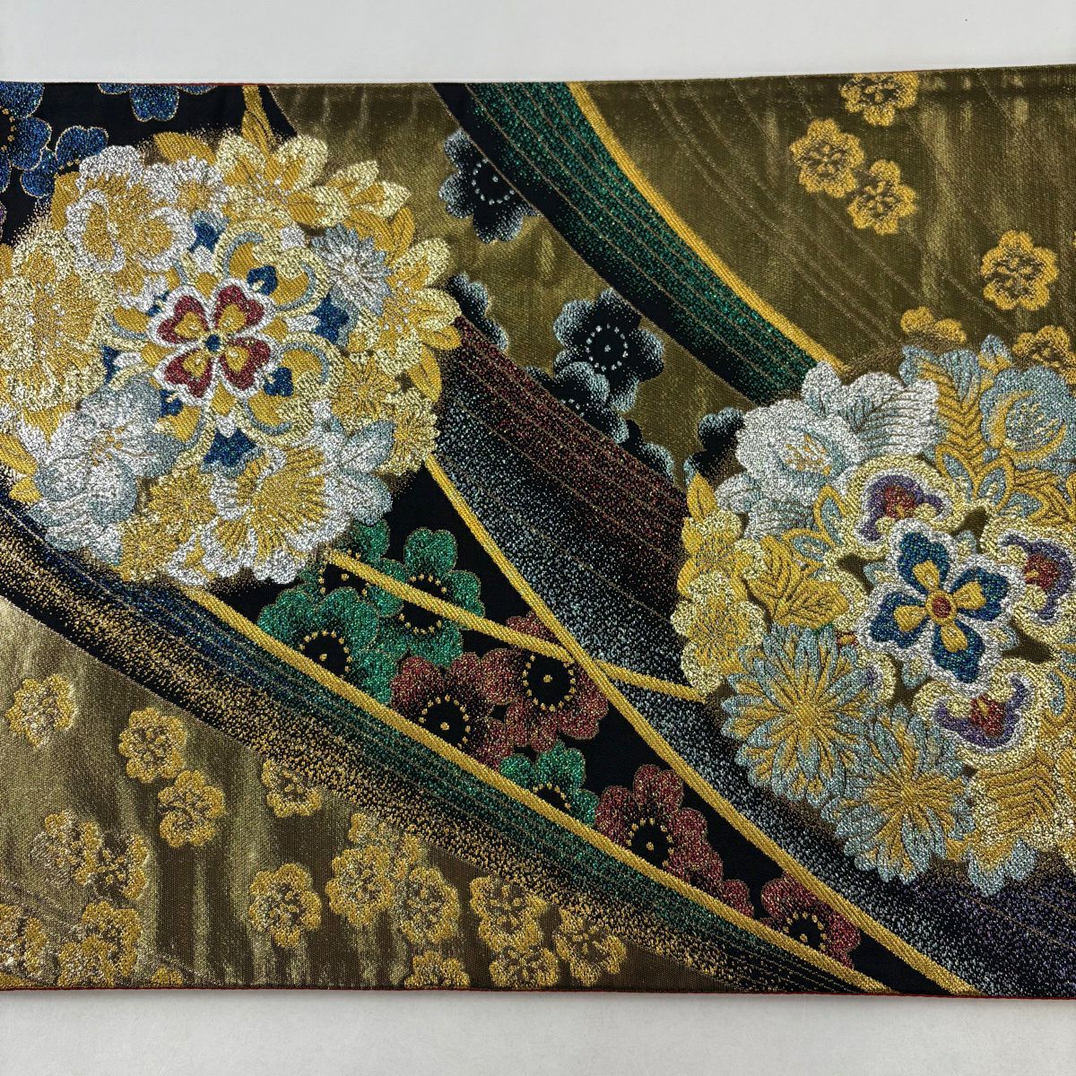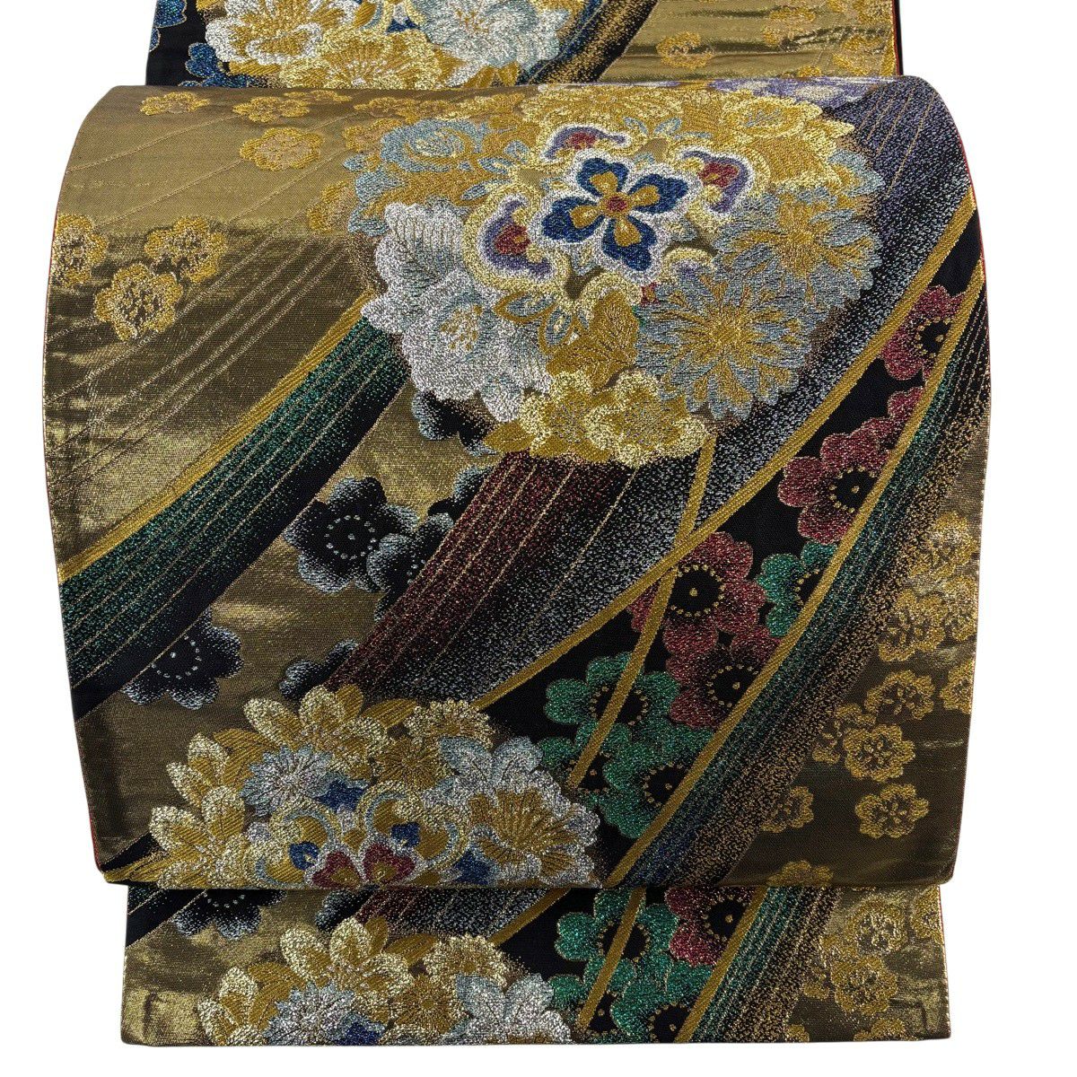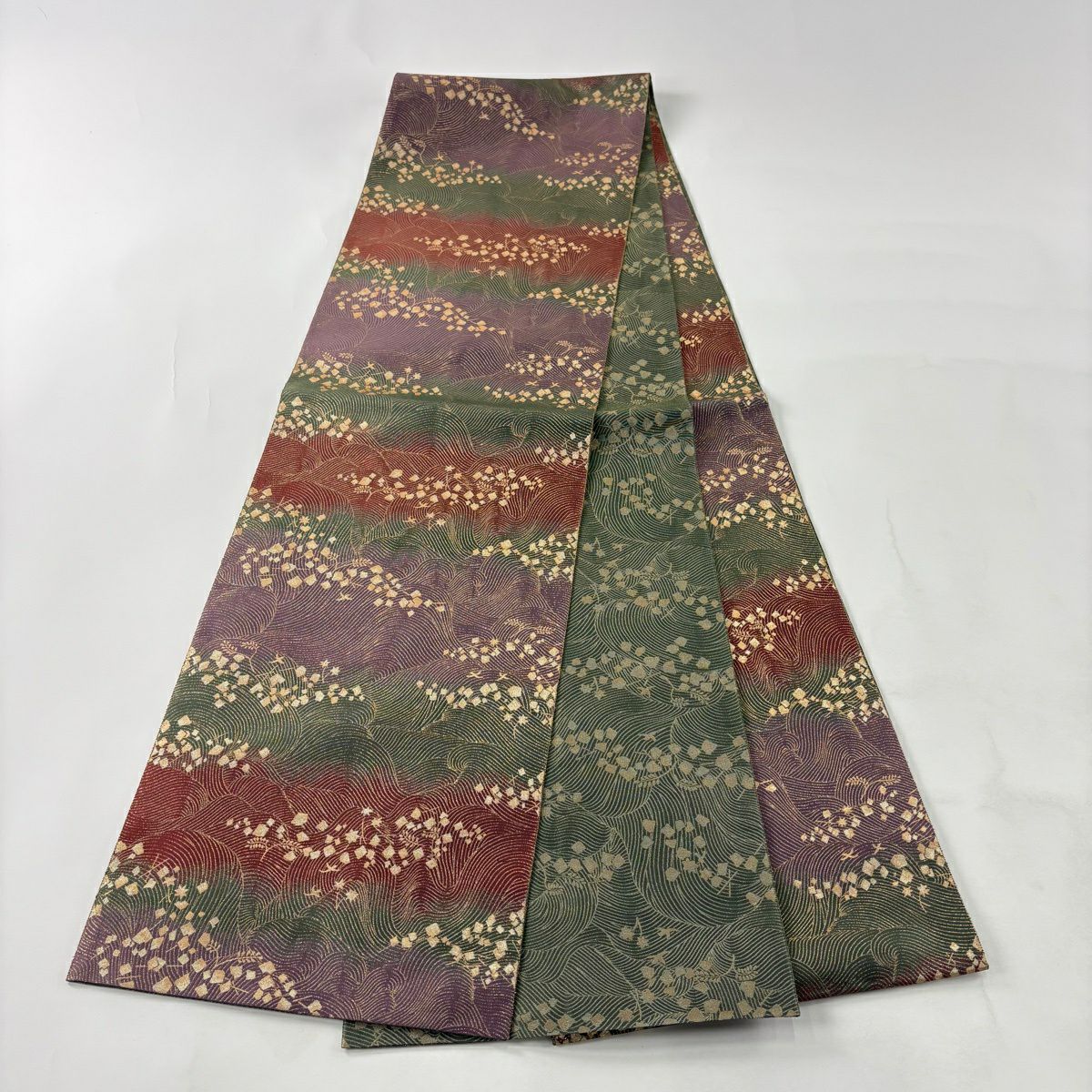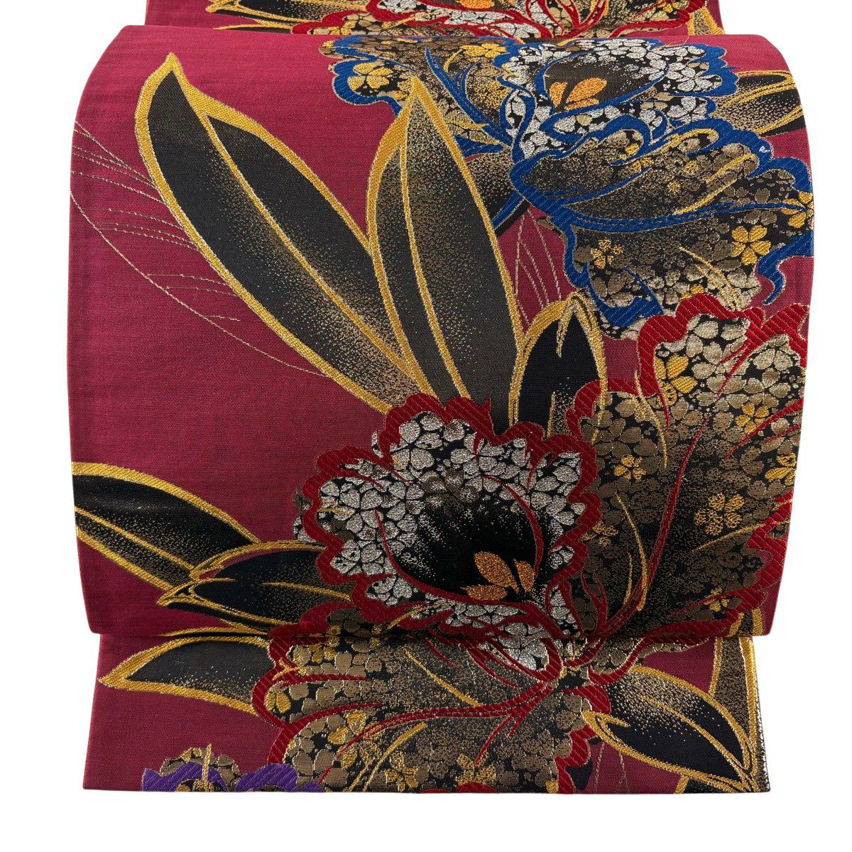 【美品】 袋帯 秀品 振袖向き 草花 金糸 箔 えんじ色 六通 正絹