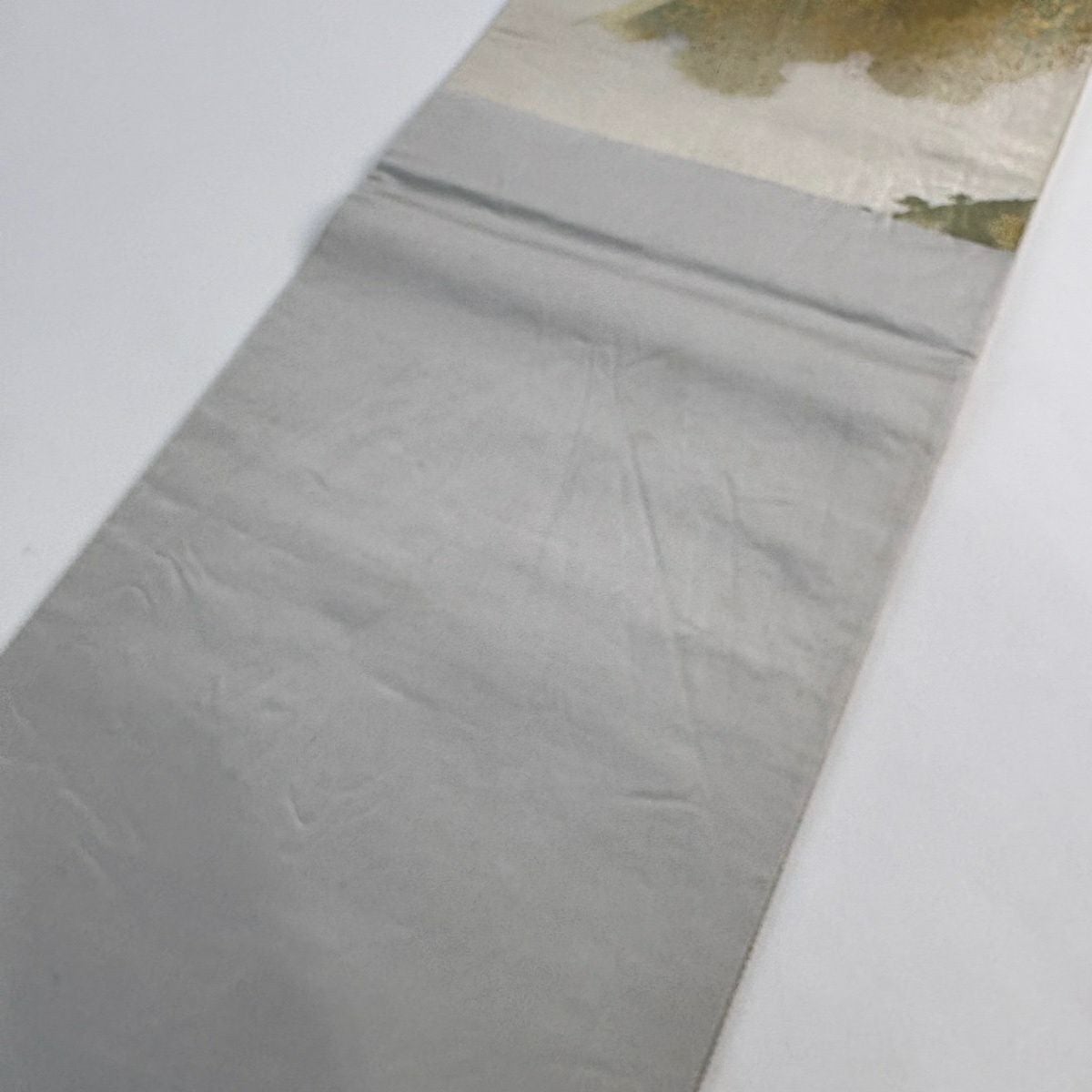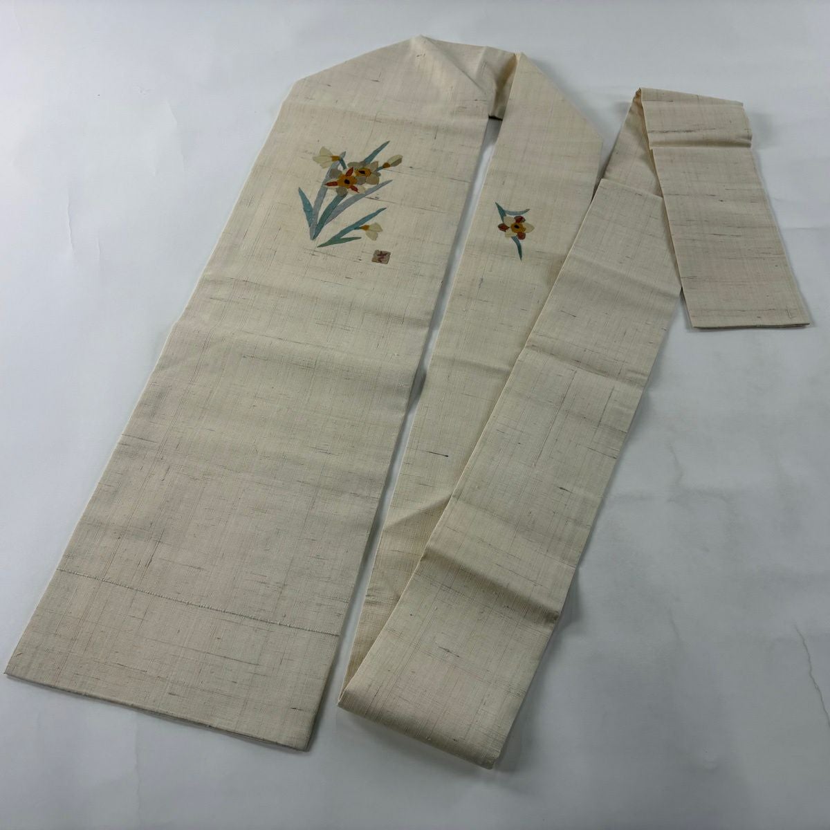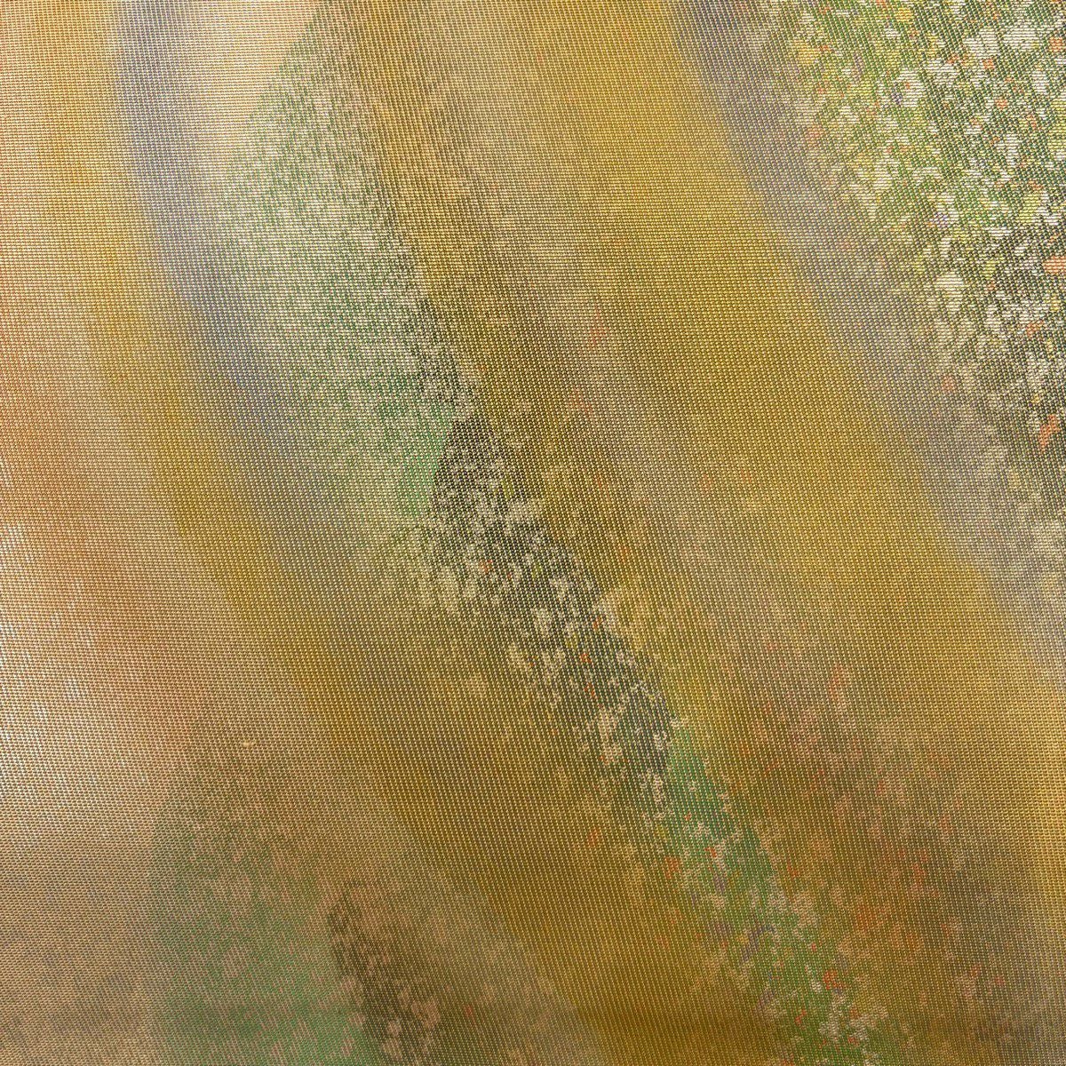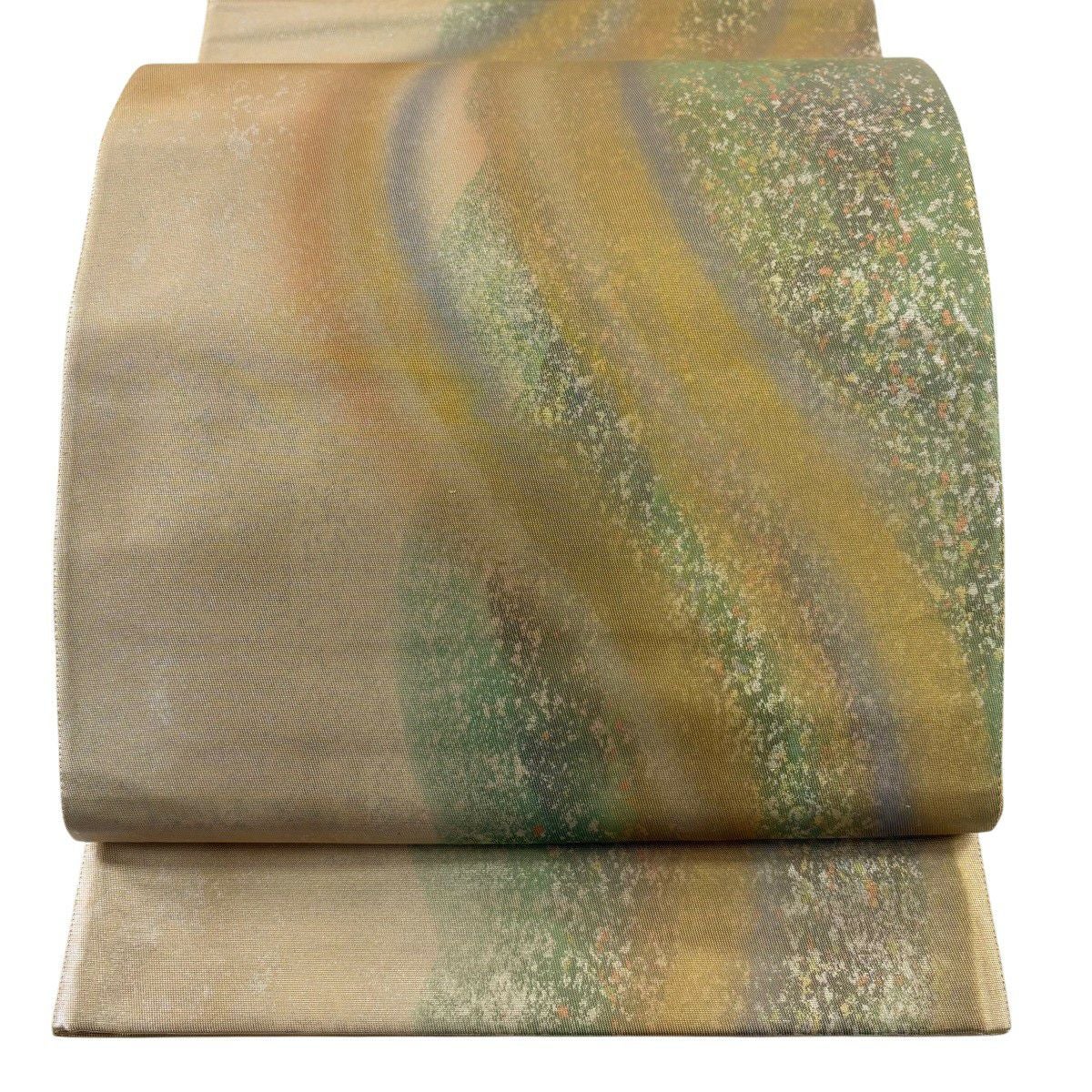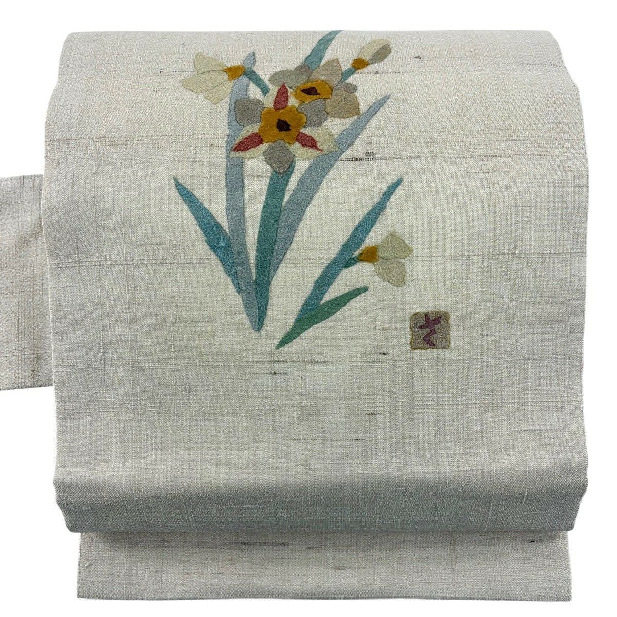 【美品】 名古屋帯 秀品 落款あり 紬地 和紙 草花 クリーム 正絹