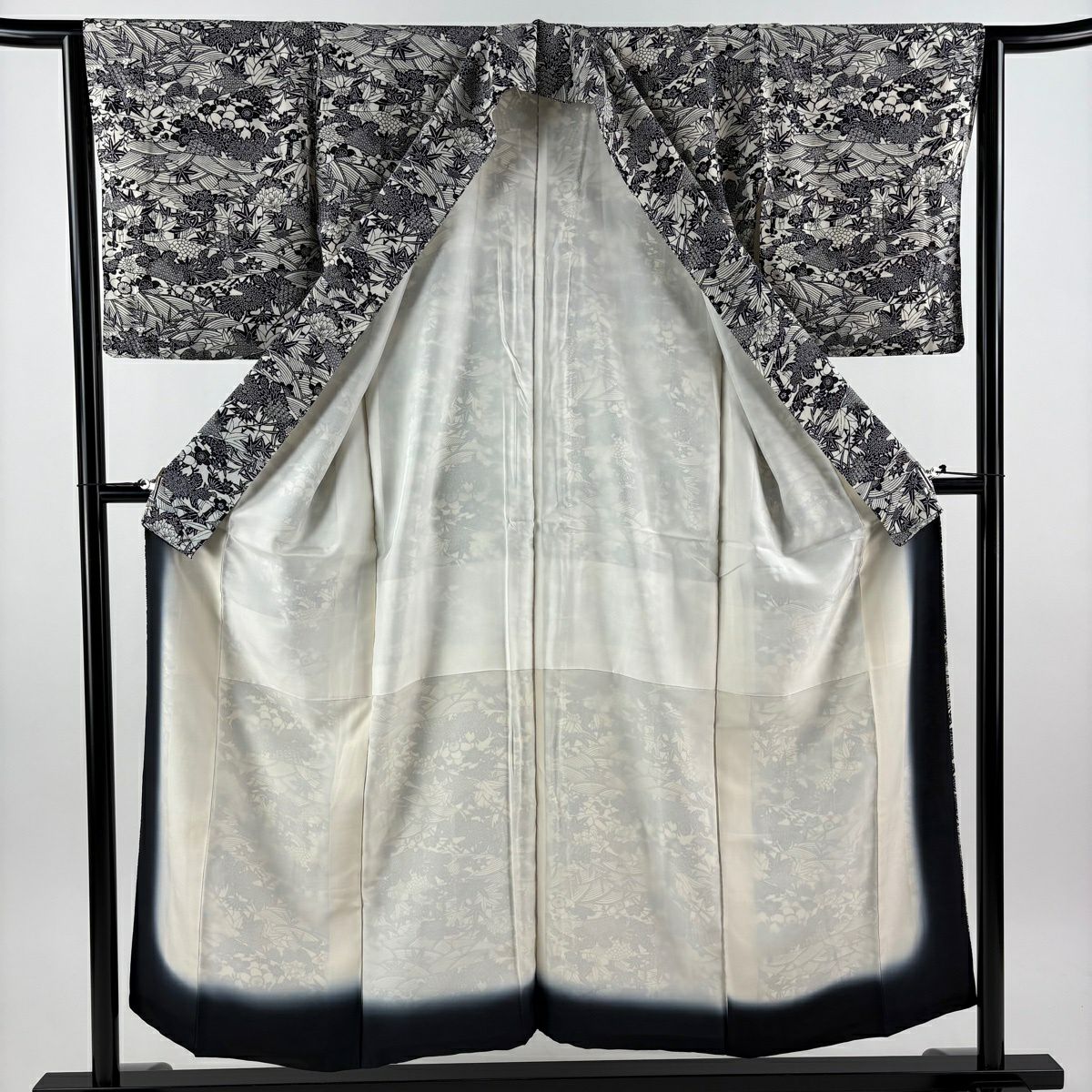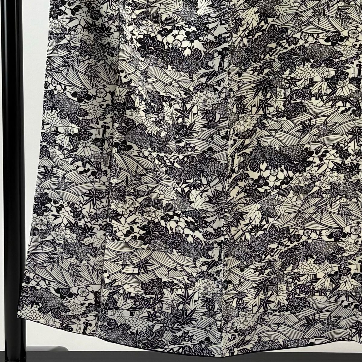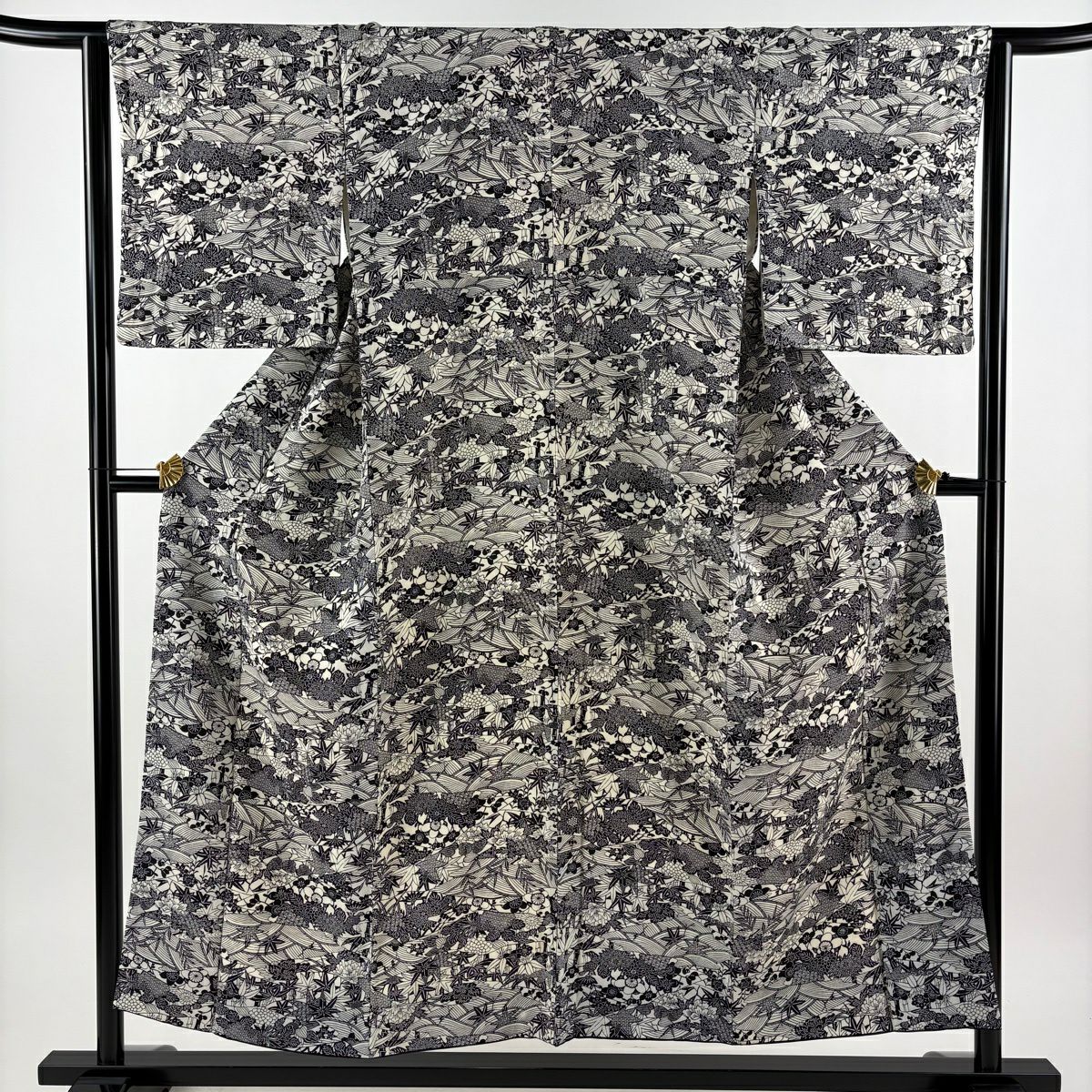 小紋 身丈153cm 裄丈64cm M 袷 草花 波 灰白 正絹 秀品