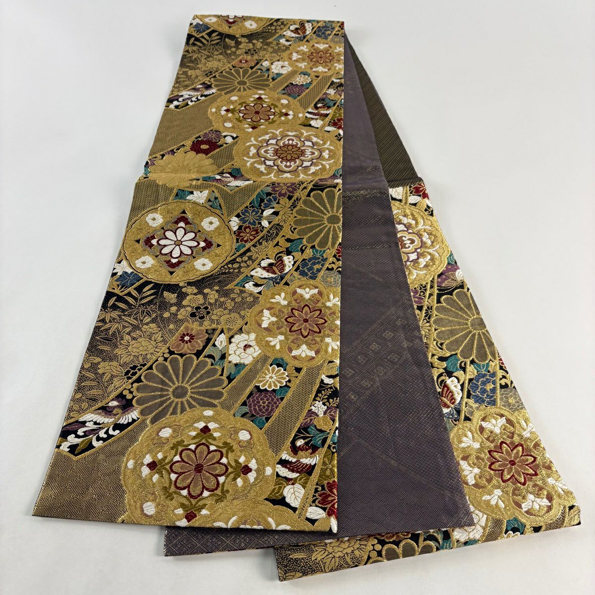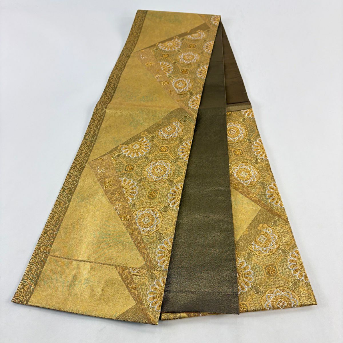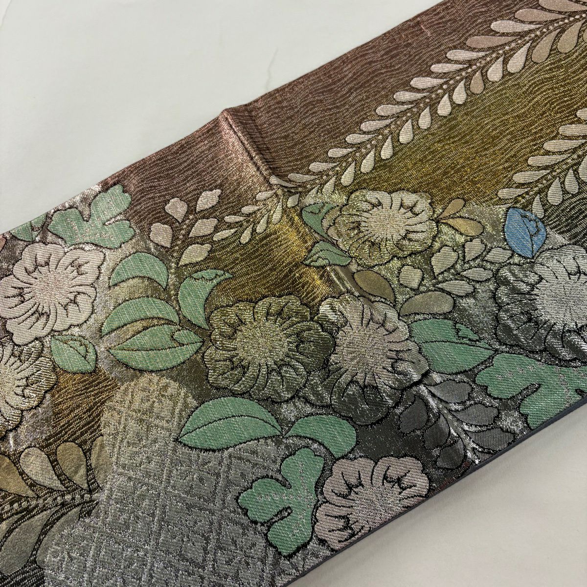 【美品】 袋帯 秀品 輝金錦 草花 七宝 金糸 箔 灰茶 六通 正絹