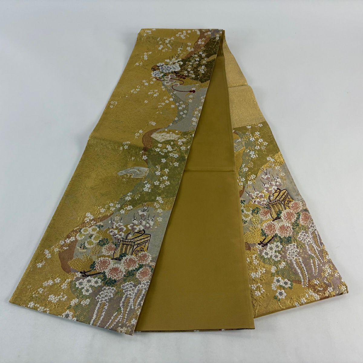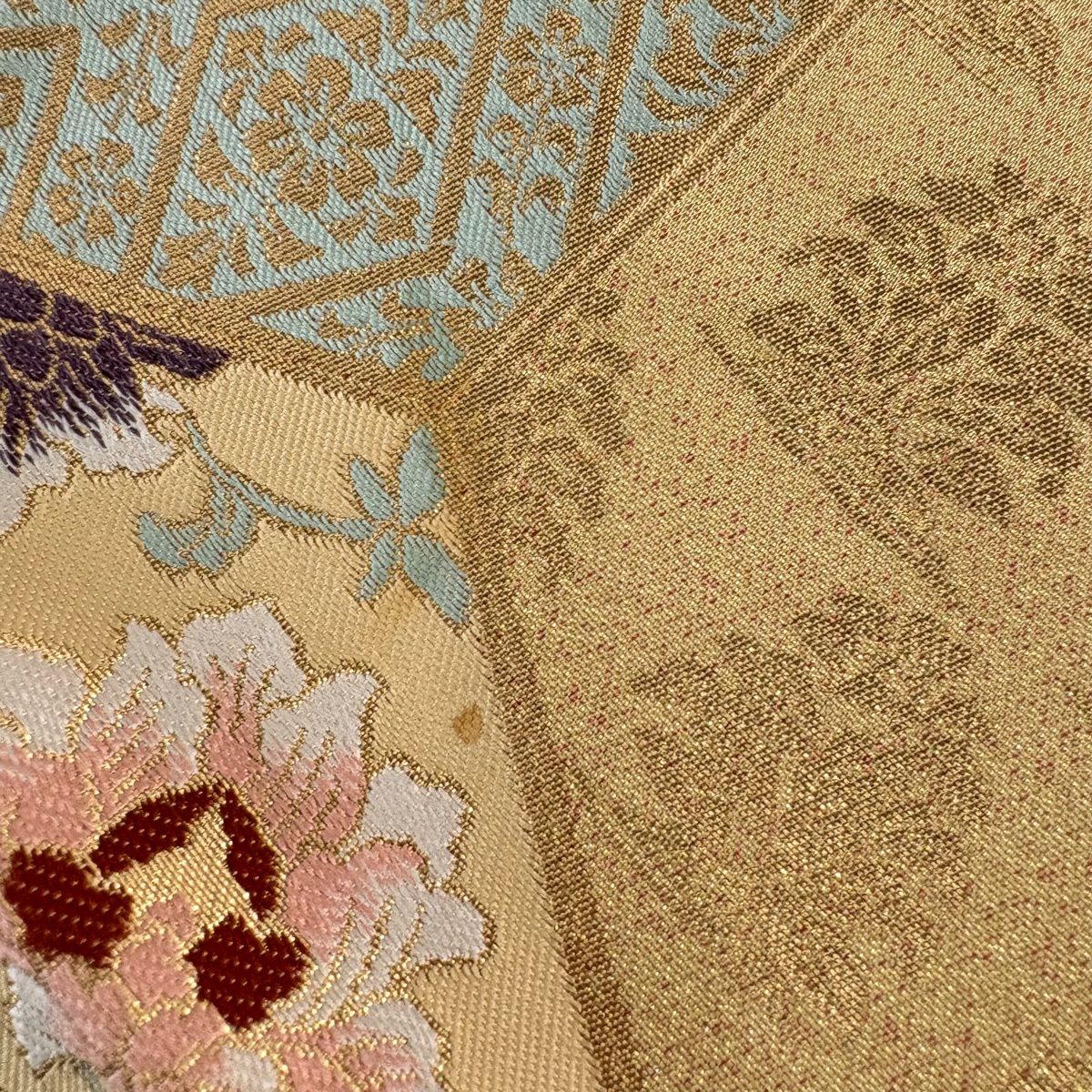 【美品】 袋帯 秀品 振袖向き 華文 花鳥 金糸 箔 金色 六通 正絹