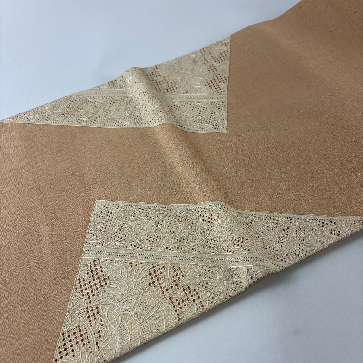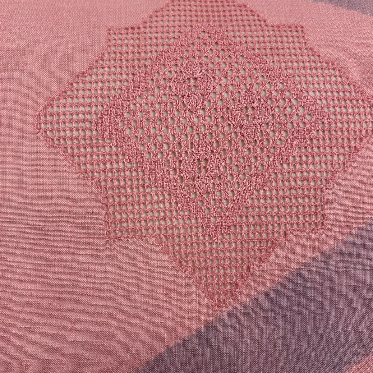 【美品】 名古屋帯 秀品 紬地 幾何学模様 汕頭刺繍 ピンク 正絹