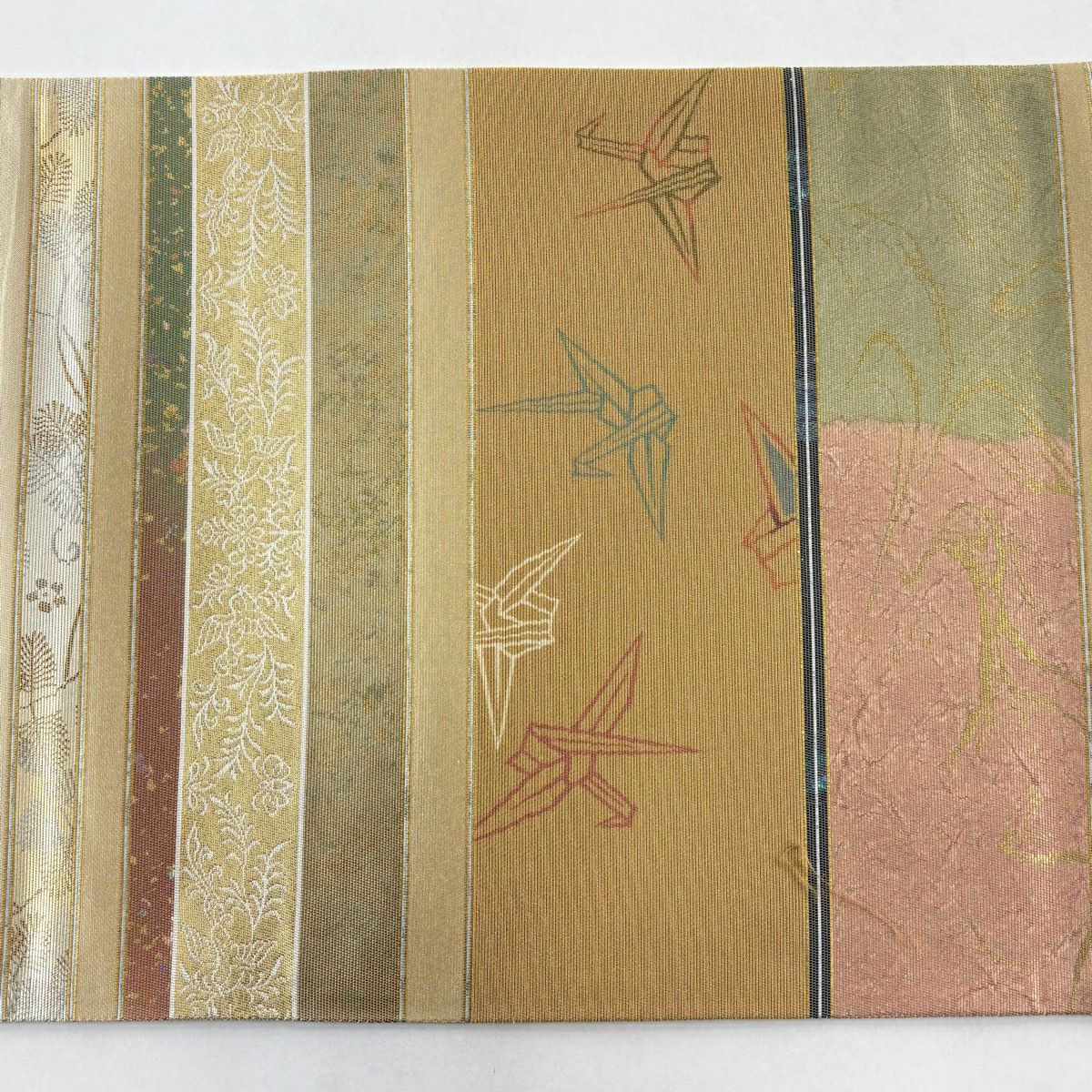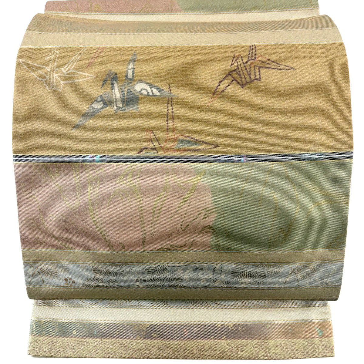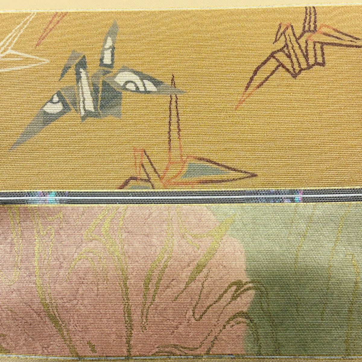 【美品】 袋帯 秀品 段縞 折り鶴 螺鈿箔 金彩 金色 お太鼓柄 正絹