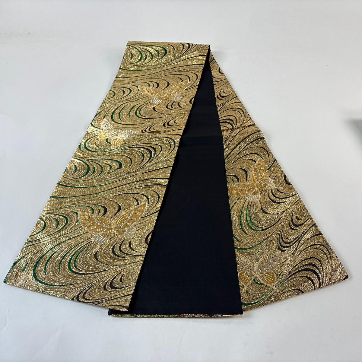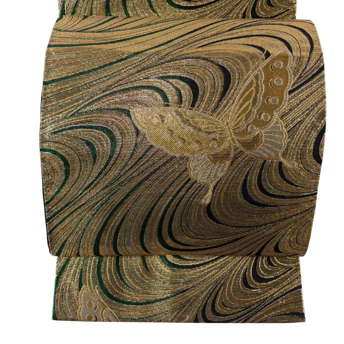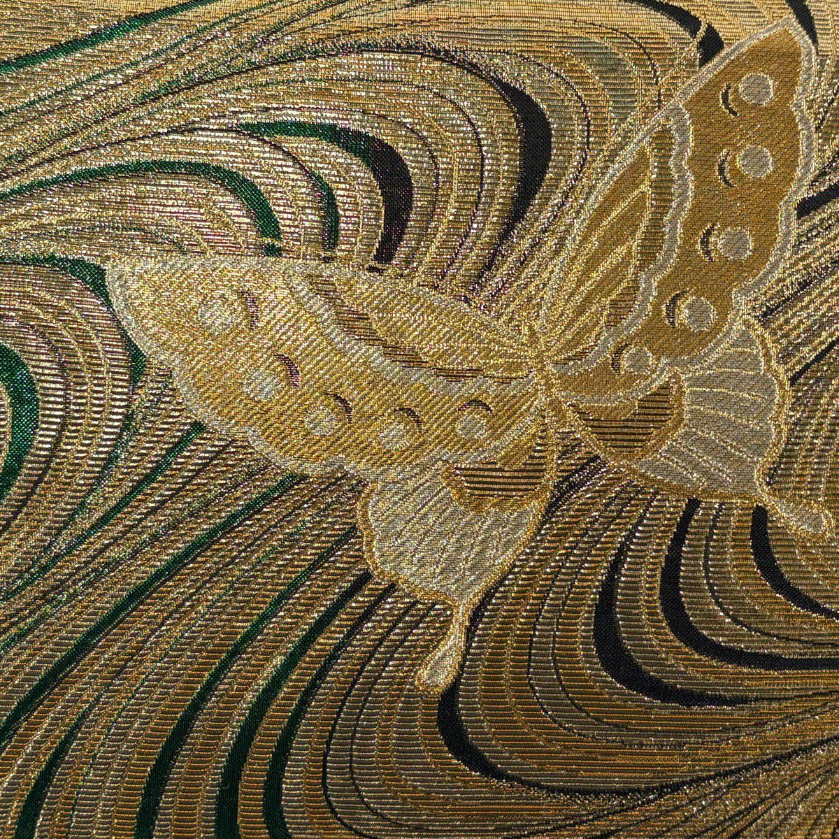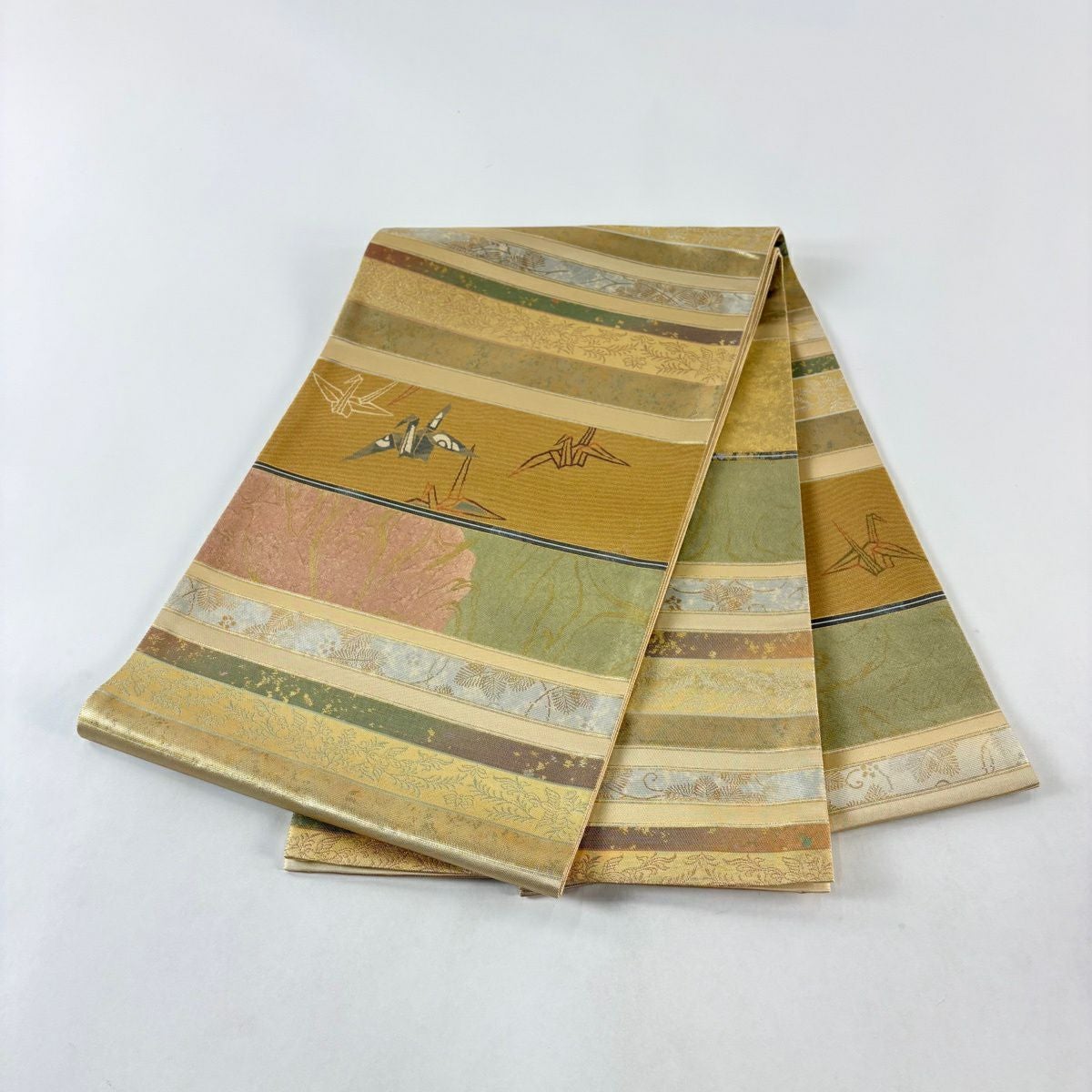【美品】 袋帯 秀品 段縞 折り鶴 螺鈿箔 金彩 金色 お太鼓柄 正絹