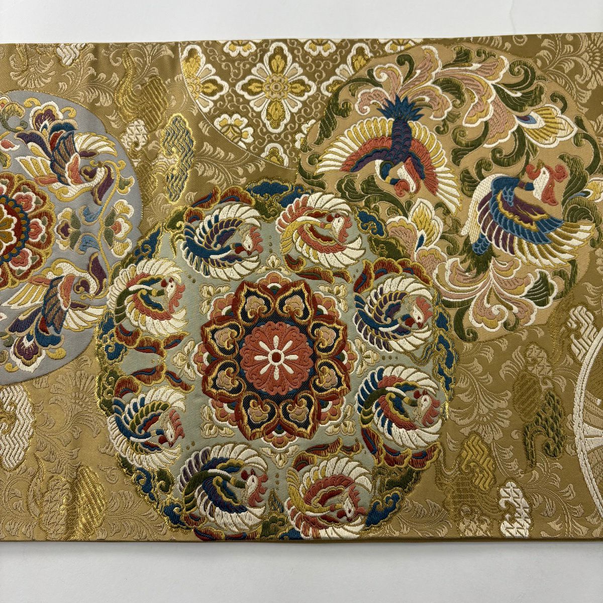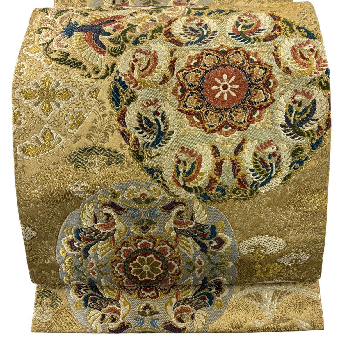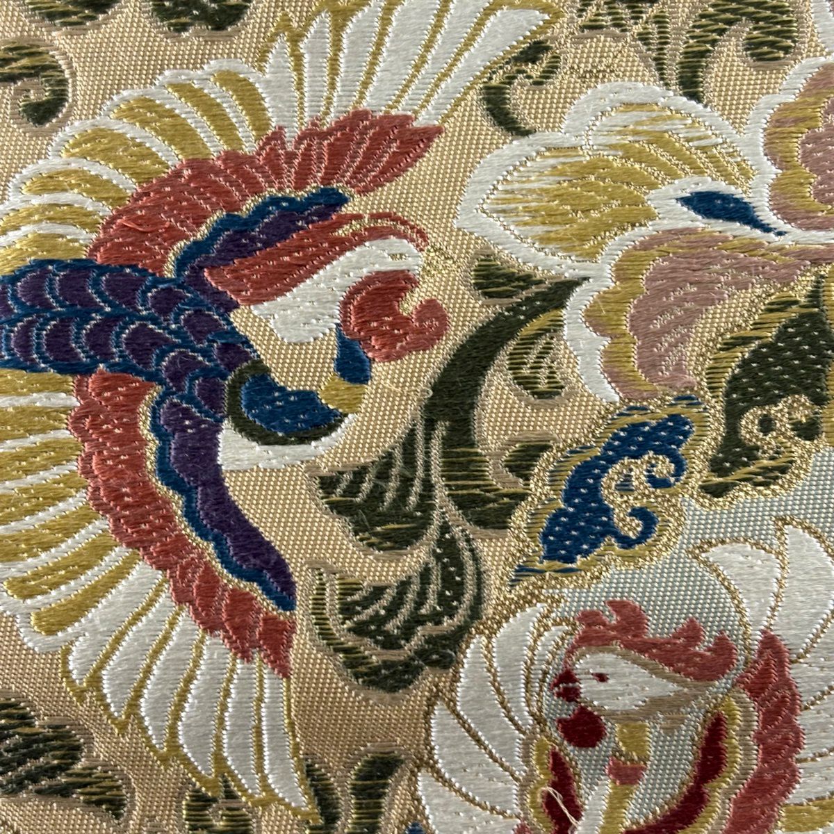 【美品】 袋帯 秀品 鳳凰 華文 唐織 箔 ベージュ 六通 正絹