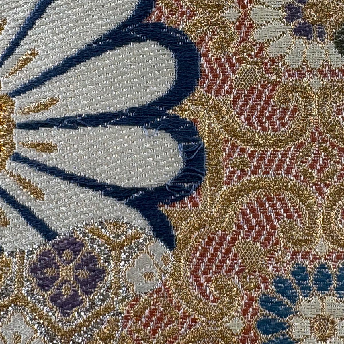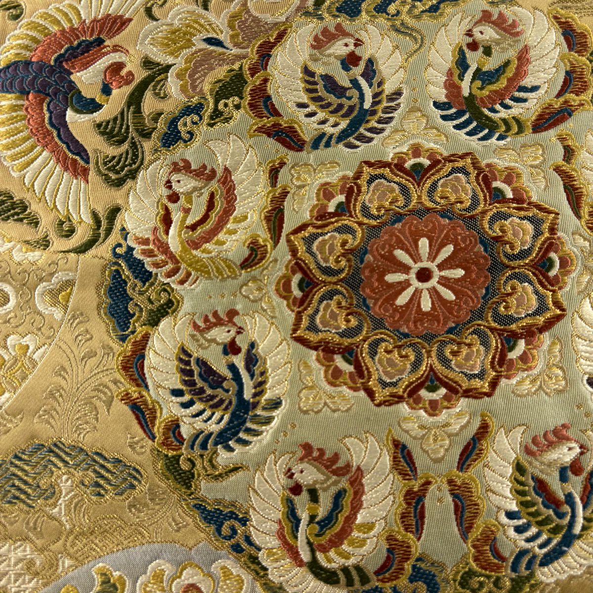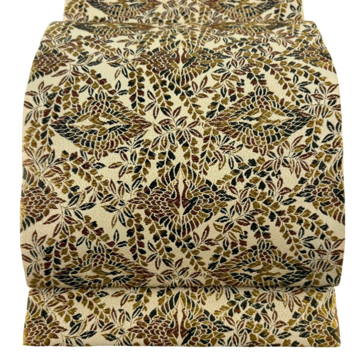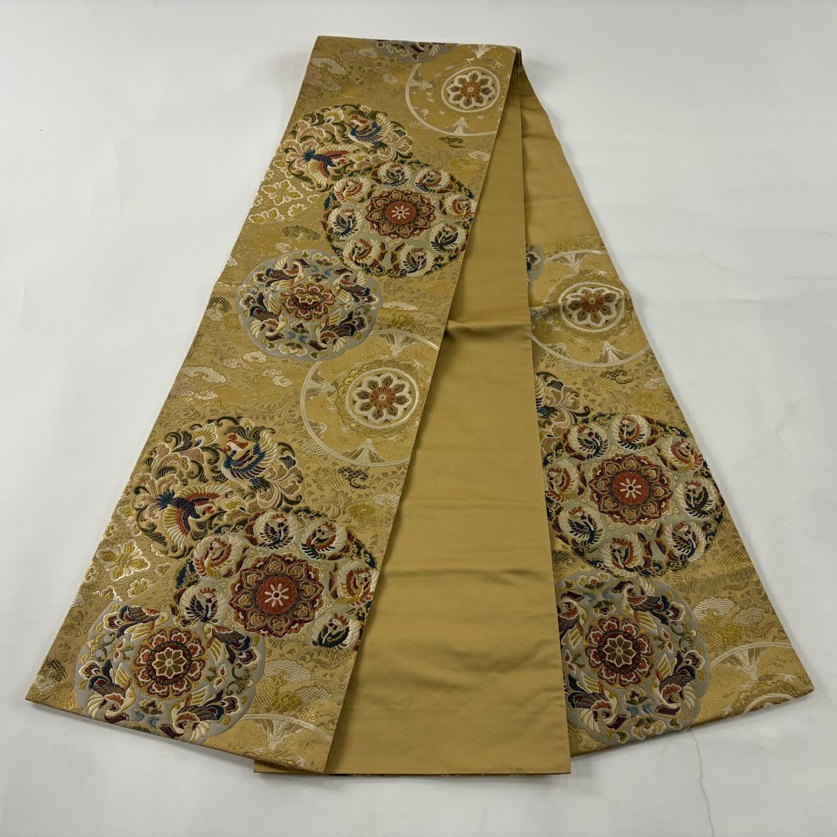 【美品】 袋帯 秀品 鳳凰 華文 唐織 箔 ベージュ 六通 正絹