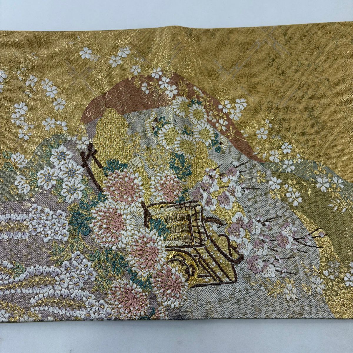 【美品】 袋帯 秀品 やまと 御所車 草花 金糸 箔 金色 六通 正絹