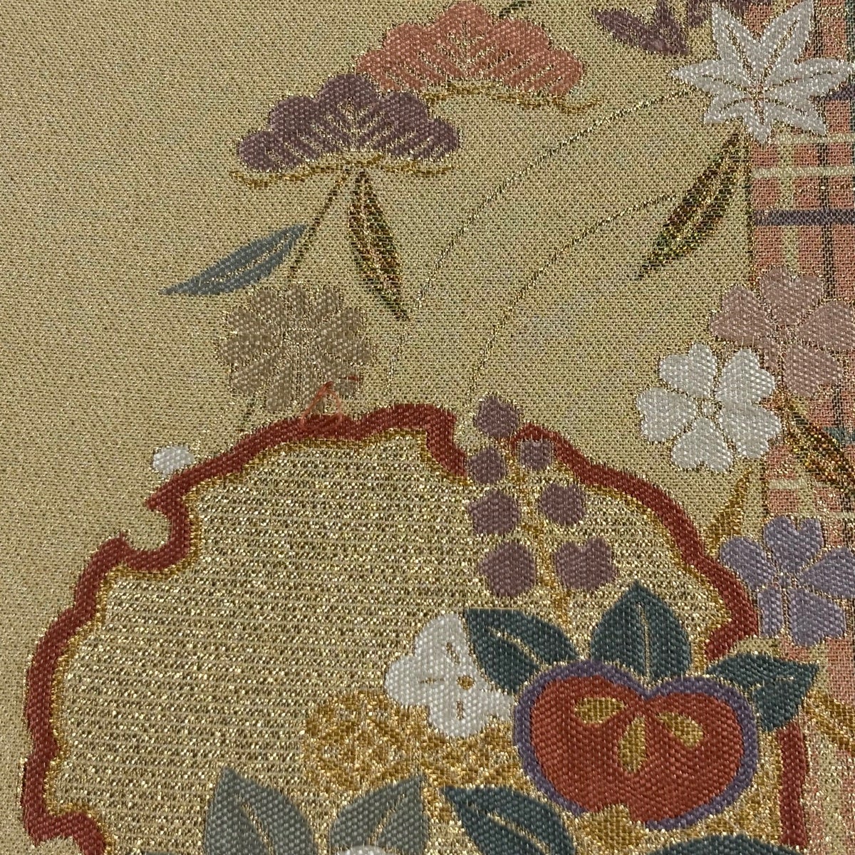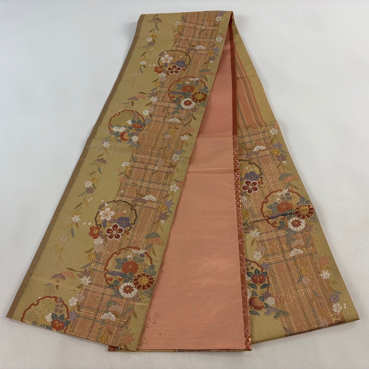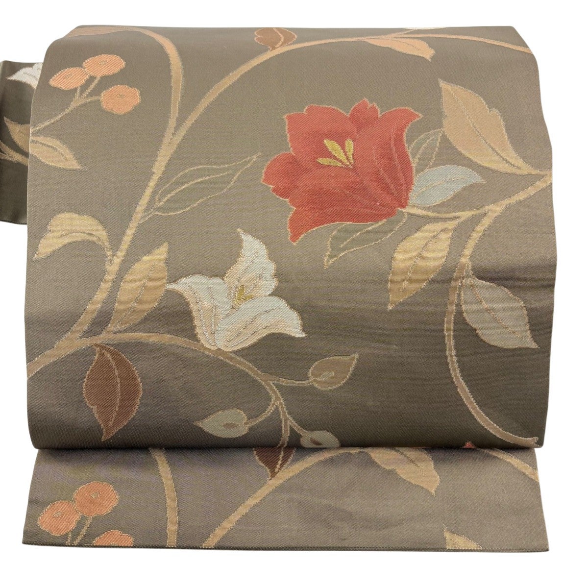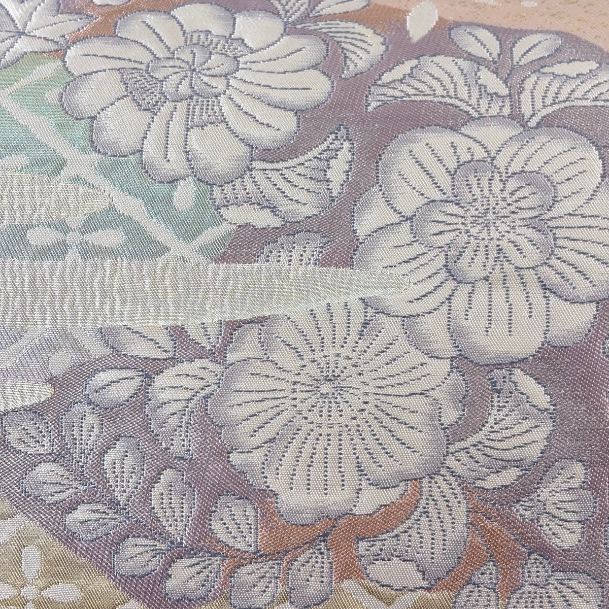 【美品】 袋帯 秀品 華文 草花 金糸 箔 ベージュ 六通 正絹