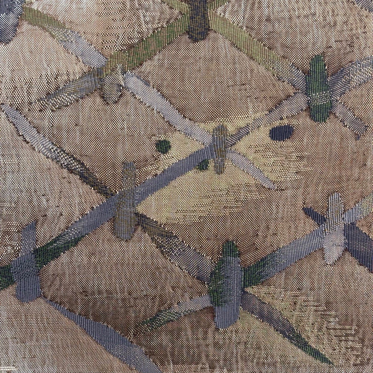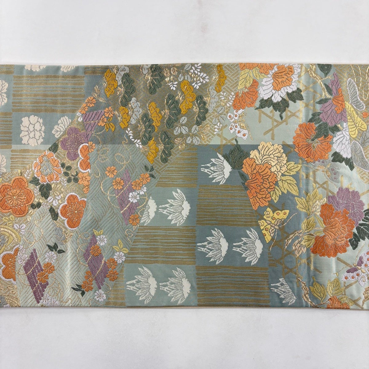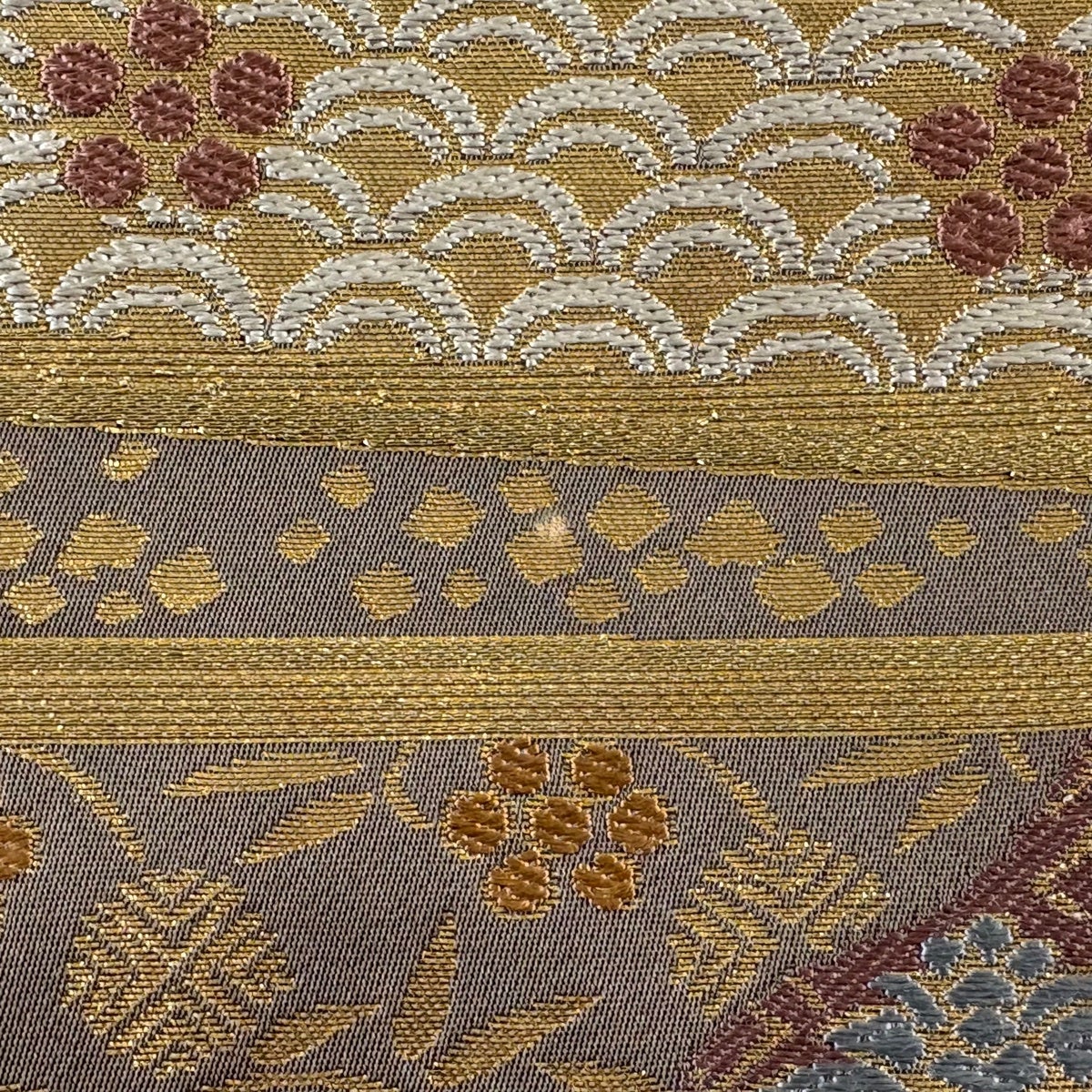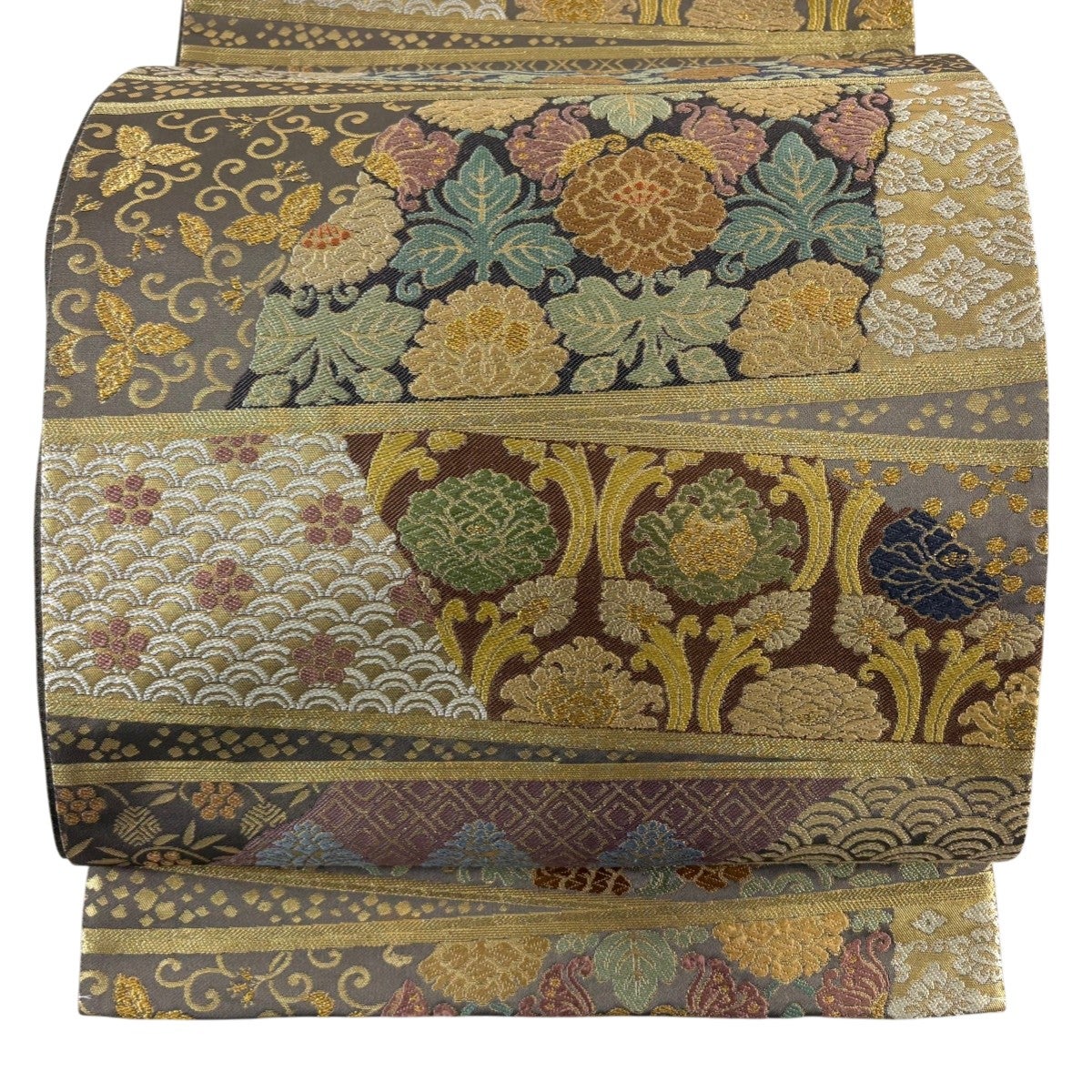 【美品】 袋帯 秀品 華文 草花 金糸 箔 ベージュ 六通 正絹