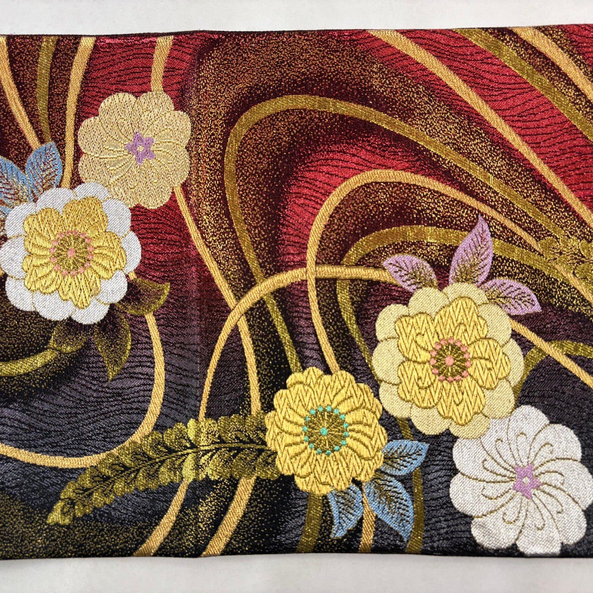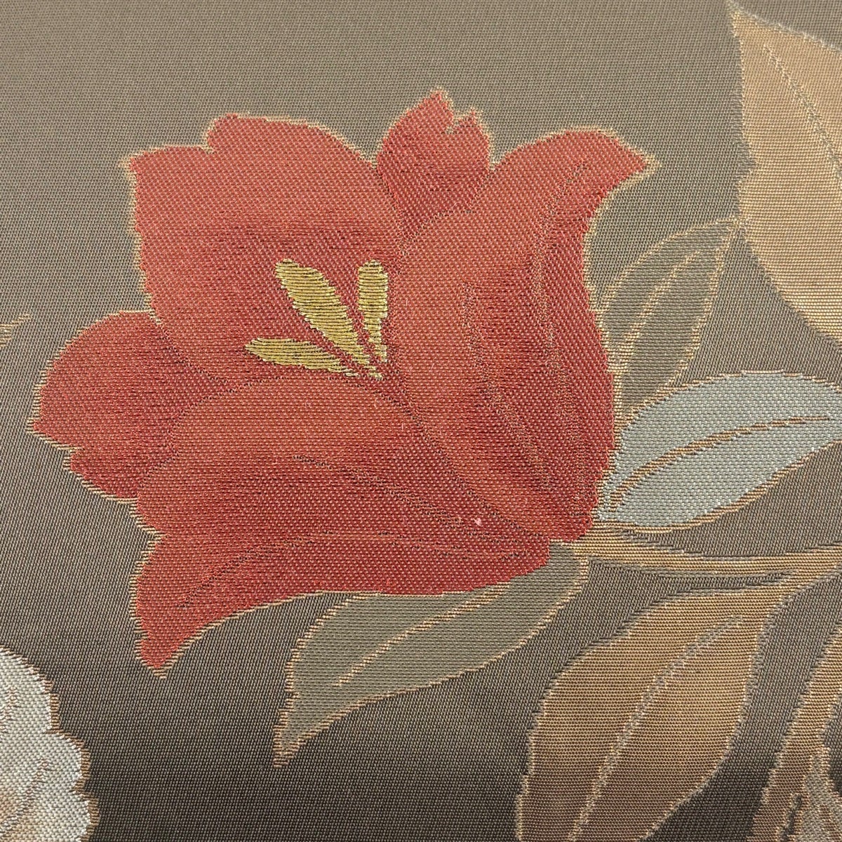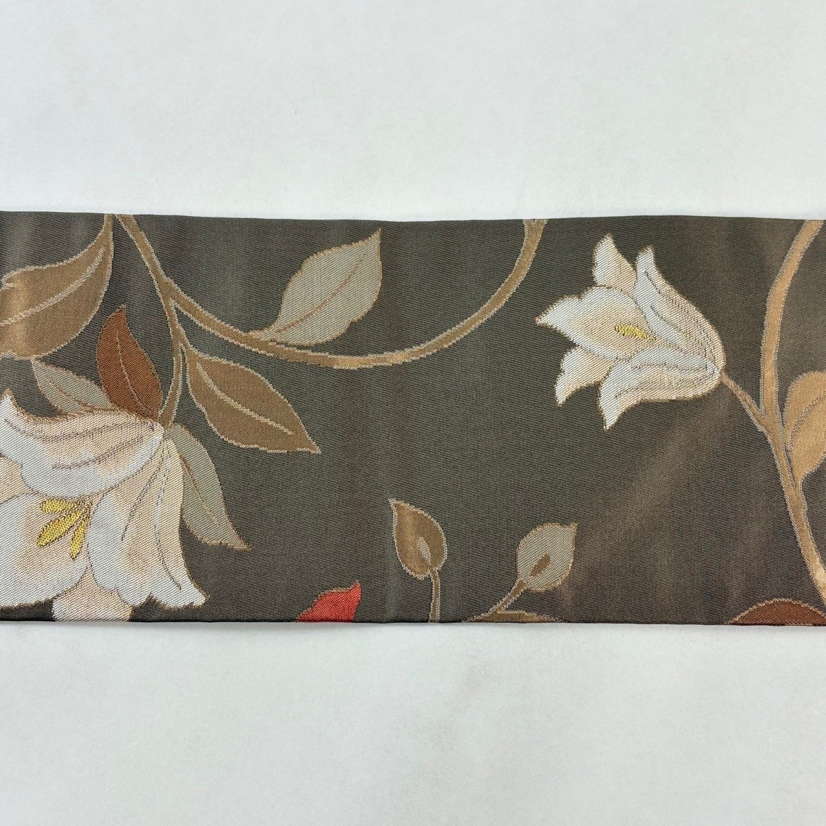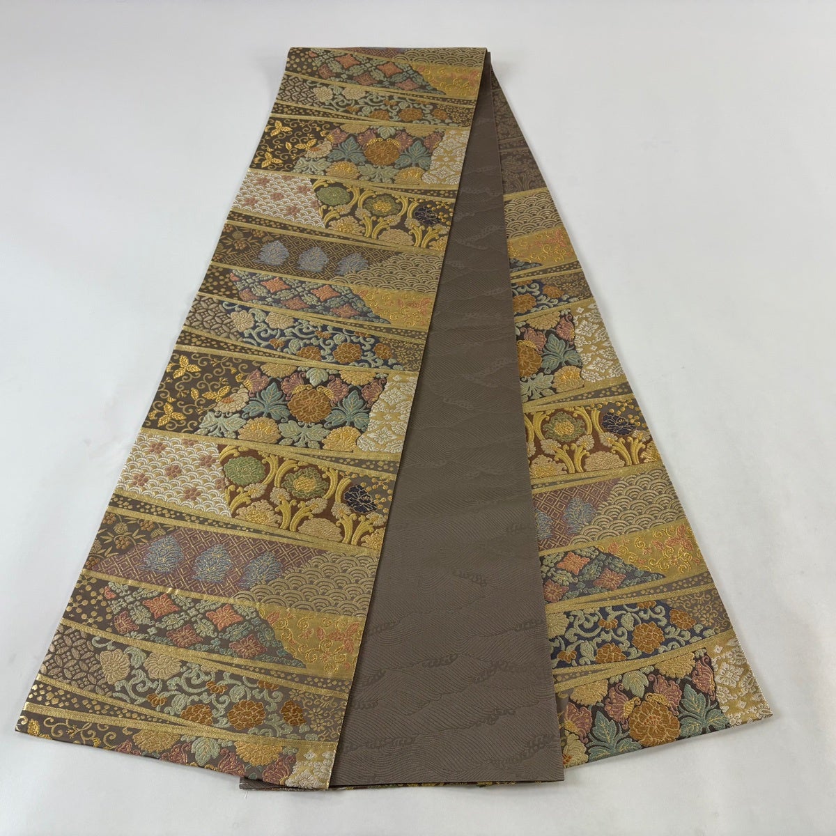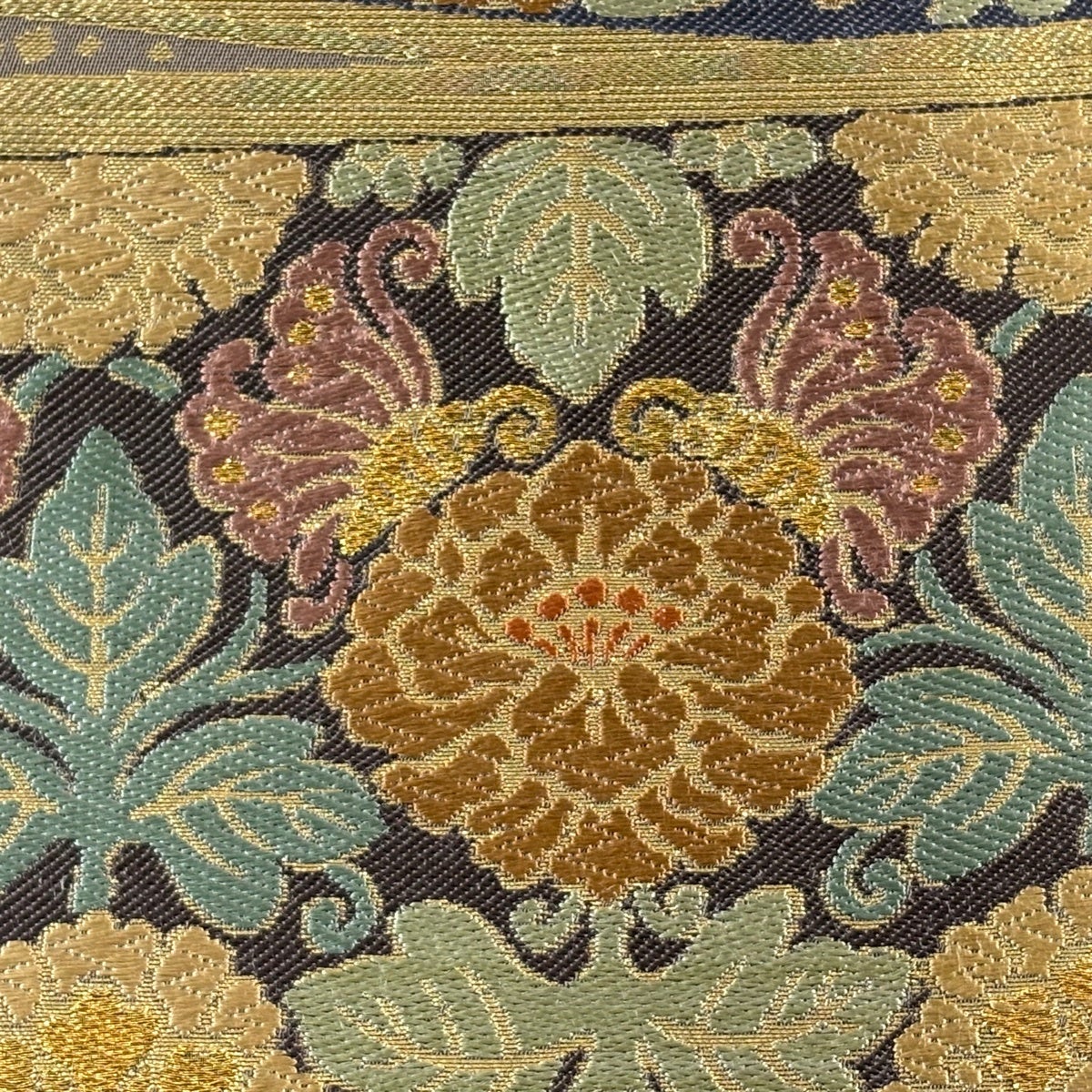 【美品】 袋帯 秀品 草花 有職文様 金糸 唐織 焦茶色 六通 正絹