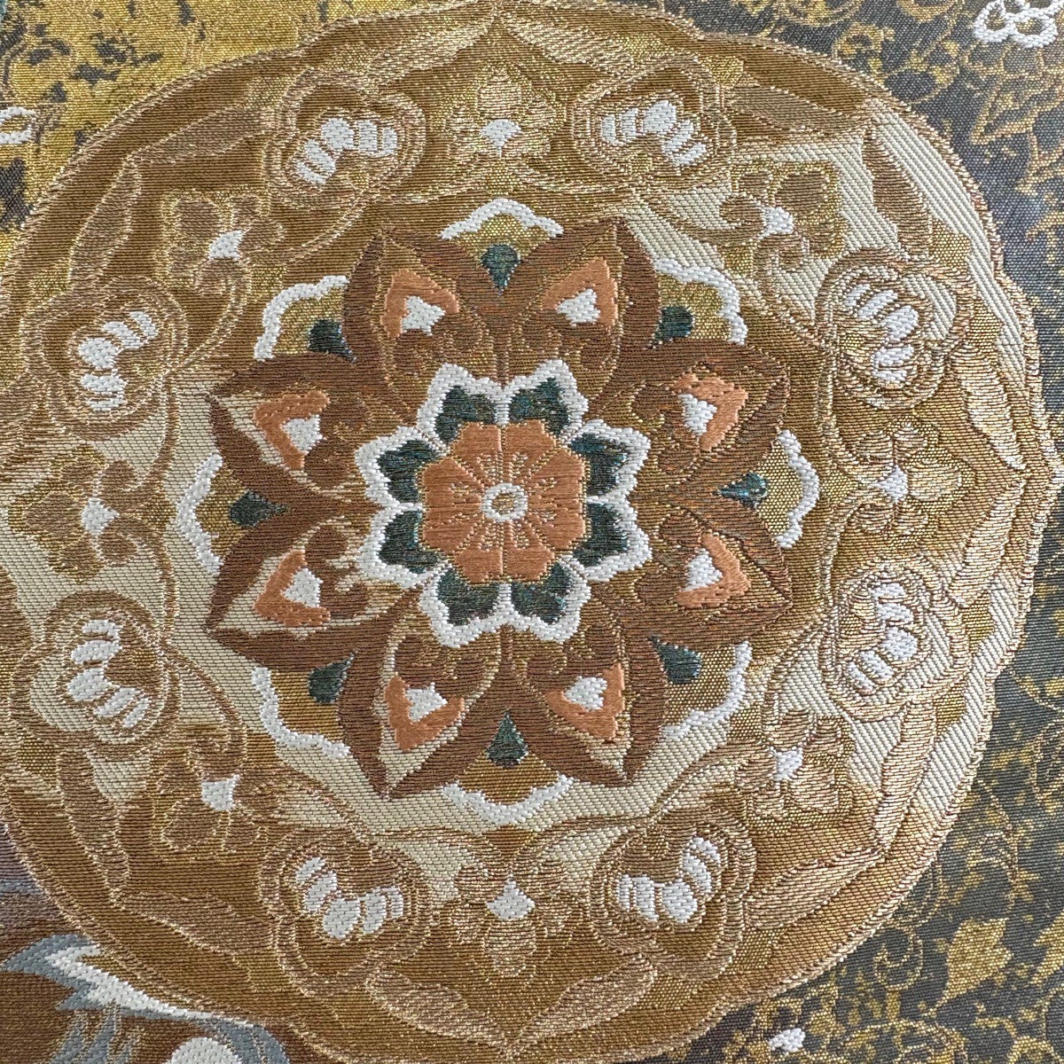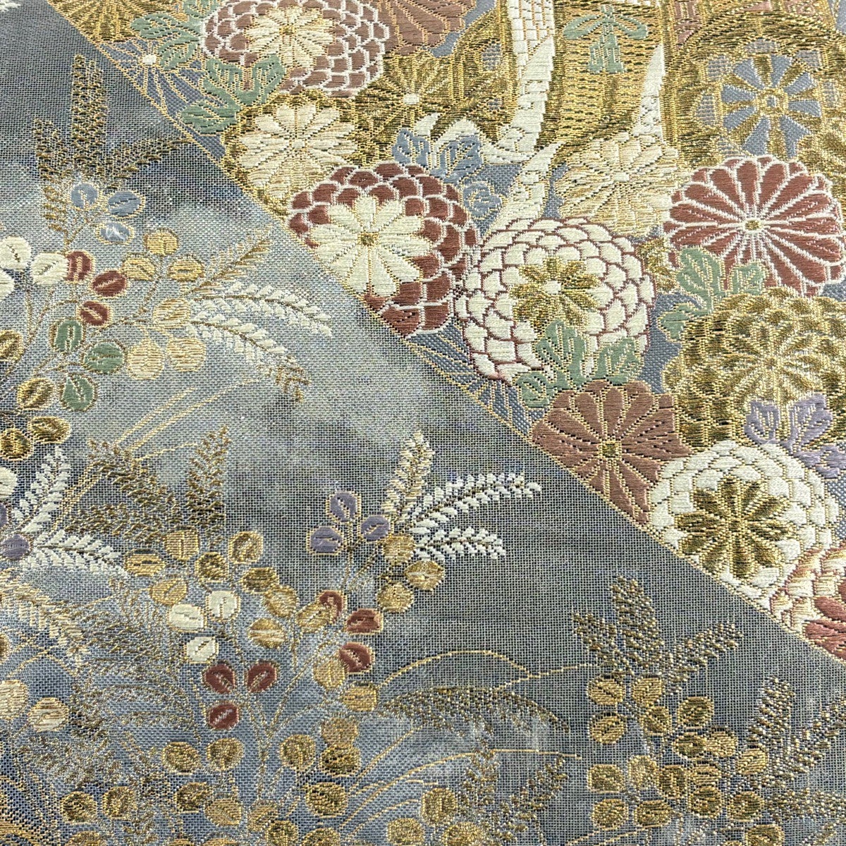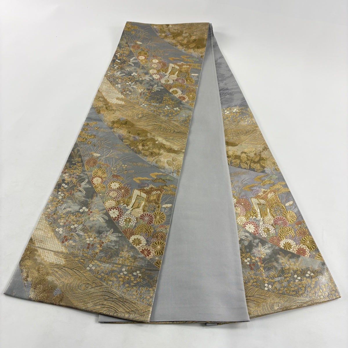 【美品】 袋帯 秀品 やまと 御所車 菊 箔 唐織 灰色 六通 正絹