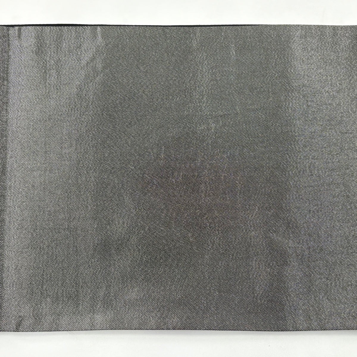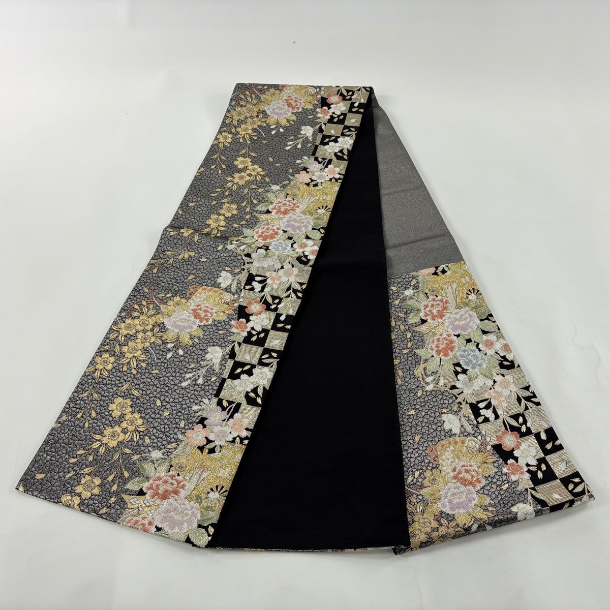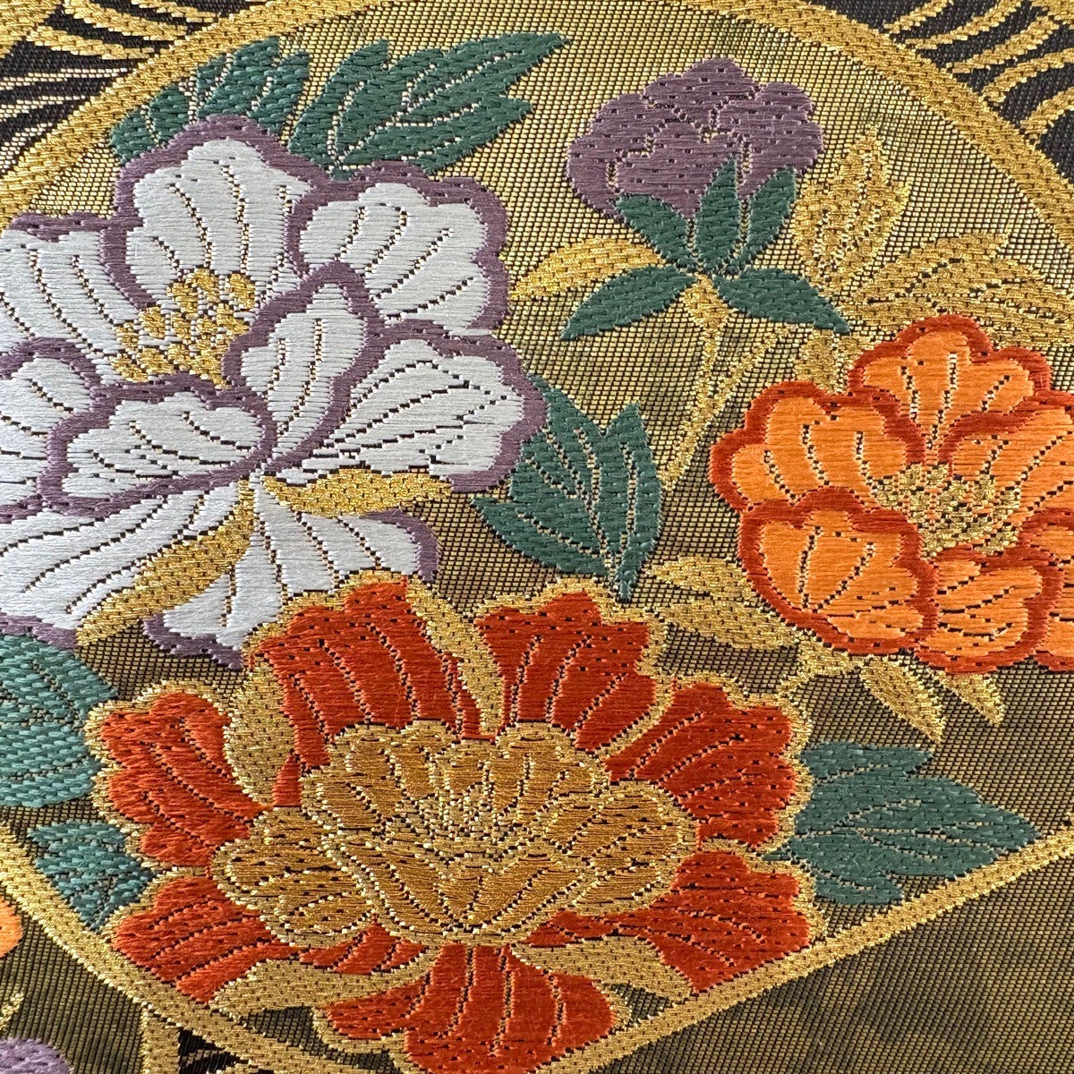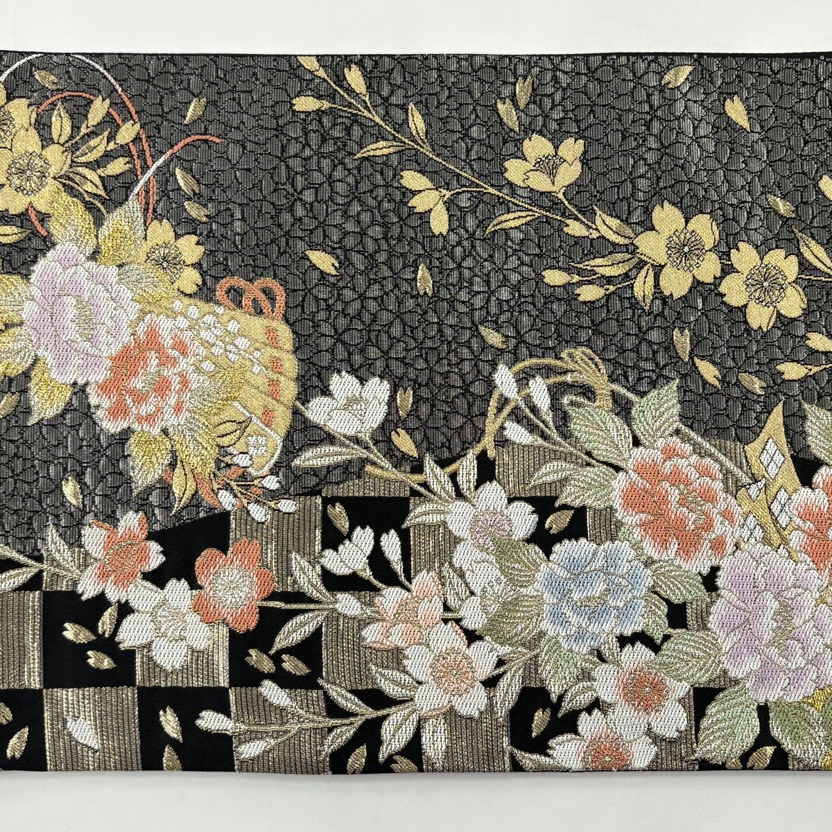 【美品】 袋帯 秀品 鈴乃屋 草花 花びら 銀糸 箔 黒 六通 正絹
