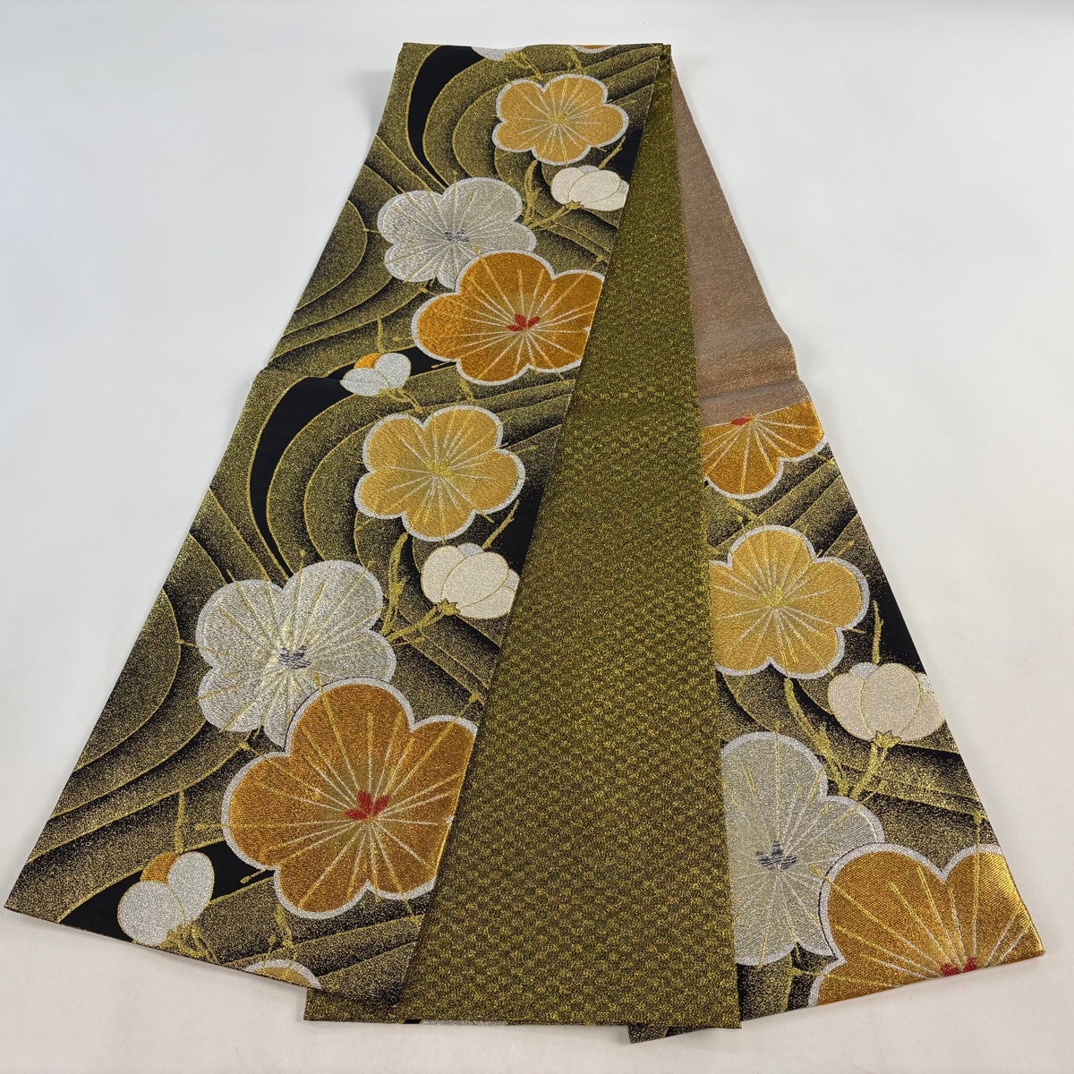 【美品】 袋帯 秀品 振袖向き 梅 熨斗 金銀糸 箔 金色 六通 正絹
