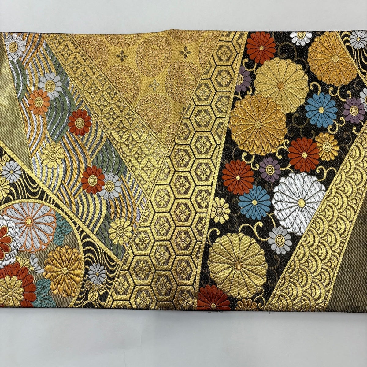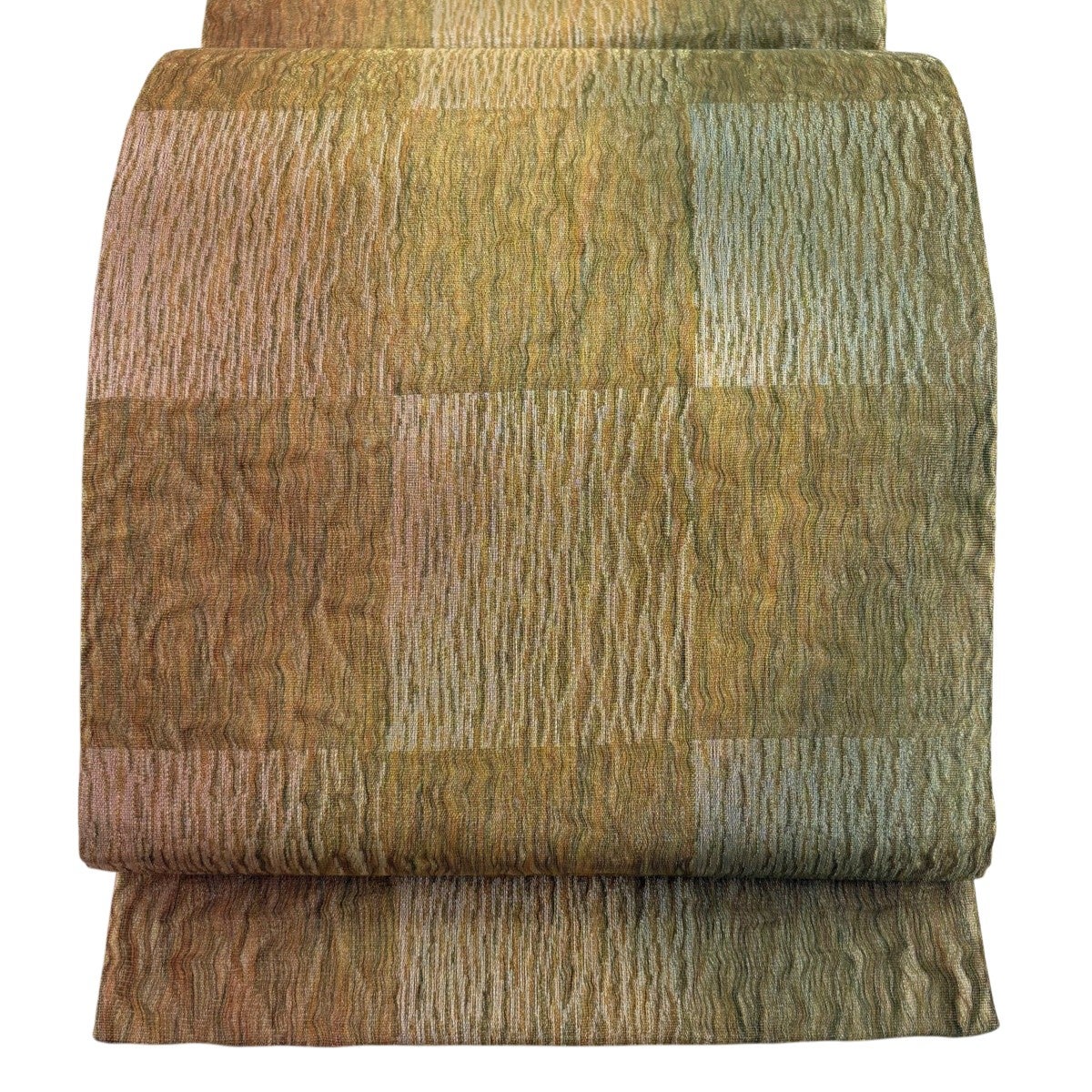 【美品】 袋帯 秀品 市松模様 よろけ縞 金糸 山吹茶色 全通 正絹
