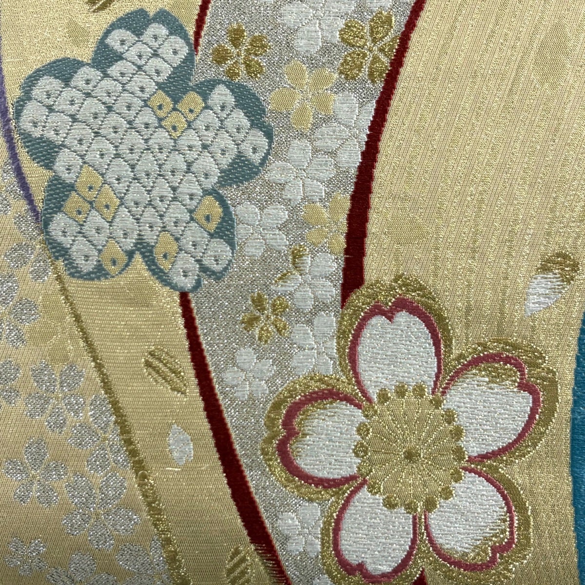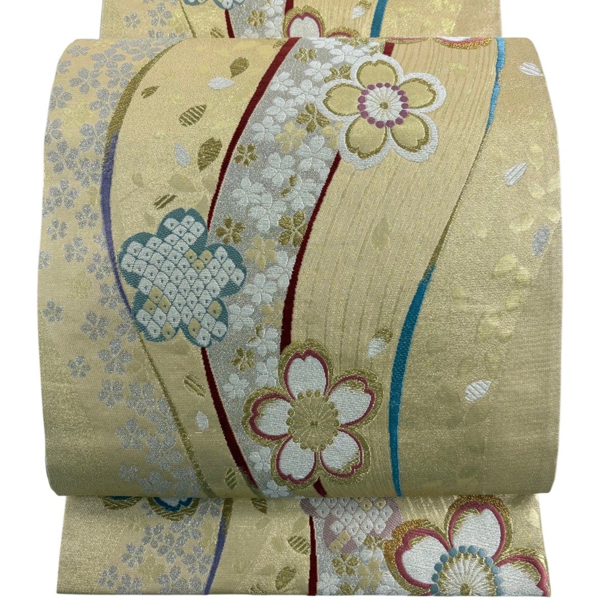 【美品】 袋帯 秀品 振袖向き 桜 花びら 金糸 箔 金色 六通 正絹