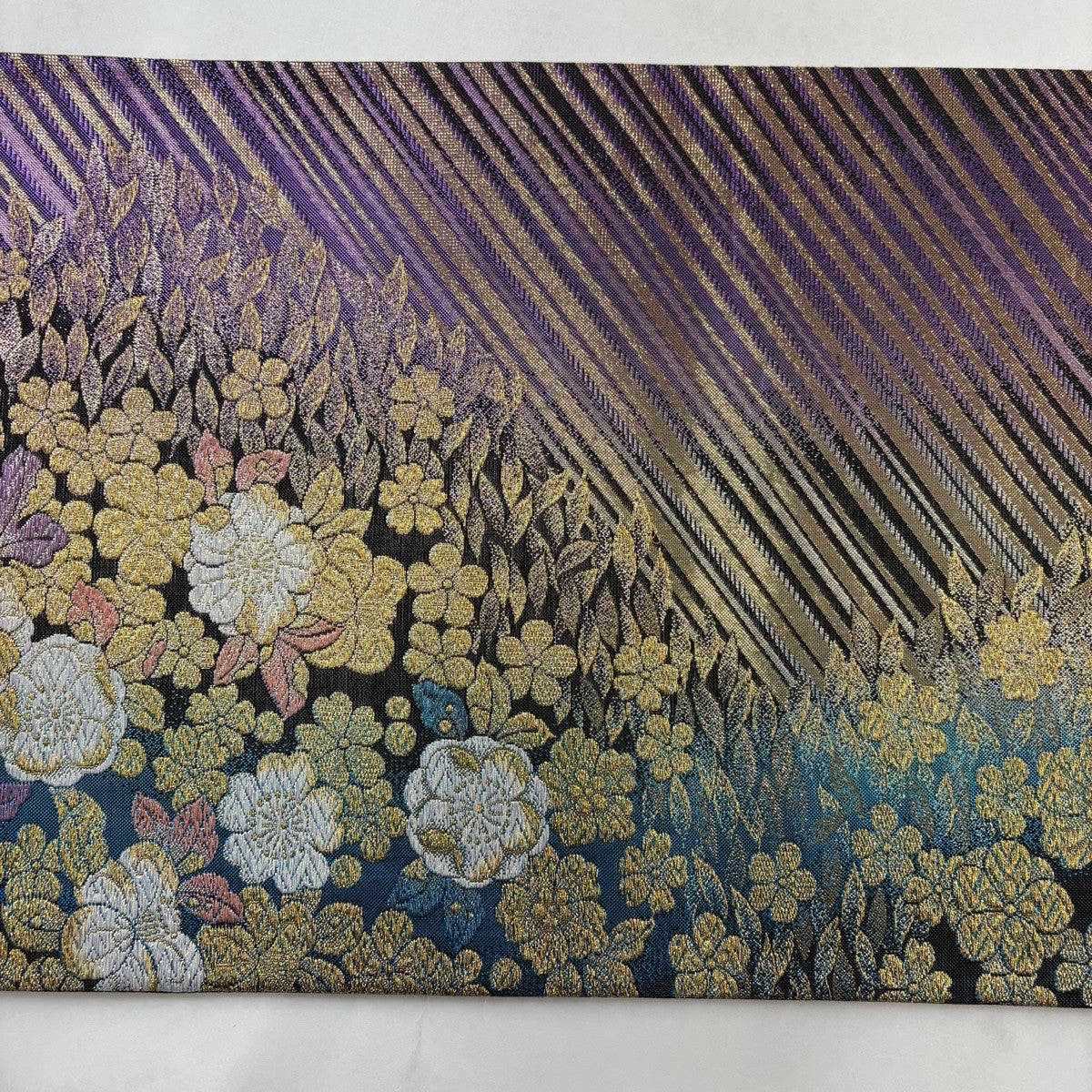 【美品】 袋帯 秀品 振袖向き 草花 斜縞 金糸 箔 紫 六通 正絹