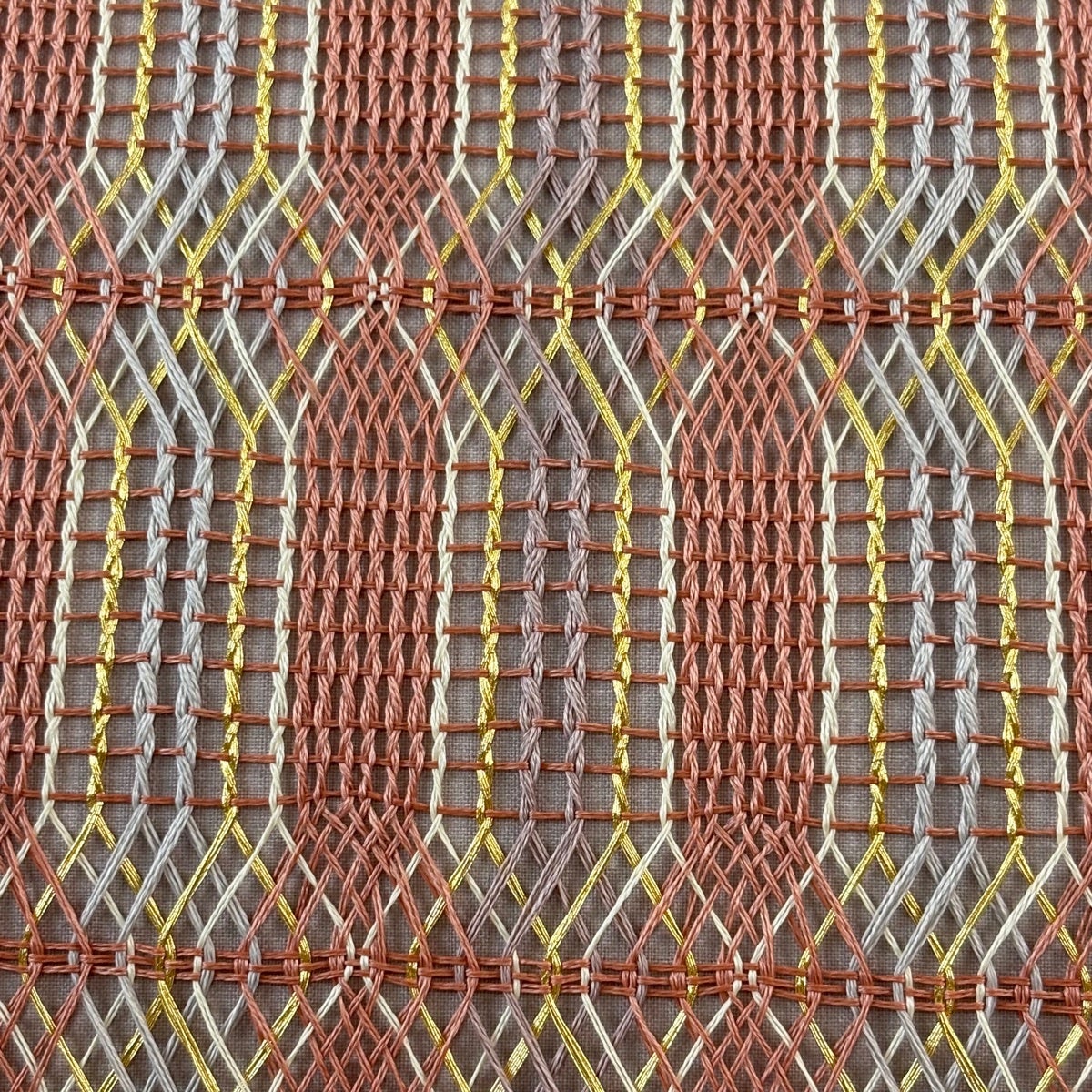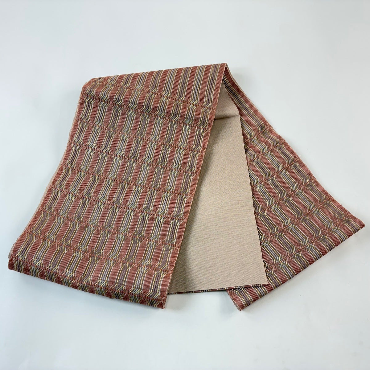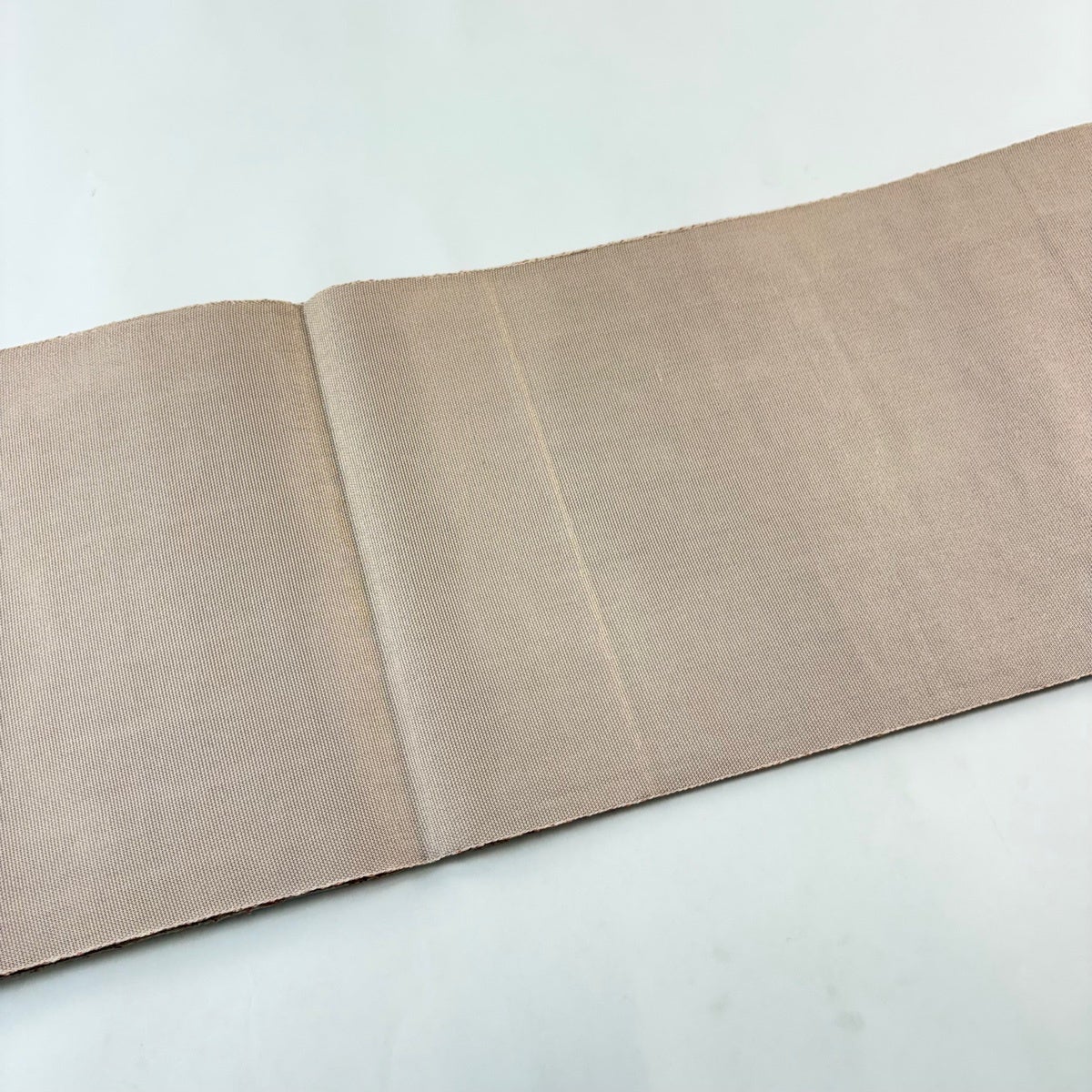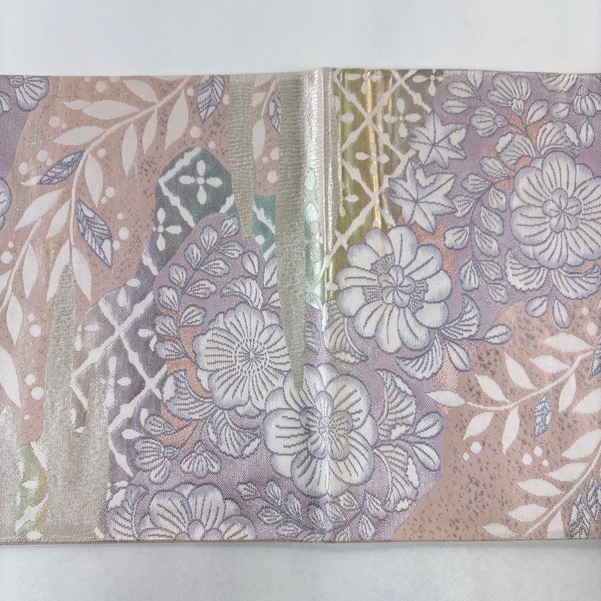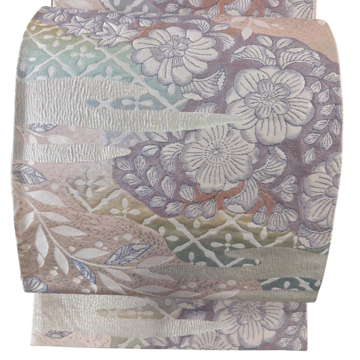 【美品】 袋帯 秀品 斜格子 組織 ピンクベージュ 全通 正絹