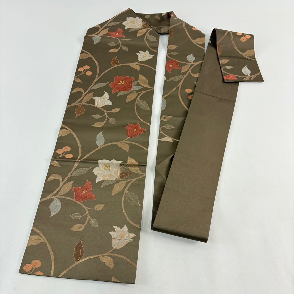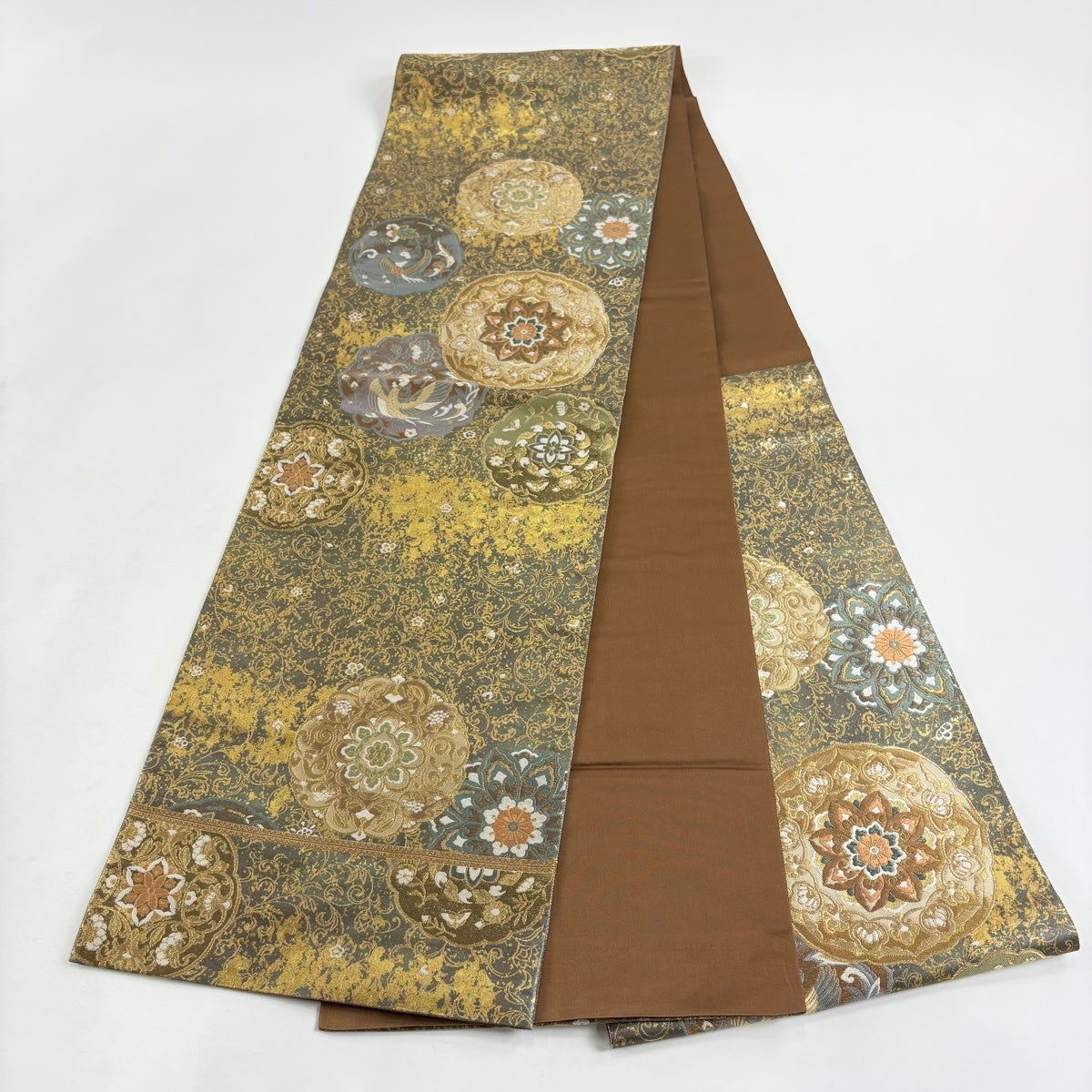 【美品】 名古屋帯 秀品 落款あり 関西仕立て 草花 箔 茶色 正絹
