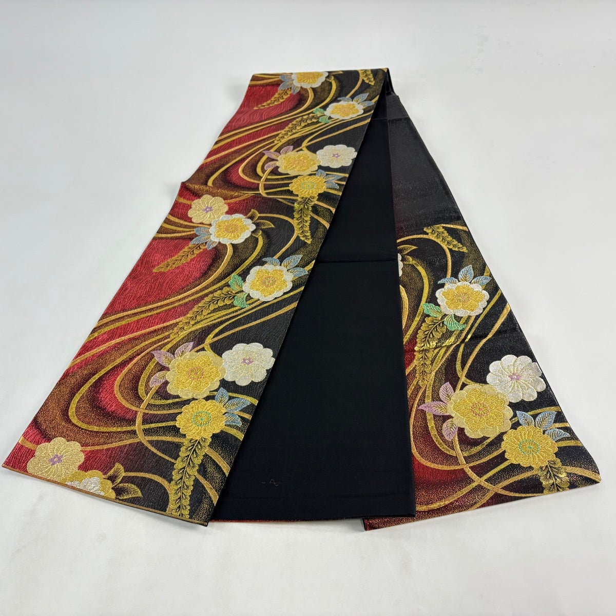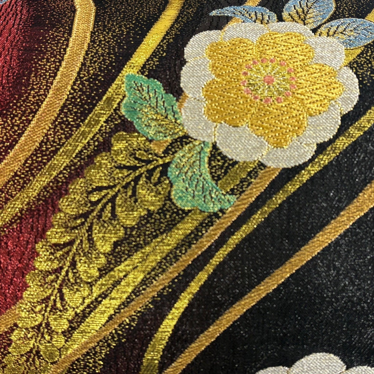 【美品】 袋帯 秀品 振袖向き 梅 流水 箔 金銀糸 黒 六通 正絹