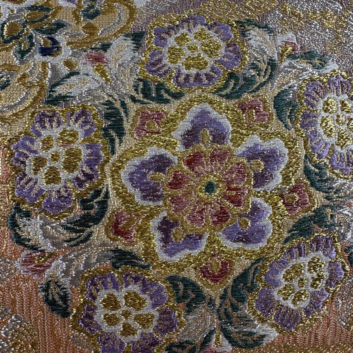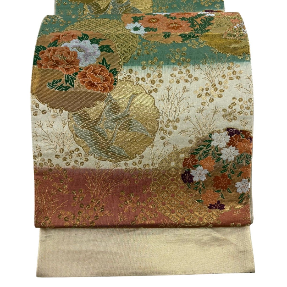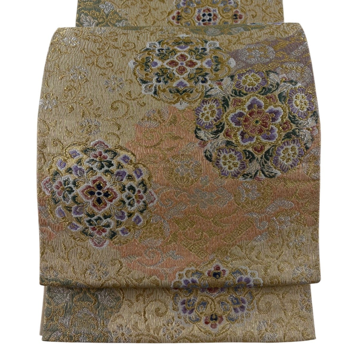 袋帯 秀品 織彩吉祥錦 花 花唐草 金糸 金彩 ベージュ 六通 正絹