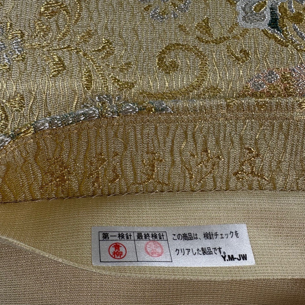 袋帯 秀品 証紙あり 草花 七宝 金糸 箔 ベージュ 六通 正絹
