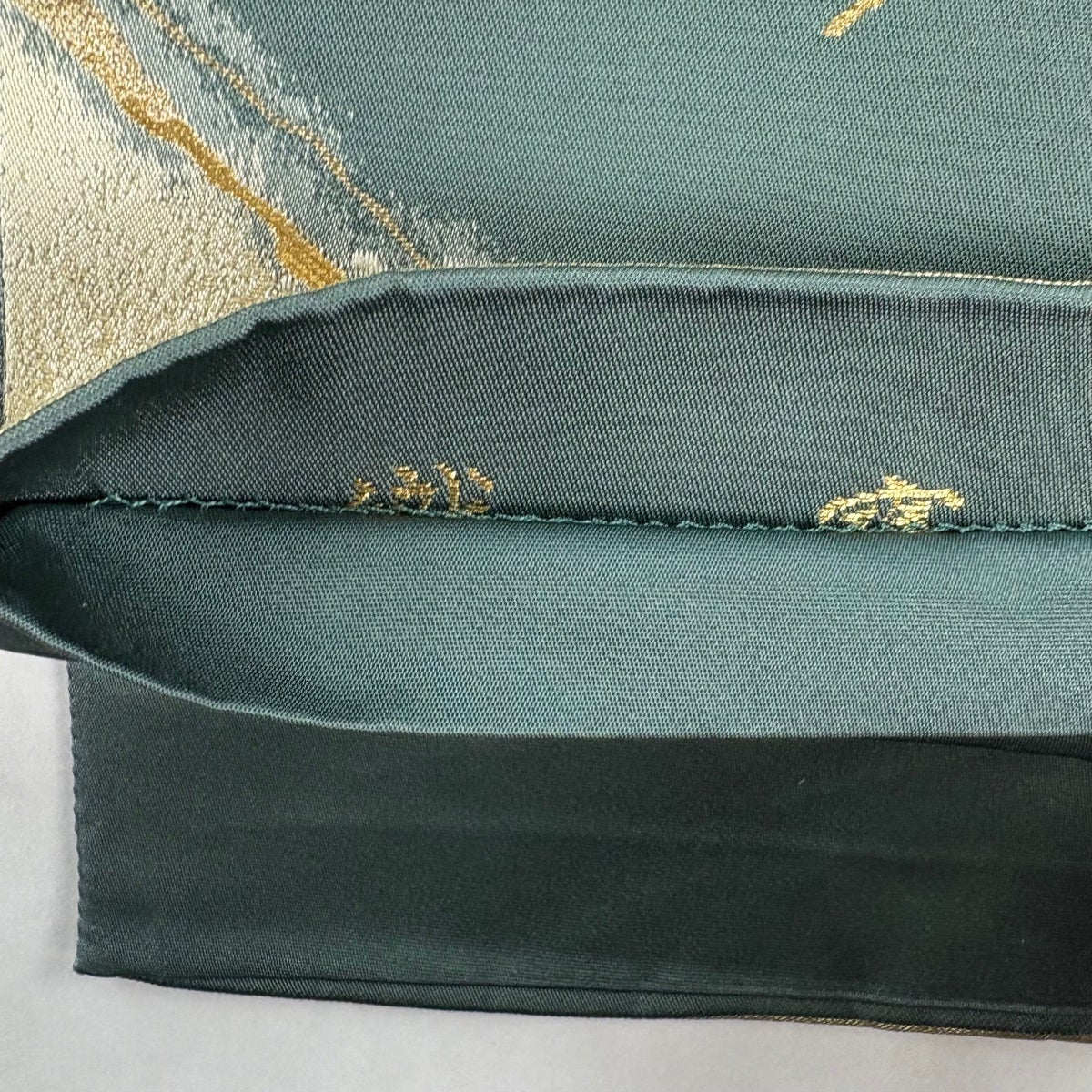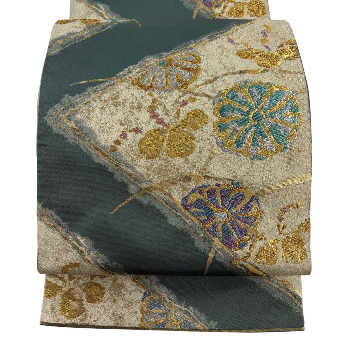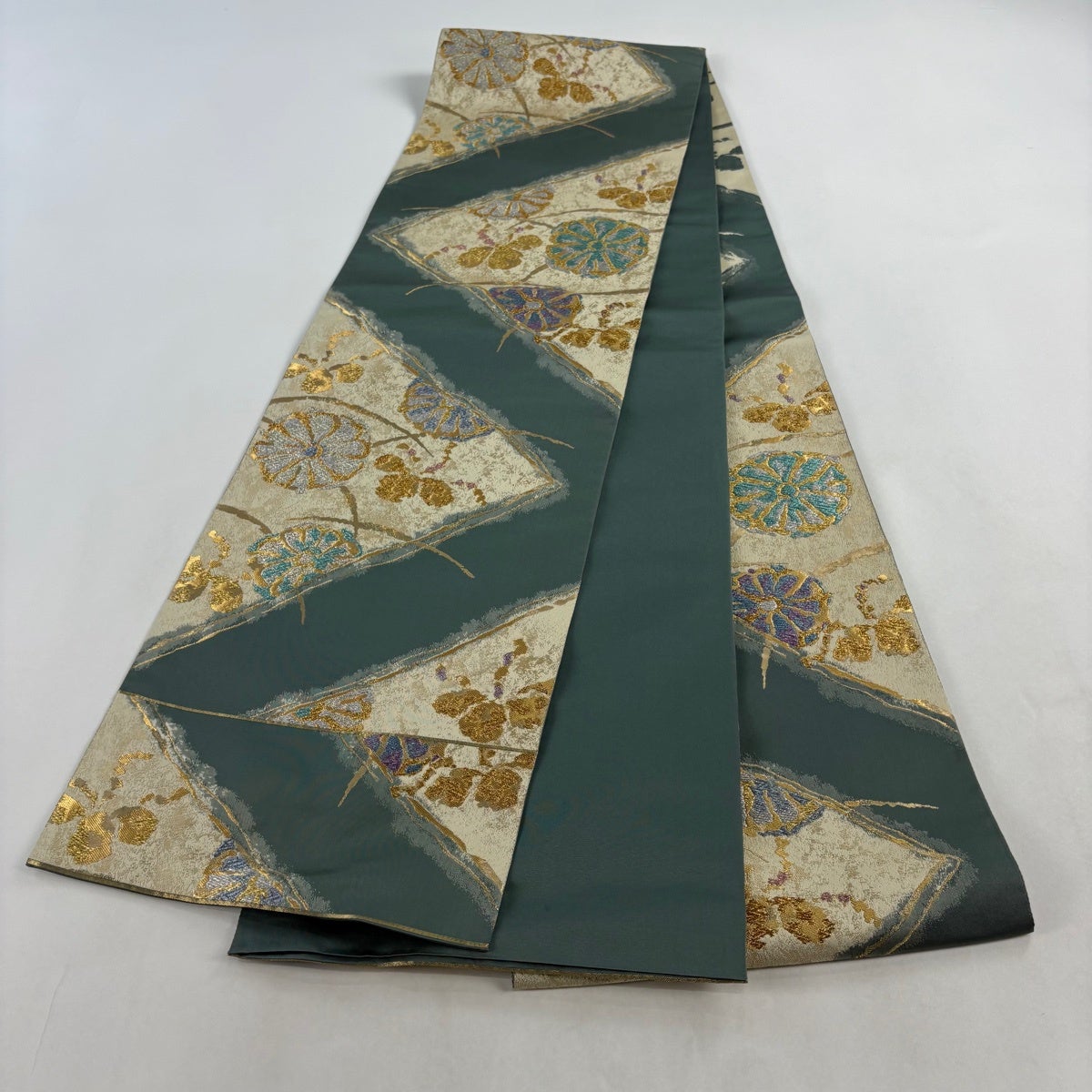 【美品】 袋帯 秀品 関西仕立て 菊 桐 金糸 箔 灰緑 六通 正絹