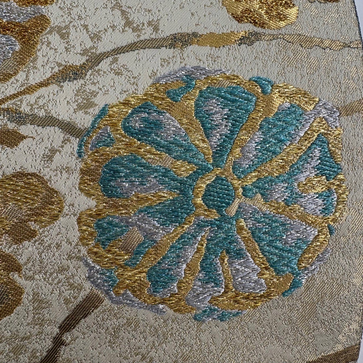 【美品】 袋帯 秀品 華文 草花 金銀糸 刺繍 クリーム 六通 正絹