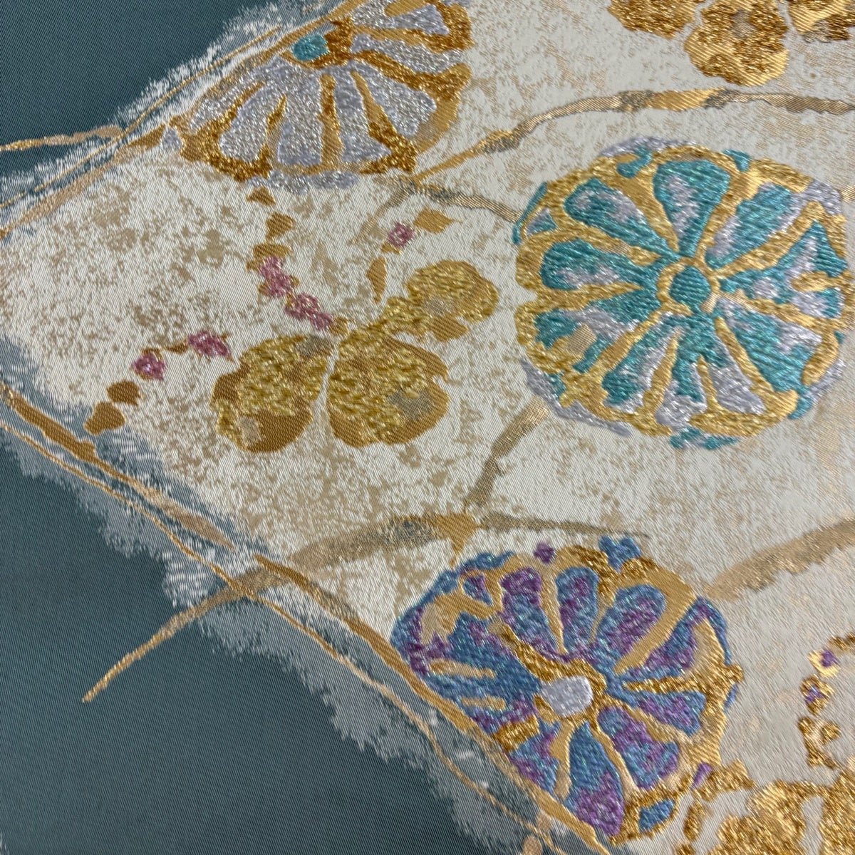 【美品】 袋帯 秀品 吹寄せ花の丸 金銀糸 唐織 青灰色 六通 正絹
