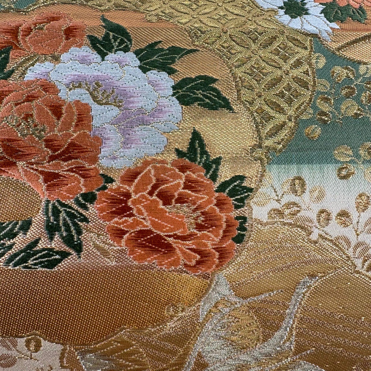 【美品】 袋帯 秀品 振袖向き 華文 草花 箔 金糸 金色 六通 正絹