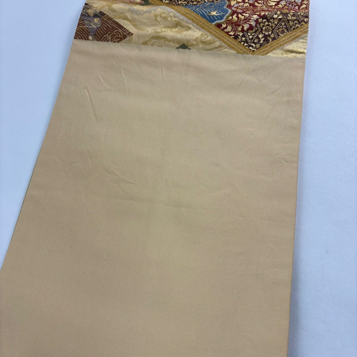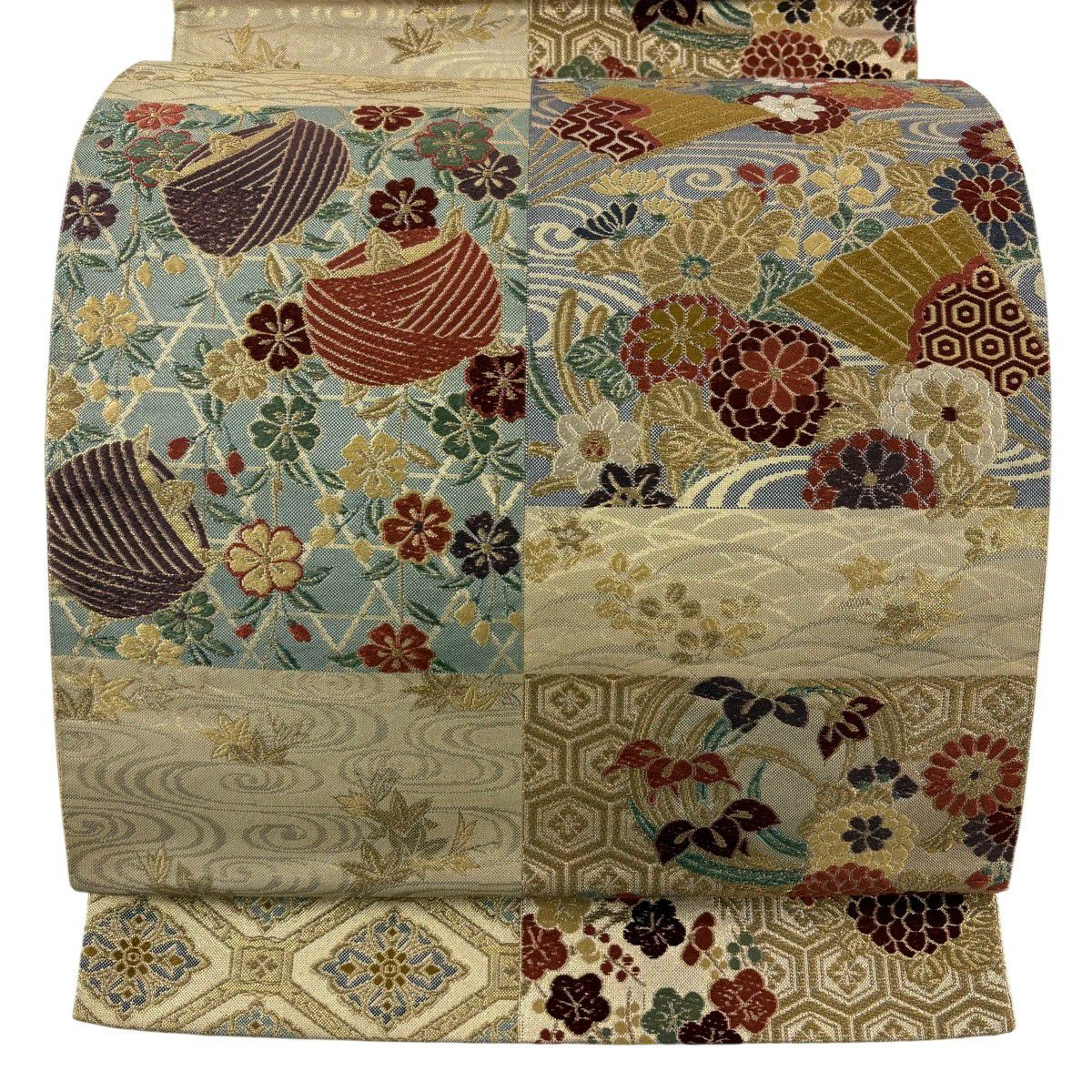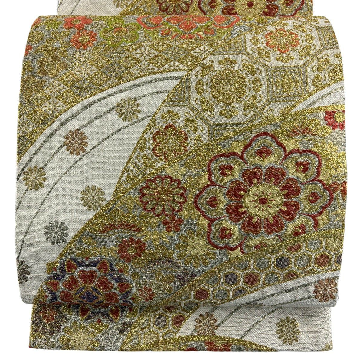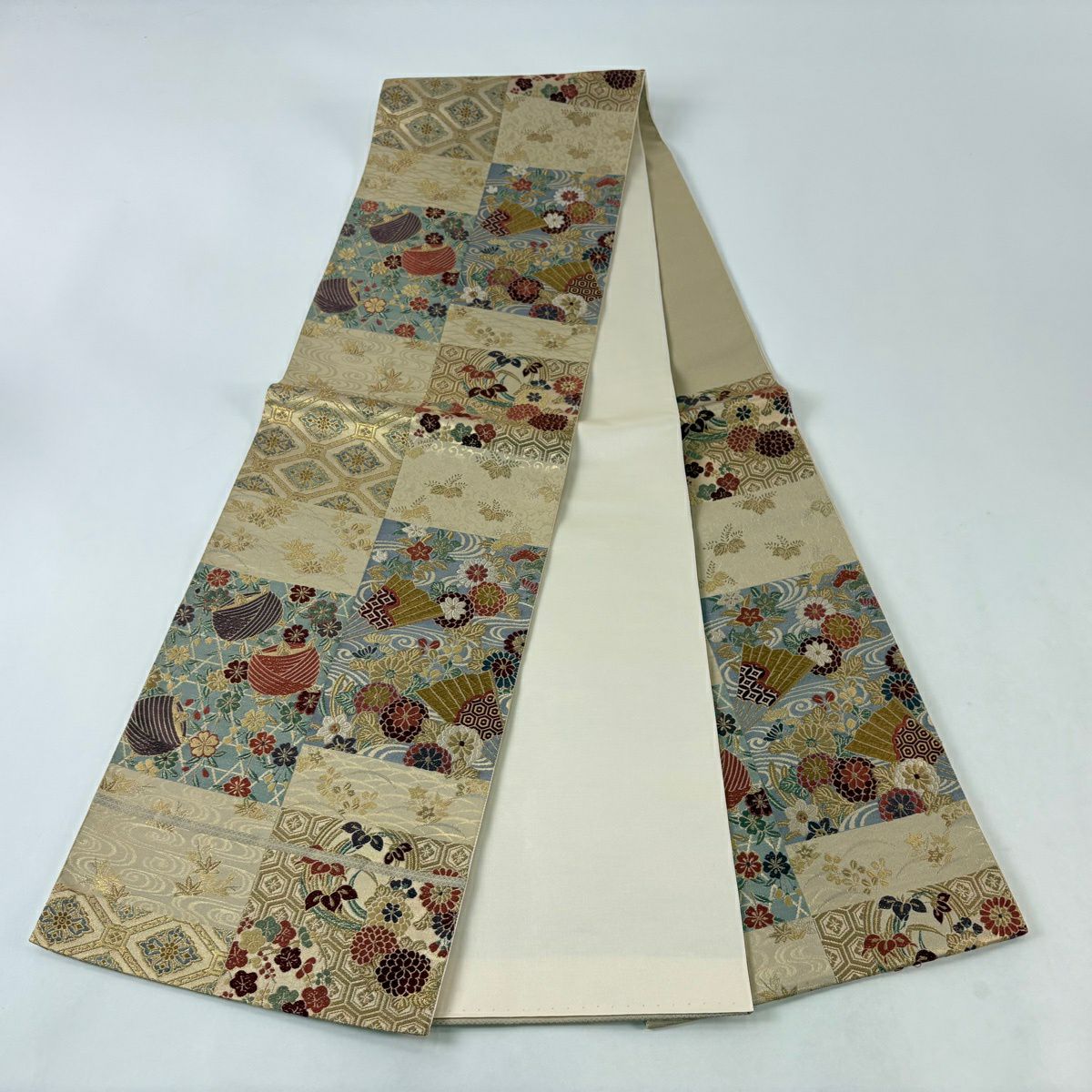 【美品】 袋帯 秀品 扇面 草花 金銀糸 ベージュ お太鼓柄 正絹