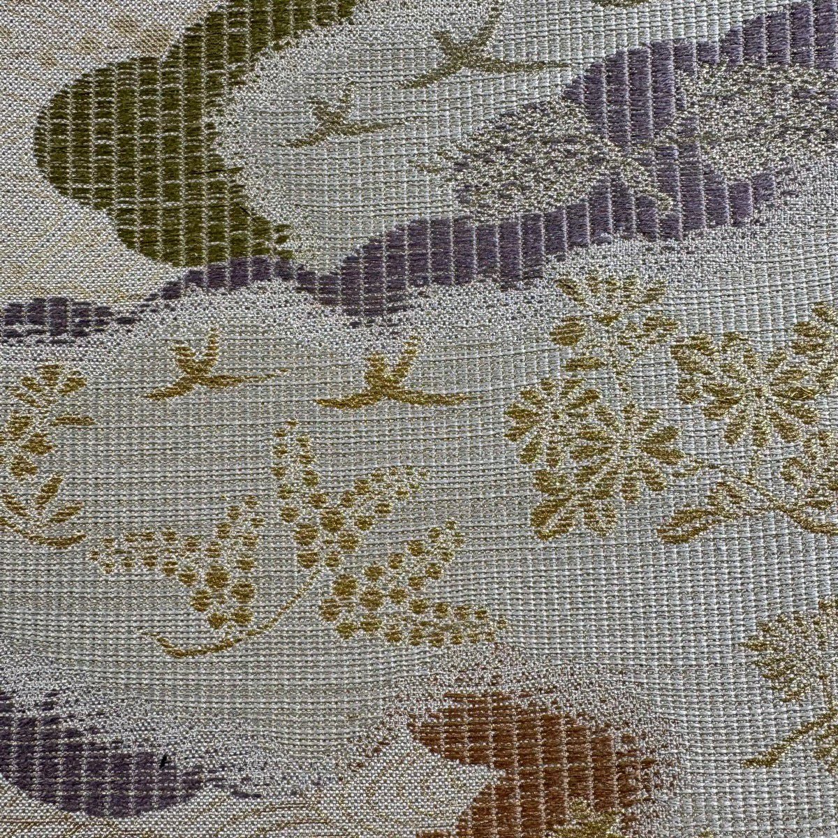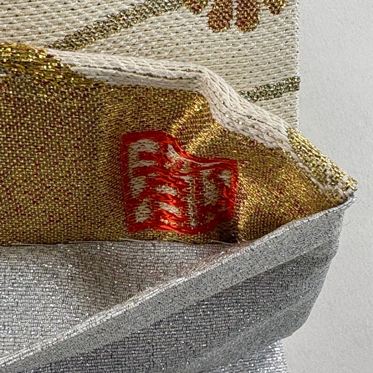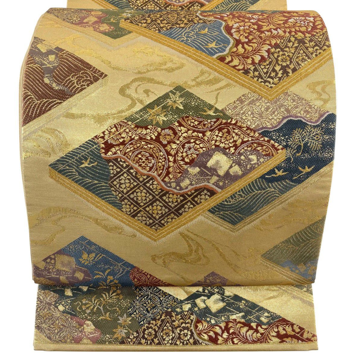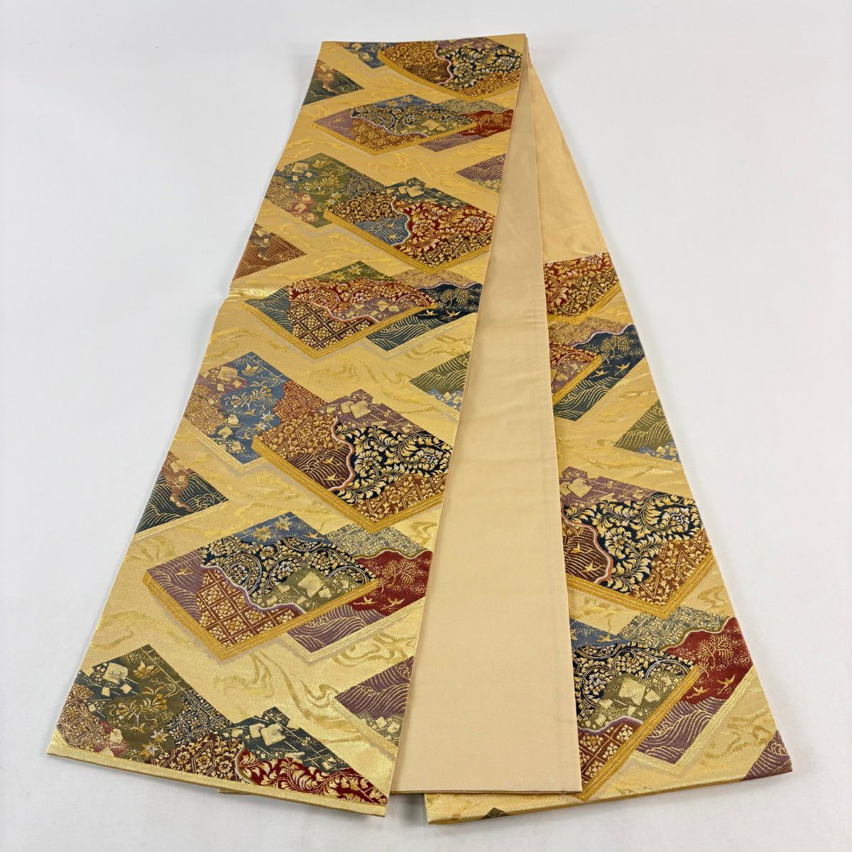 【美品】 袋帯 秀品 扇面 草花 金銀糸 ベージュ お太鼓柄 正絹