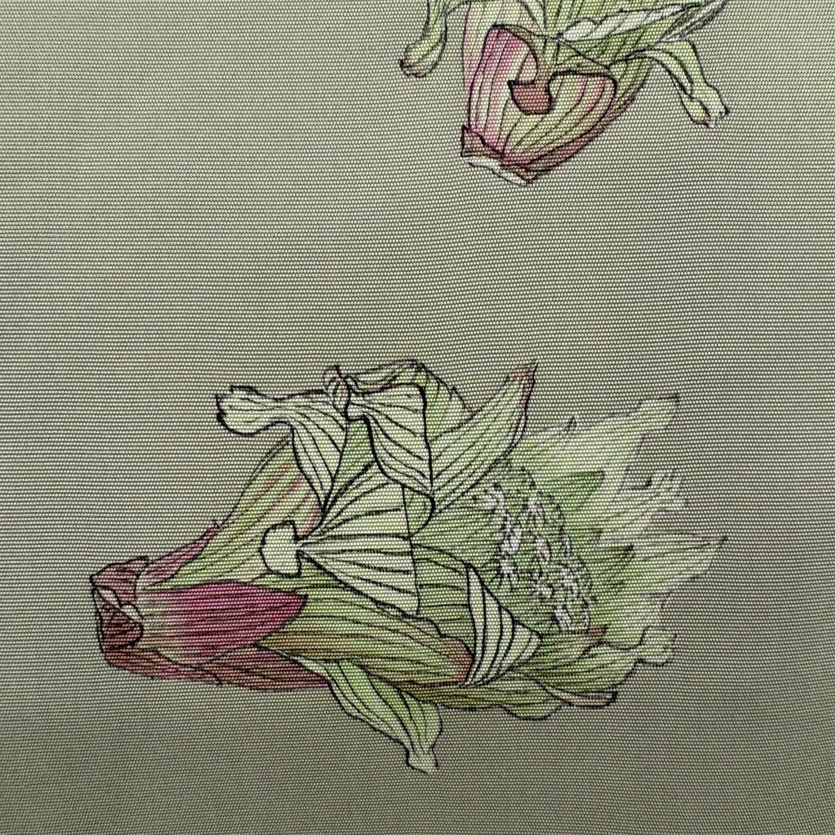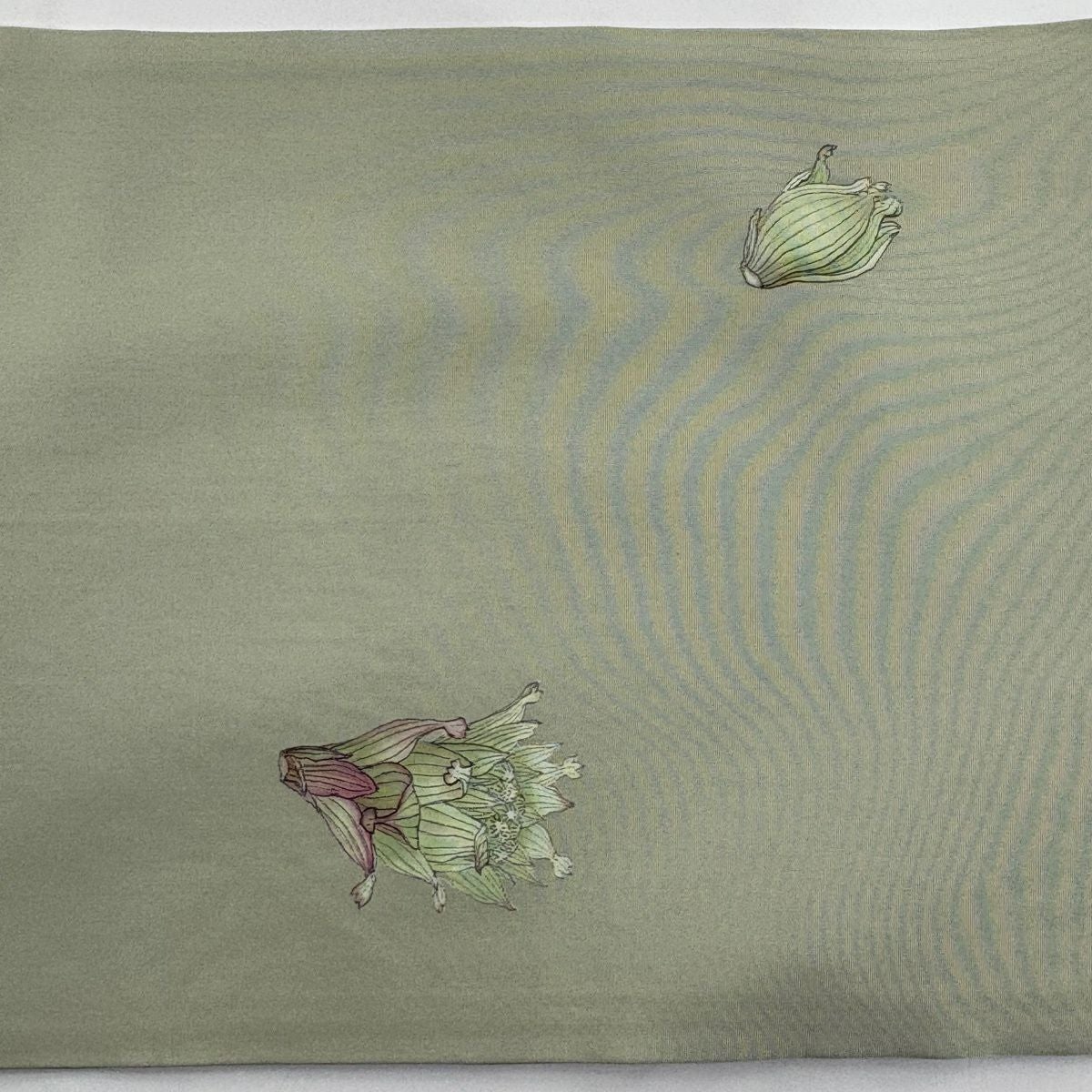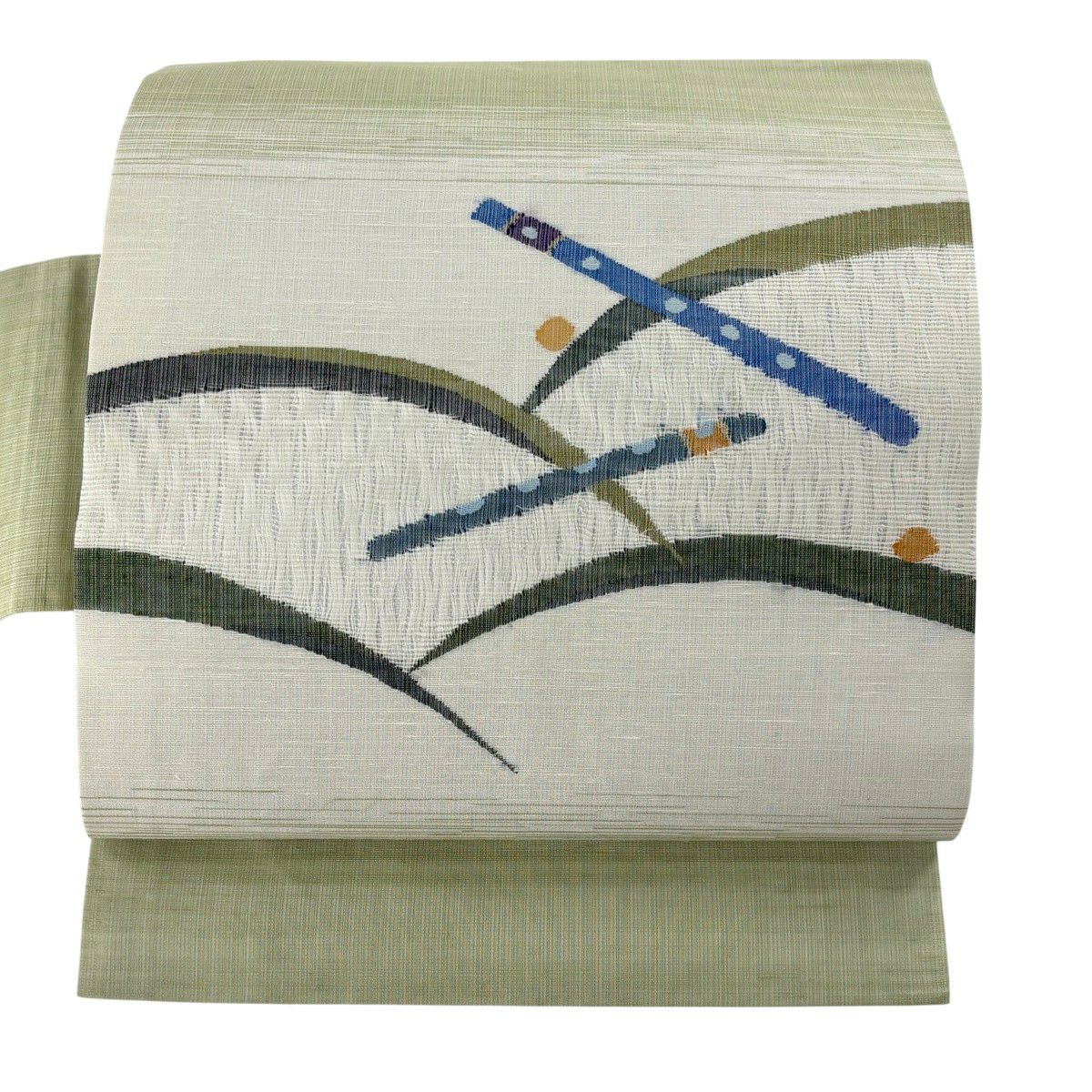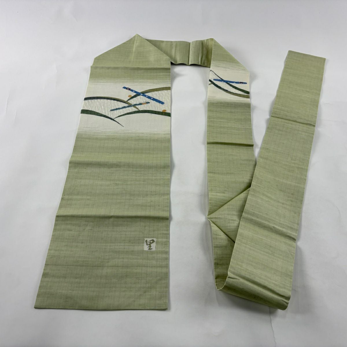 【美品】 開き名古屋帯 秀品 落款あり 鈴乃屋 ふきのとう 灰緑 正絹