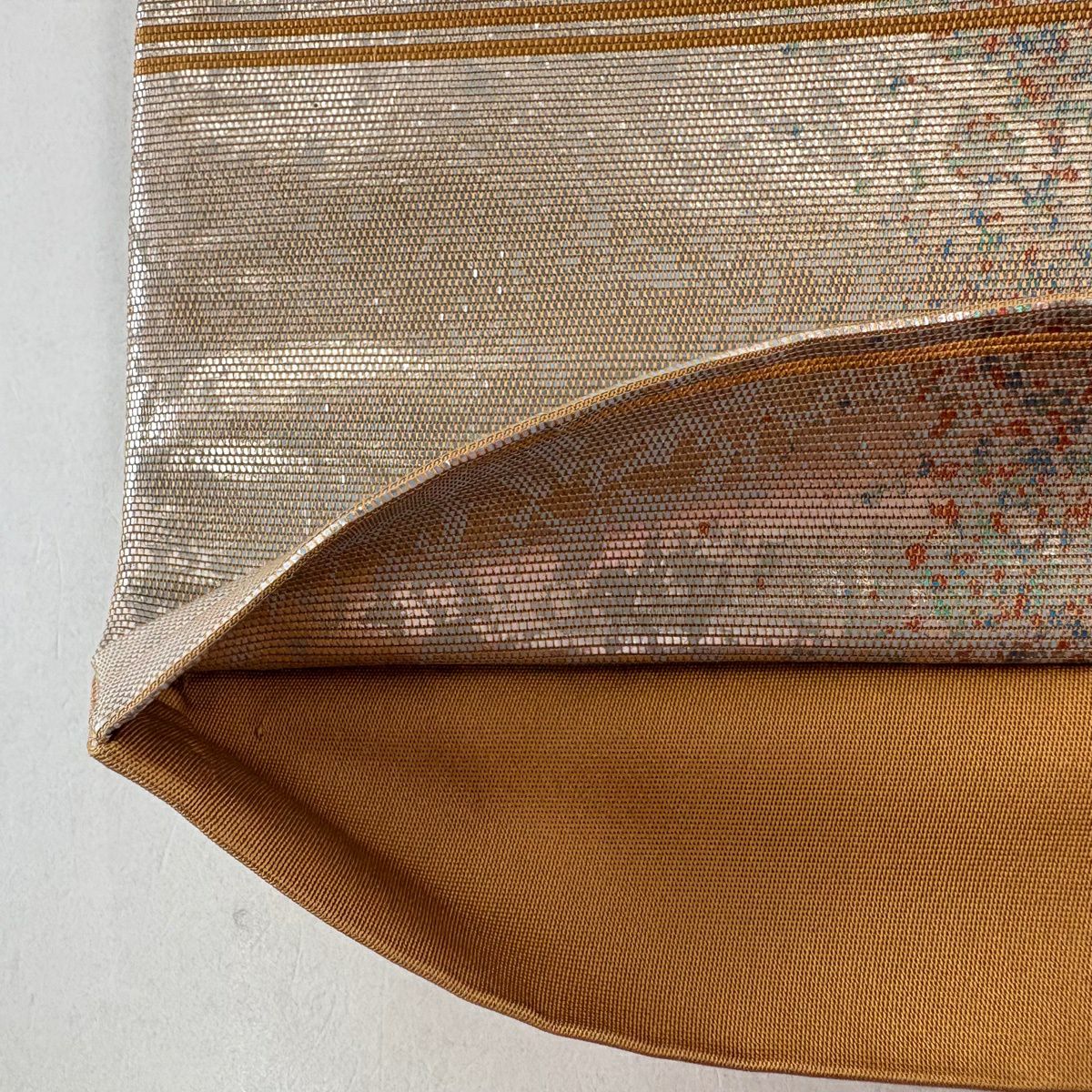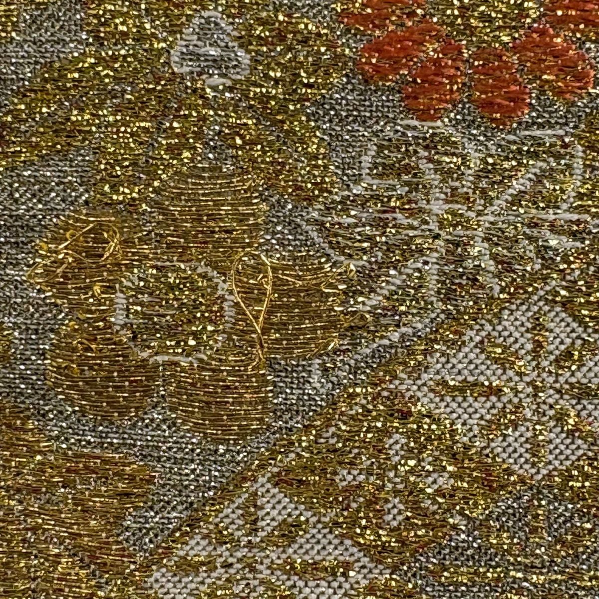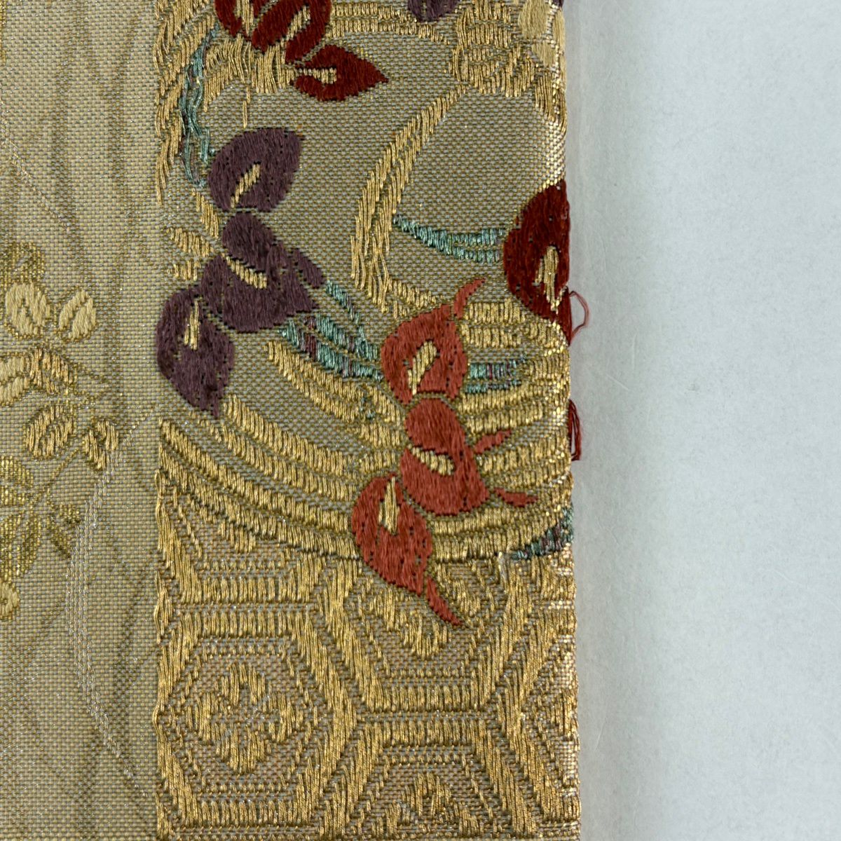 【美品】 袋帯 秀品 糸巻き 草花 金糸 箔 ベージュ 六通 正絹