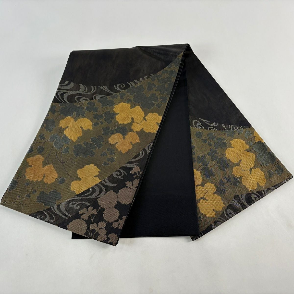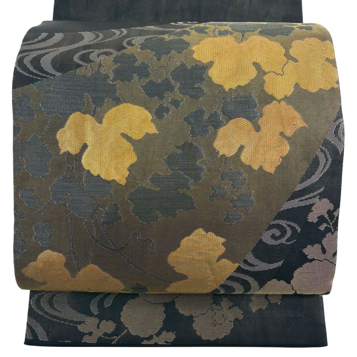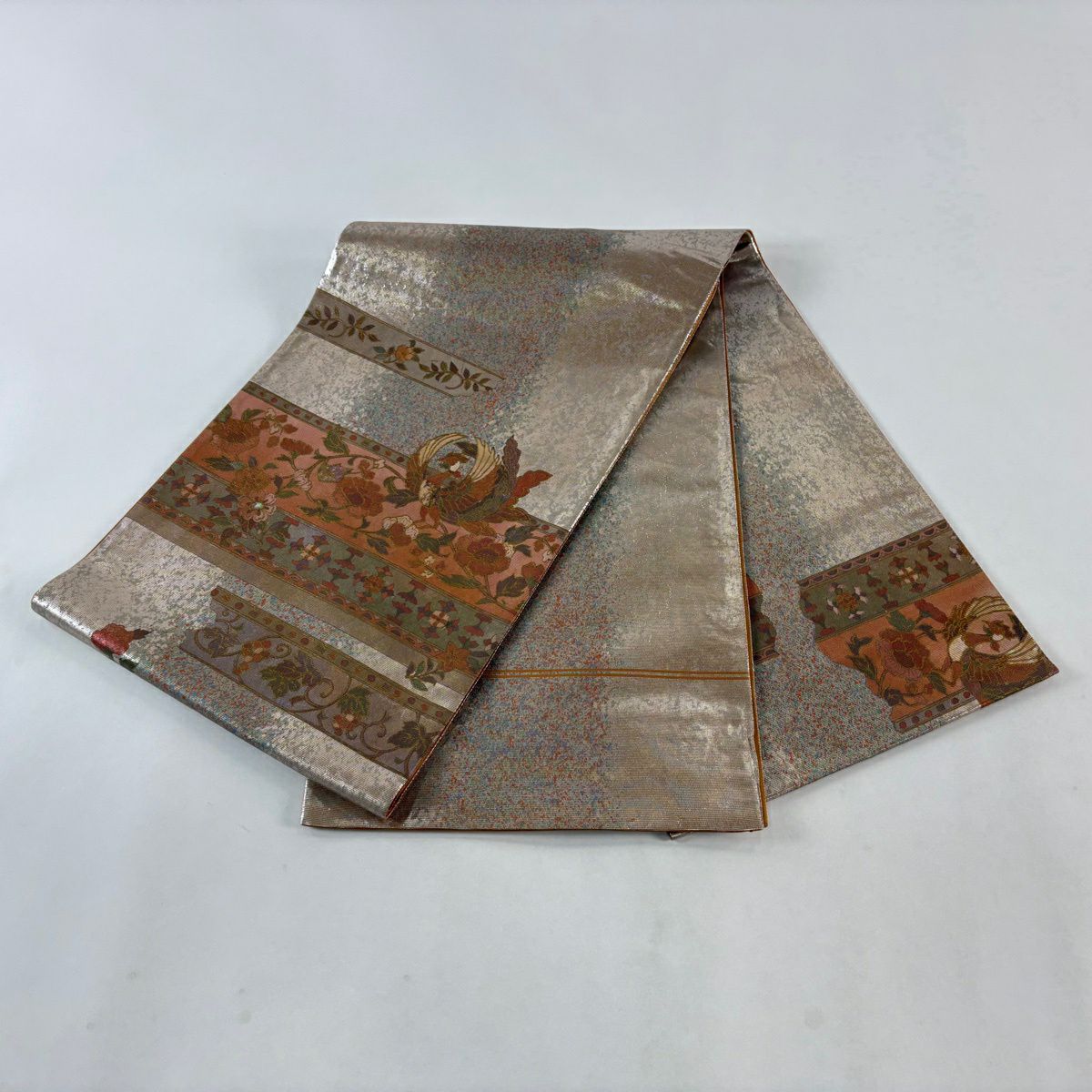 【美品】 袋帯 秀品 花鳥 葡萄唐草 螺鈿箔 箔 茶色 お太鼓柄 正絹