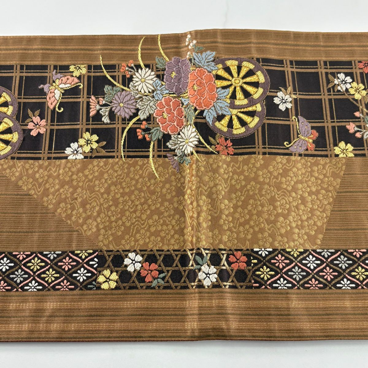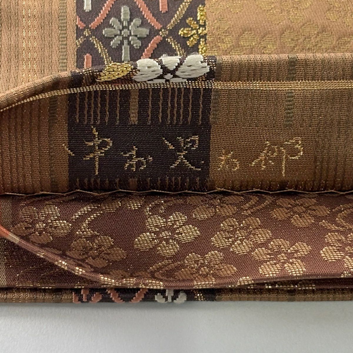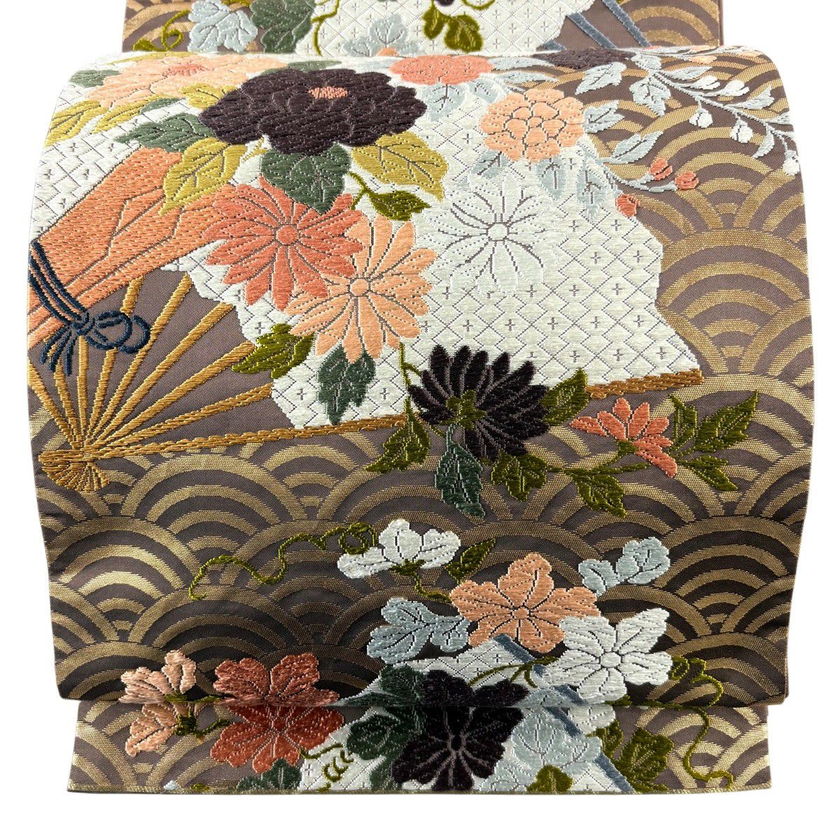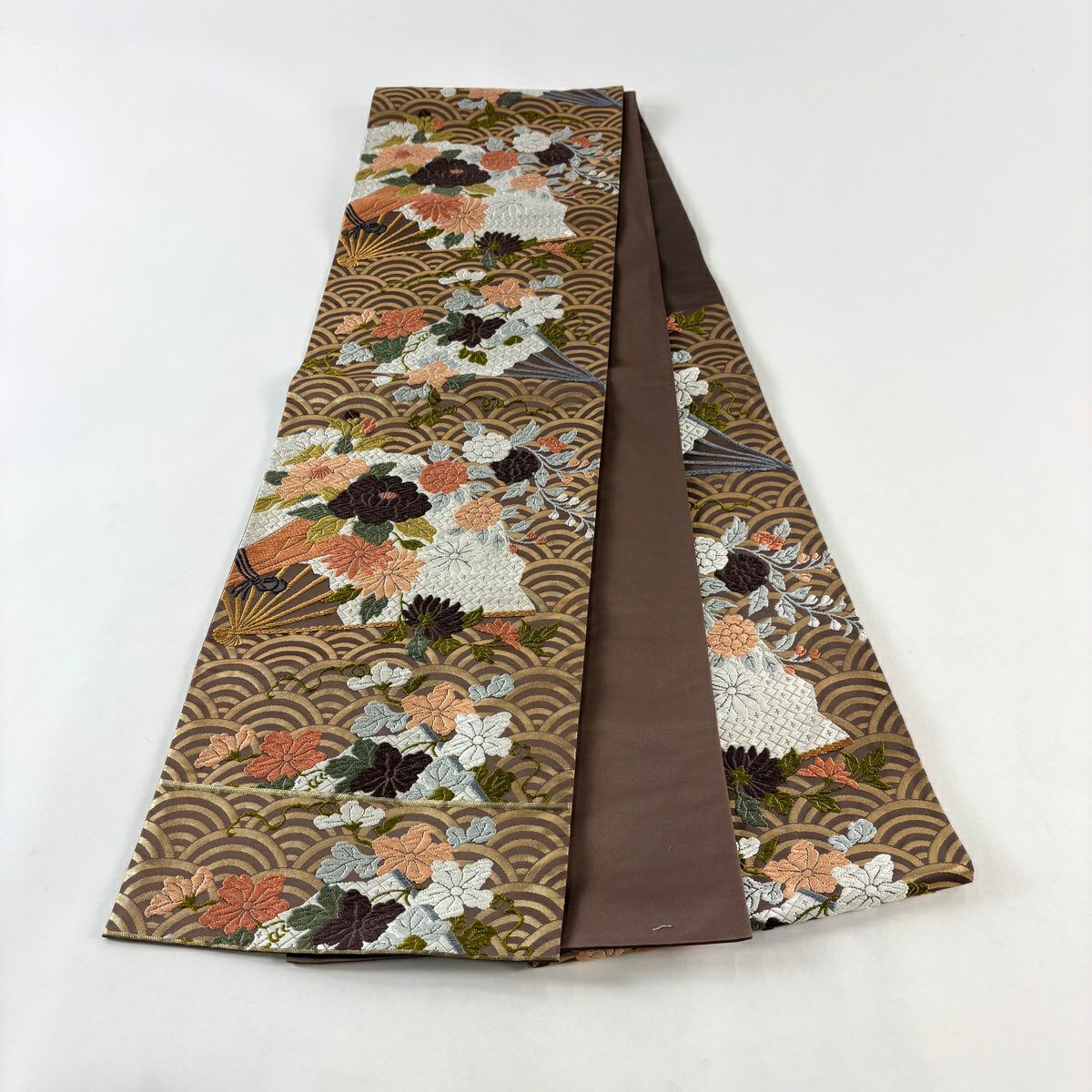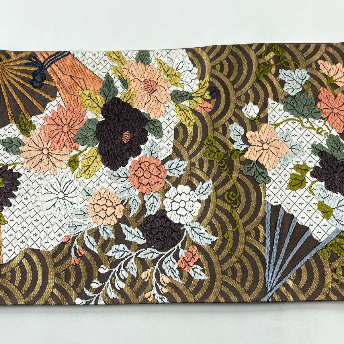 【美品】 袋帯 秀品 関西仕立て 扇 草花 箔 唐織 茶色 六通 正絹