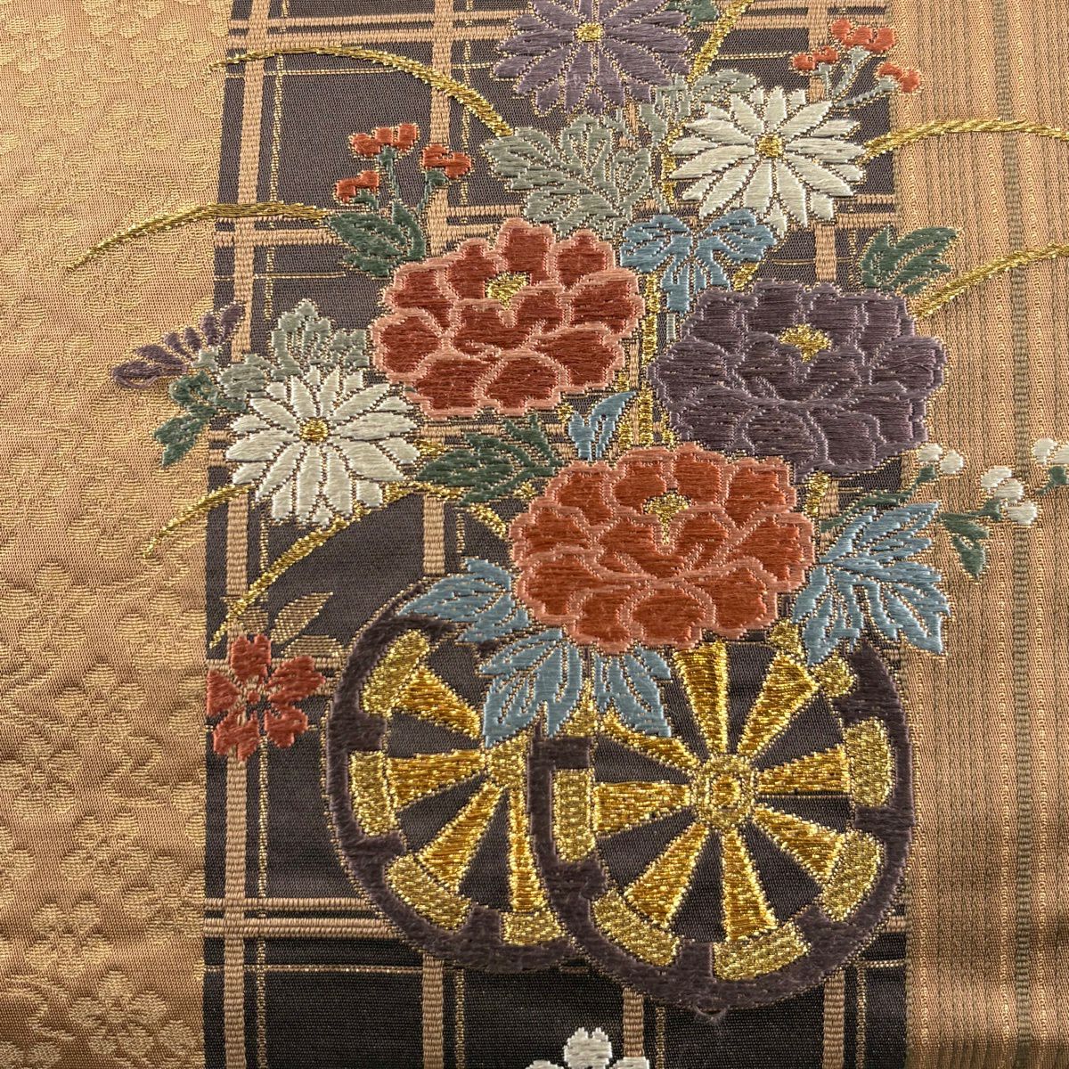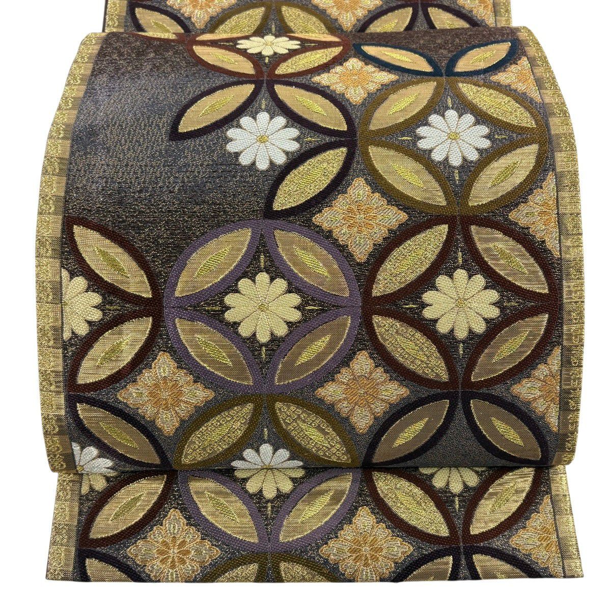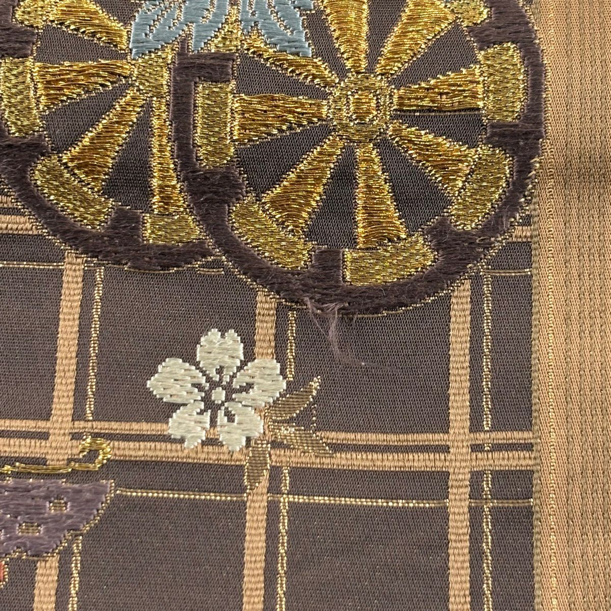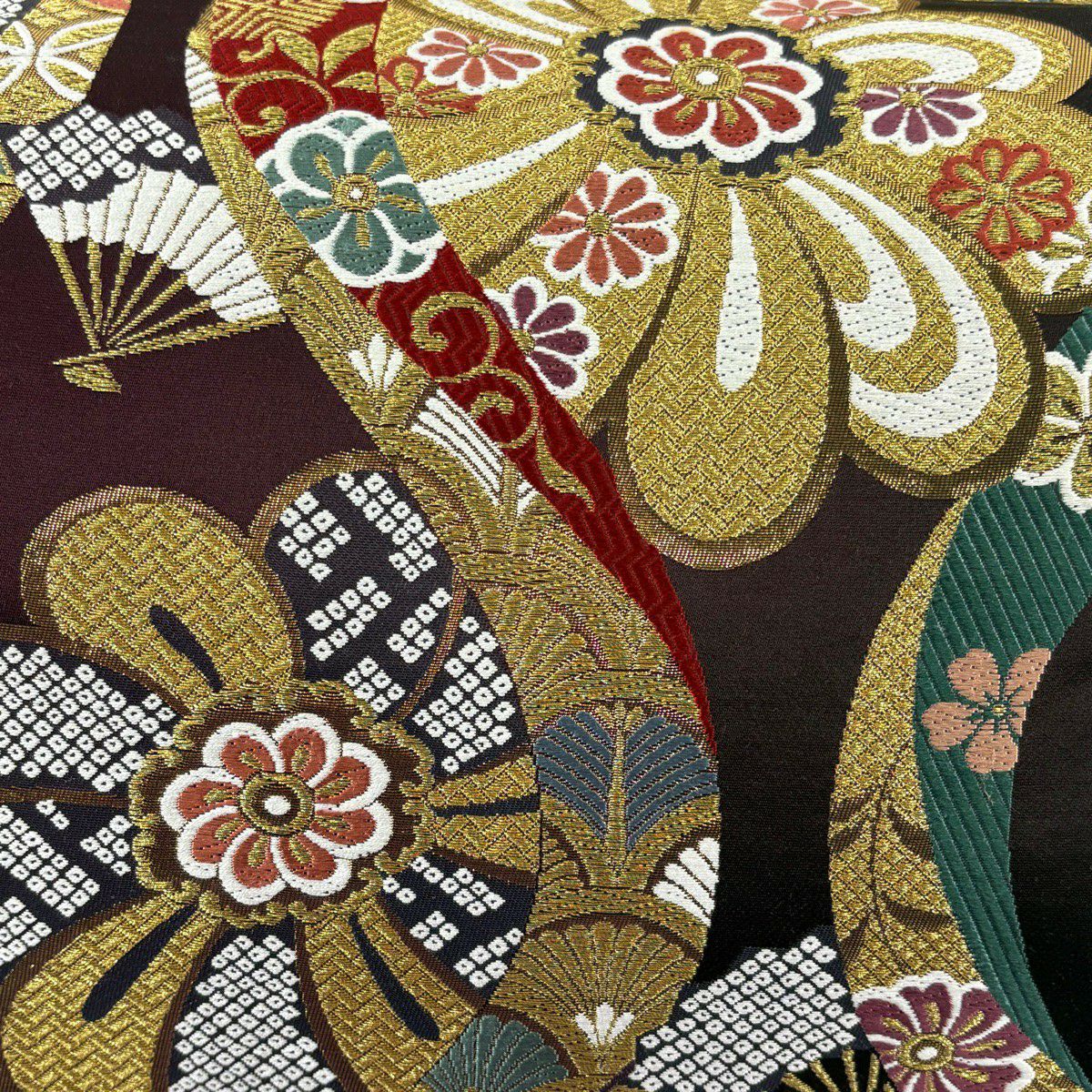 【美品】 袋帯 秀品 関西仕立て 扇 草花 箔 唐織 茶色 六通 正絹