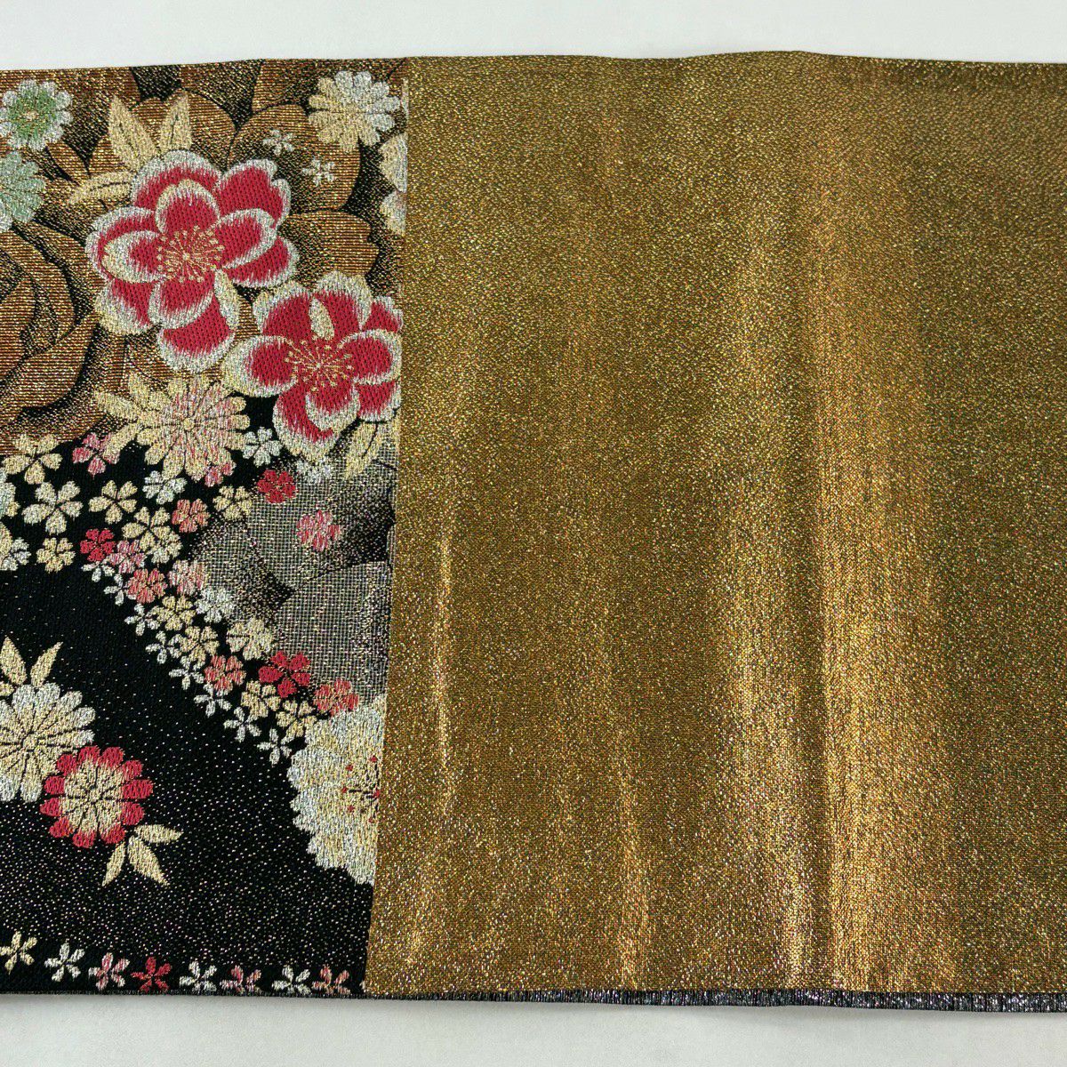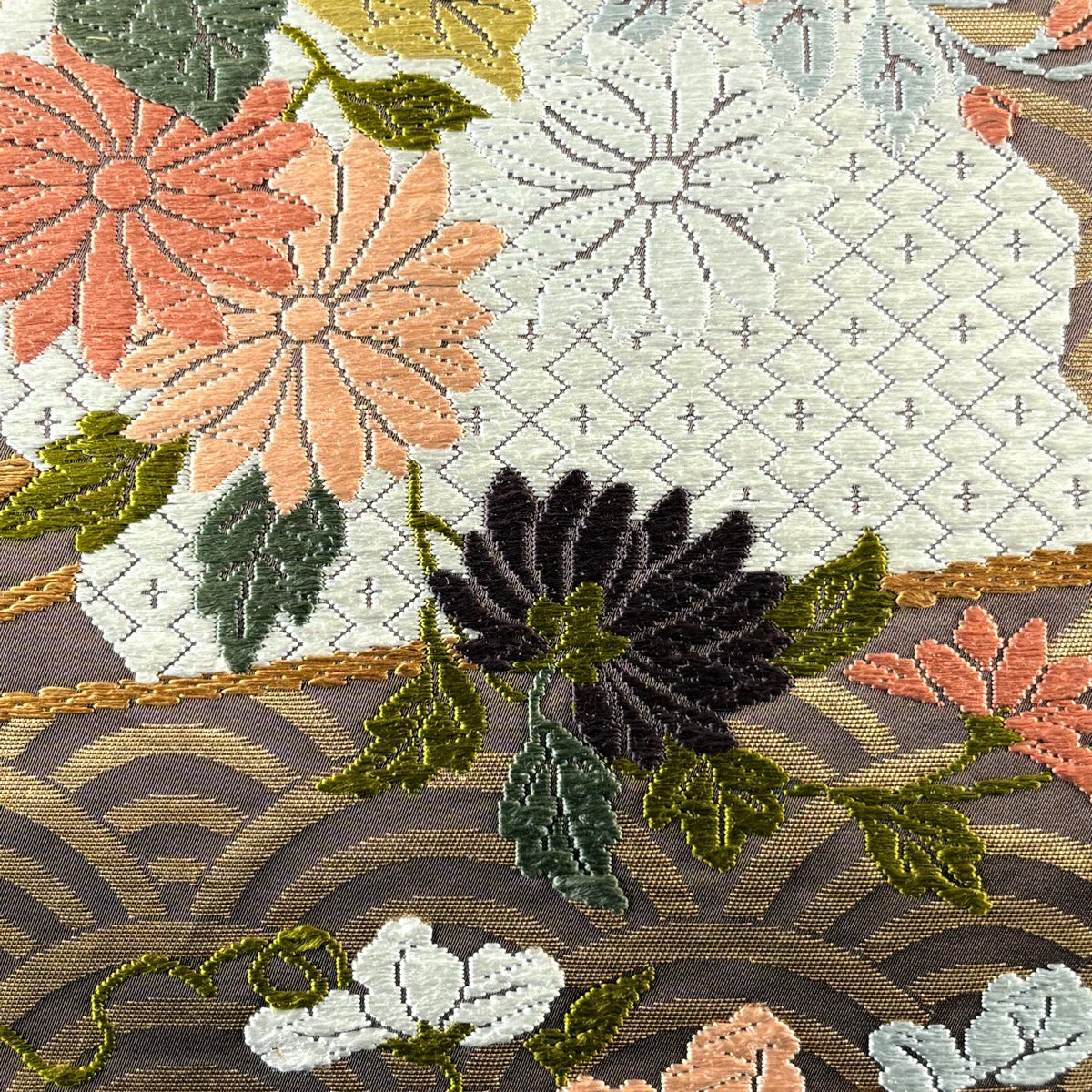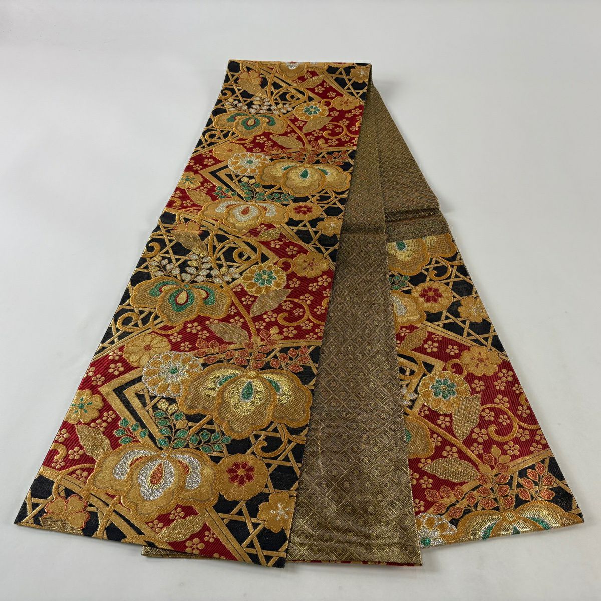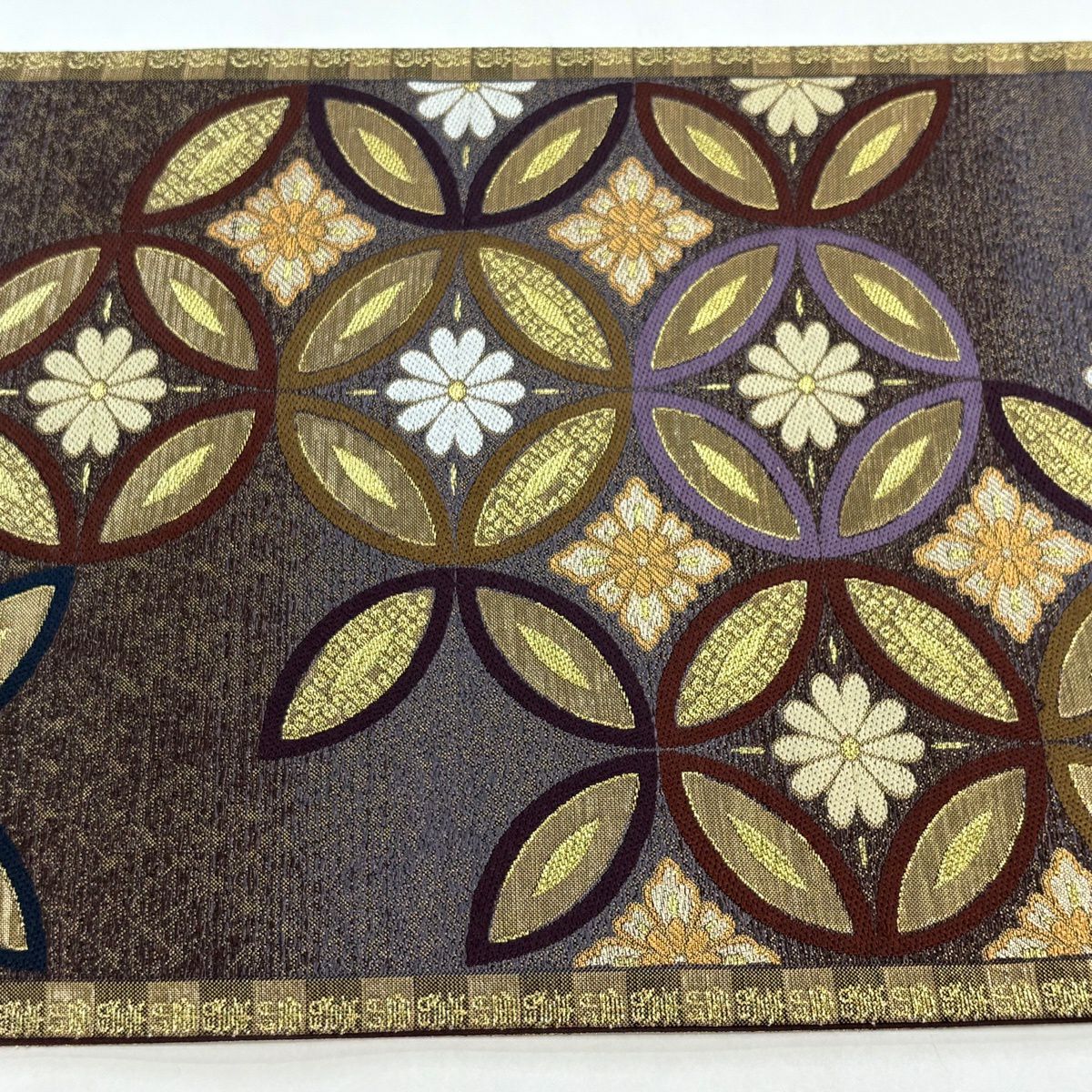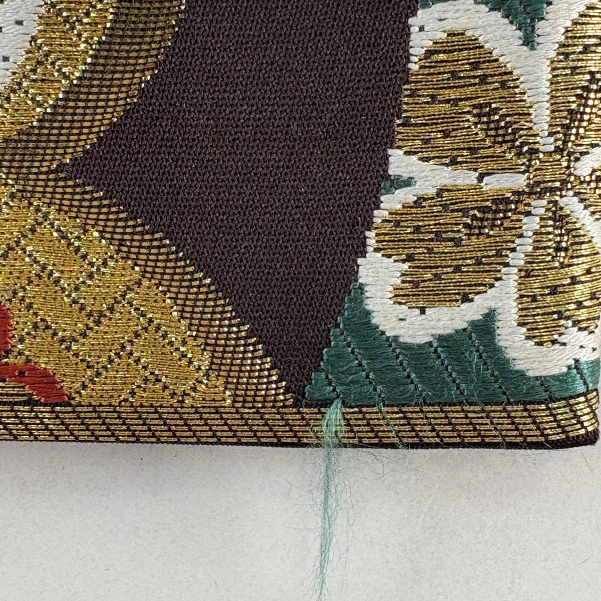 【美品】 袋帯 秀品 関西仕立て 扇 草花 箔 唐織 茶色 六通 正絹