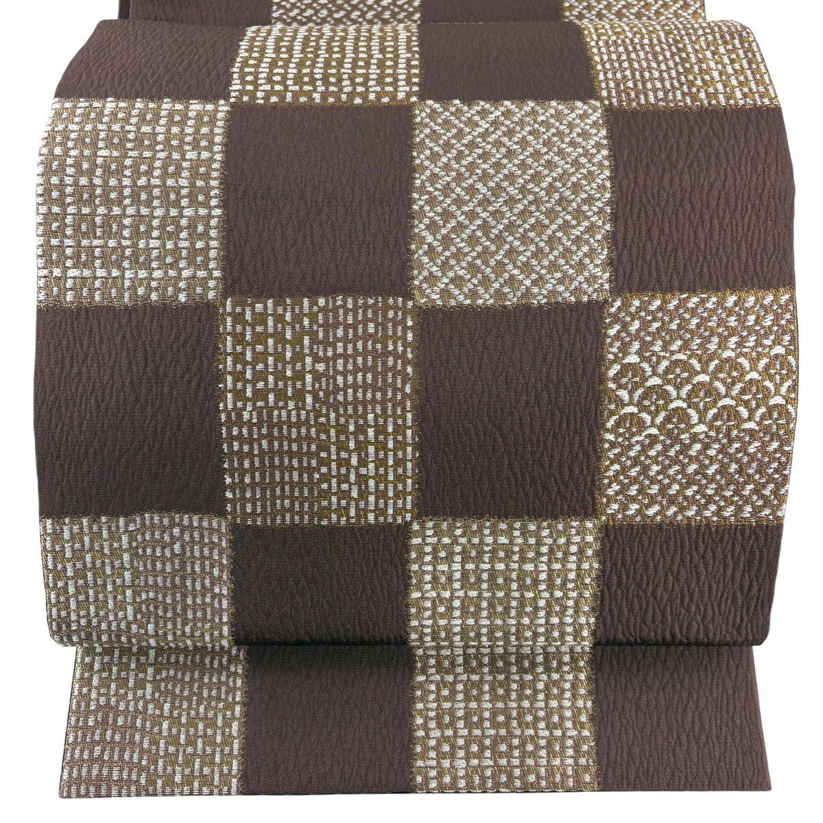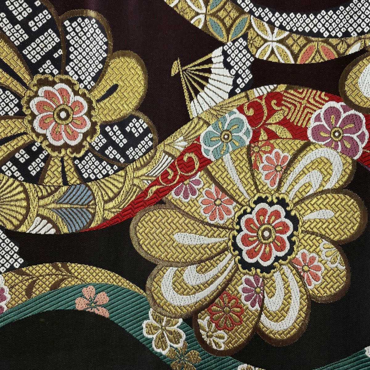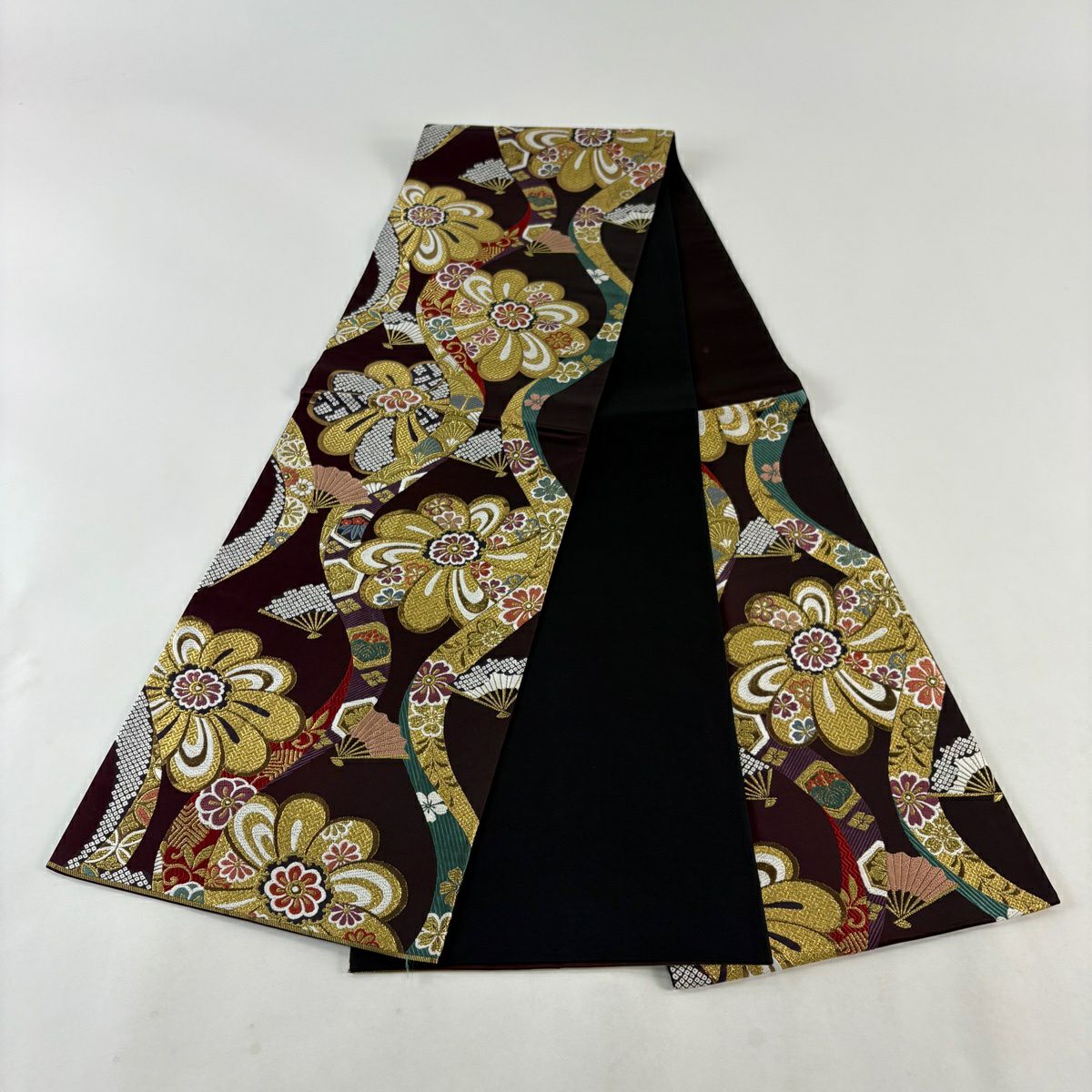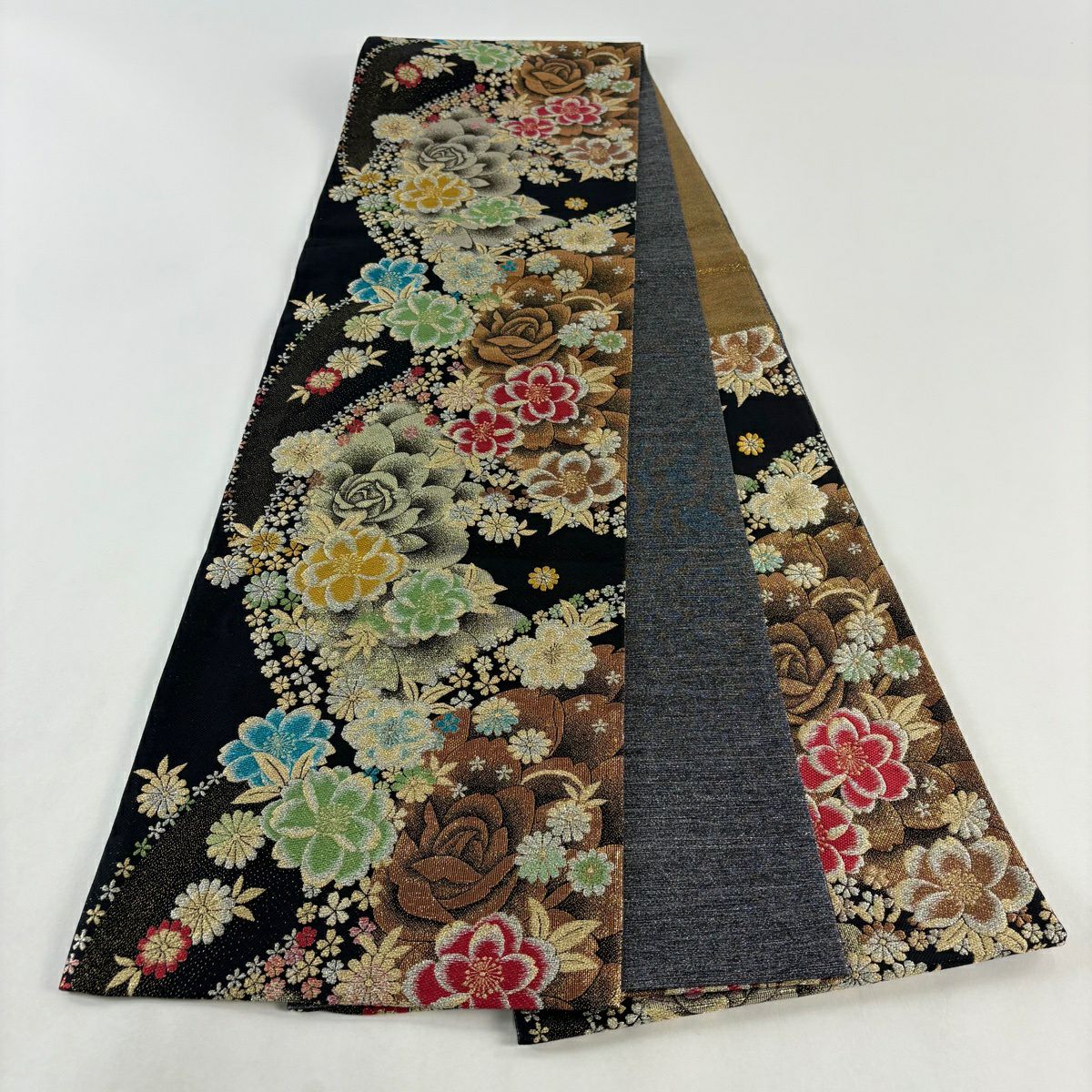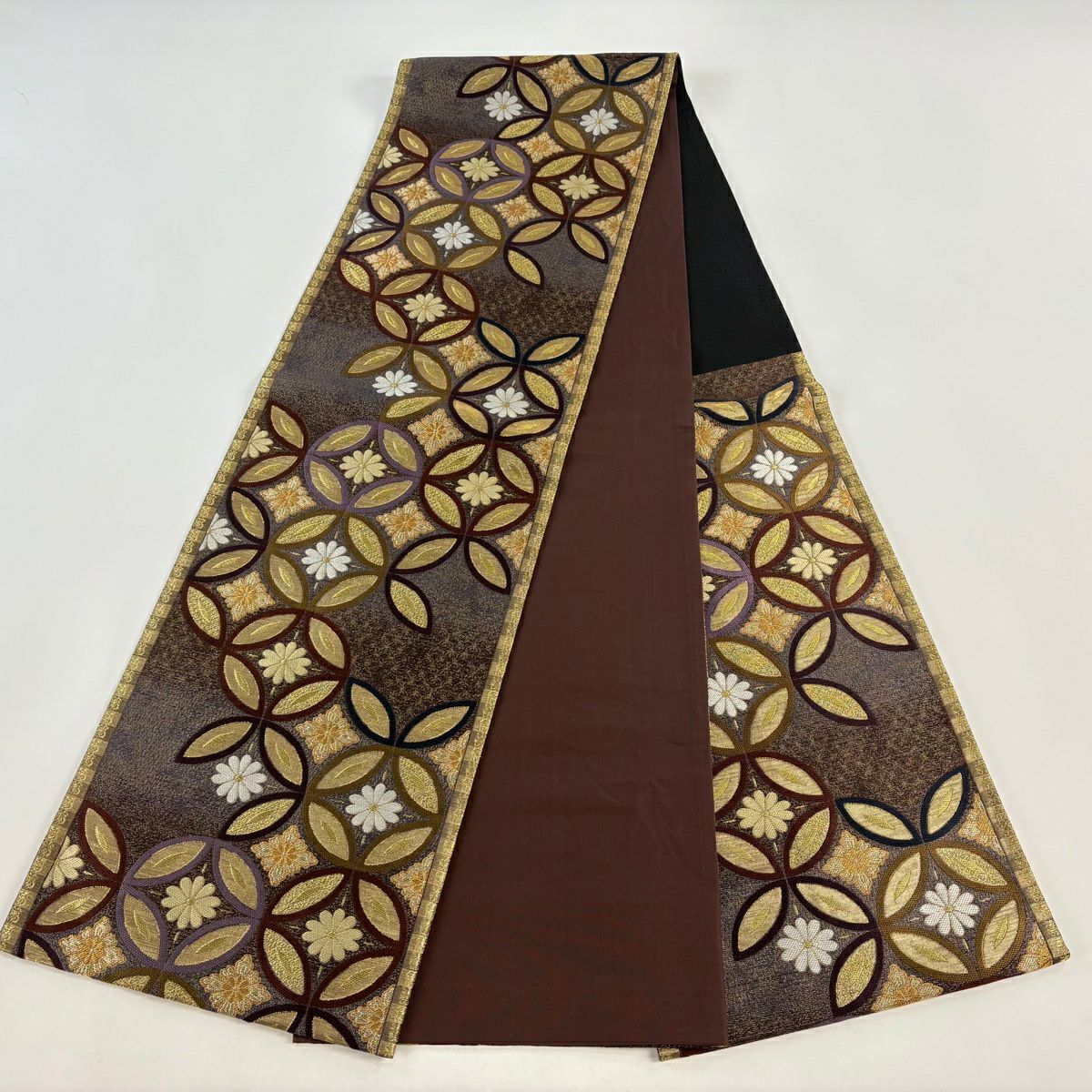【美品】 袋帯 秀品 関西仕立て 扇 草花 箔 唐織 茶色 六通 正絹